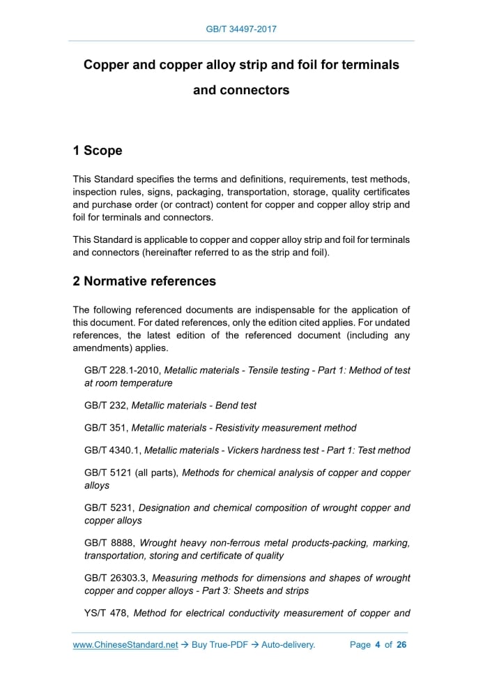Similar standardsGB/T 34497-2017: Copper and copper alloy strip and foil for terminals and connectors---This is an excerpt. Full copy of true-PDF in English version (including equations, symbols, images, flow-chart, tables, and figures etc.), auto-downloaded/delivered in 9 seconds, can be purchased online: https://www.ChineseStandard.net/PDF.aspx/GBT34497-2017GB NATIONAL STANDARD OF THE PEOPLE’S REPUBLIC OF CHINA ICS 77.150.30 H 62 Copper and copper alloy strip and foil for terminals and connectors Issued on: OCTOBER 14, 2017 Implemented on: MAY 01, 2018 Issued by. General Administration of Quality Supervision, Inspection and Quarantine; Standardization Administration of the People's Republic of China. Table of ContentsForeword... 3 1 Scope... 4 2 Normative references... 4 3 Terms and definitions... 5 4 Requirements... 5 5 Test methods... 22 6 Inspection rules... 23 7 Signs, packaging, transportation, storage and quality certificate... 25 8 Purchase order (or contract) content... 26 Copper and copper alloy strip and foil for terminals and connectors1 ScopeThis Standard specifies the terms and definitions, requirements, test methods, inspection rules, signs, packaging, transportation, storage, quality certificates and purchase order (or contract) content for copper and copper alloy strip and foil for terminals and connectors. This Standard is applicable to copper and copper alloy strip and foil for terminals and connectors (hereinafter referred to as the strip and foil).2 Normative referencesThe following referenced documents are indispensable for the application of this document. For dated references, only the edition cited applies. For undated references, the latest edition of the referenced document (including any amendments) applies. GB/T 228.1-2010, Metallic materials - Tensile testing - Part 1.Method of test at room temperature GB/T 232, Metallic materials - Bend test GB/T 351, Metallic materials - Resistivity measurement method GB/T 4340.1, Metallic materials - Vickers hardness test - Part 1.Test method GB/T 5121 (all parts), Methods for chemical analysis of copper and copper alloys GB/T 5231, Designation and chemical composition of wrought copper and copper alloys GB/T 8888, Wrought heavy non-ferrous metal products-packing, marking, transportation, storing and certificate of quality GB/T 26303.3, Measuring methods for dimensions and shapes of wrought copper and copper alloys - Part 3.Sheets and strips YS/T 478, Method for electrical conductivity measurement of copper and copper alloys by use of eddy current YS/T 482, Methods for analysis of copper and copper alloys - The atomic emission spectrometry YS/T 483, Methods for analysis of copper and copper alloys - X-Ray fluorescence spectrometric (wavelength dispersive) YS/T 668, Sampling method of physical and chemical testing for copper and copper alloys YS/T 815, Preparation Method of Test Pieces for Mechanical and Technological Properties of Copper and Copper Alloys3 Terms and definitionsFor the purposes of this document, the following terms and definitions apply. 3.1 sheet shape The presence and degree of wave or buckling of the strip and foil.4 Requirements4.1 Product classification 4.1.1 Designations, states and specifications The designations, states and specifications of the strip and foil shall comply with the provisions of Table 1. The surface of the strip and foil shall be smooth and clean. There shall be no defects that affect the use.5 Test methods5.1 Chemical composition The analysis of the chemical composition of the strip and foil is carried out according to the regulations of GB/T 5121 (all parts) or YS/T 482 or YS/T 483. The arbitration shall be conducted in accordance with the provisions of GB/T 5121 (all parts). 5.2 Dimensions and allowable deviation 5.2.1 The thickness and allowable deviation, width and allowable deviation of the strip and foil, side curvature, burr, longitudinal curl, and twist are tested in accordance with the provisions of GB/T 26303.3. 5.2.2 The sheet shape detection method for the strip and foil is cutting method. Slit the strip and foil with a unit length of 1m into 10mm wide strips evenly along the longitudinal direction. After slitting, each strip in the width direction will lose its restraint and recover elastically. It is manifested as elongation or contraction. Its longitudinal length will no longer be the same. Multiply the ratio of the difference between the longest bar and the shortest bar to the unit length by 105, and it shall be the sheet shape of the strip and foil, as shown in Figure 2. Calculate according to formula (1). Figure 2 -- Schematic diagram of the elastic recovery of each slit after slitting in the width direction where, I - sheet shape of the strip and foil, in millimeters per millimeter (mm/mm), expressed as (I-unit); ΔL - difference between the longest longitudinal slitting length and the shortest longitudinal slitting length of the foil along the width direction, in millimeters (mm); L' - Longest longitudinal slitting length with the strip and foil, in millimeters (mm); L'' - Shortest longitudinal slitting length with the strip and foil, in millimeters (mm); L - Specified unit length of the strip and foil, in millimeters (mm). 5.3 Mechanical properties The tensile test of the strip and foil is carried out according to the regulations of GB/T 228.1-2010.The specimen number is P02 or P04 in Table B.1 of Annex B of GB/T 228.1-2010.The Vickers hardness test of strip foil is carried out in accordance with the provisions of GB/T 4340.1. 5.4 Bending test The bending test of the strip and foil is carried out in accordance with the provisions of GB/T 232. 5.5 Electrical properties The electrical performance test of the strip and foil shall be carried out in accordance with the provisions of YS/T 478 or GB/T 351. 5.6 Bending stress relaxation test The test method for bending stress relaxation of the strip and foil shall be negotiated and determined by the supplier and th