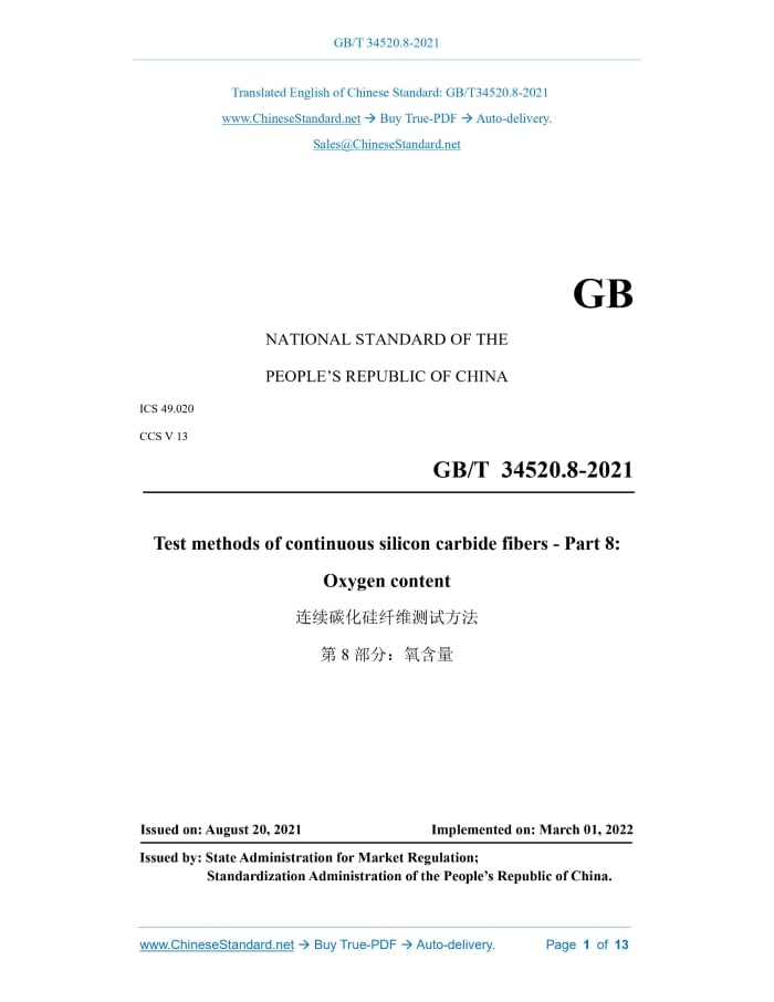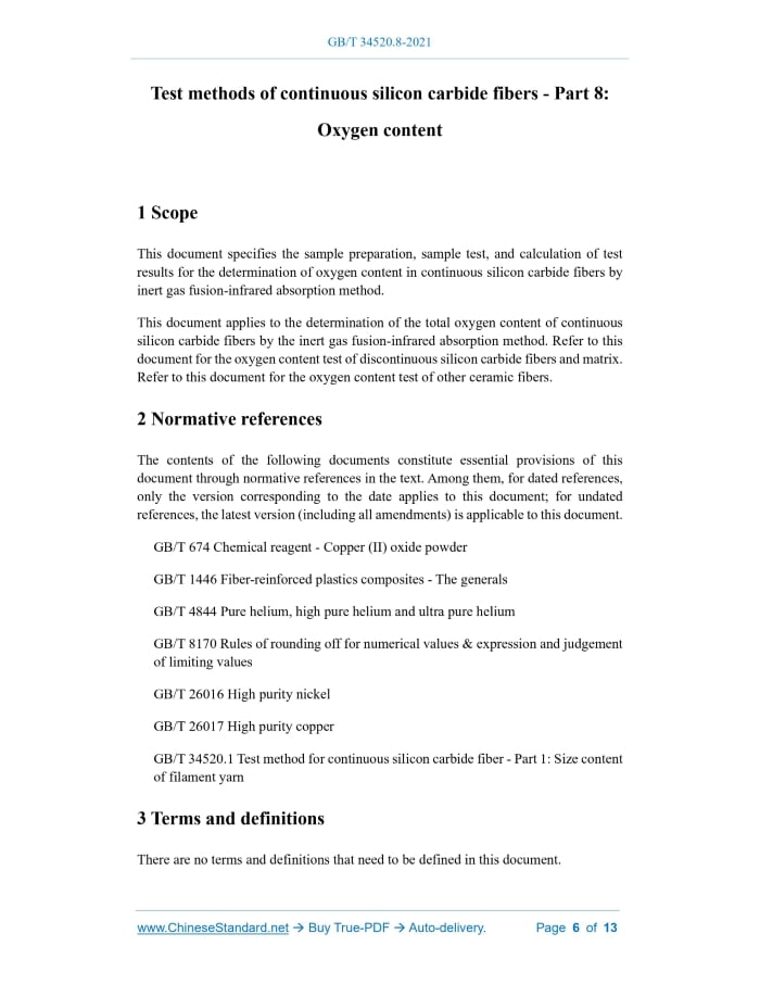 GB/T 34520.8-2021: Test methods of continuous silicon carbide fibers - Part 8: Oxygen content Delivery: 9 seconds. True-PDF full-copy in English & invoice will be downloaded + auto-delivered via email. See step-by-step procedure Status: Valid