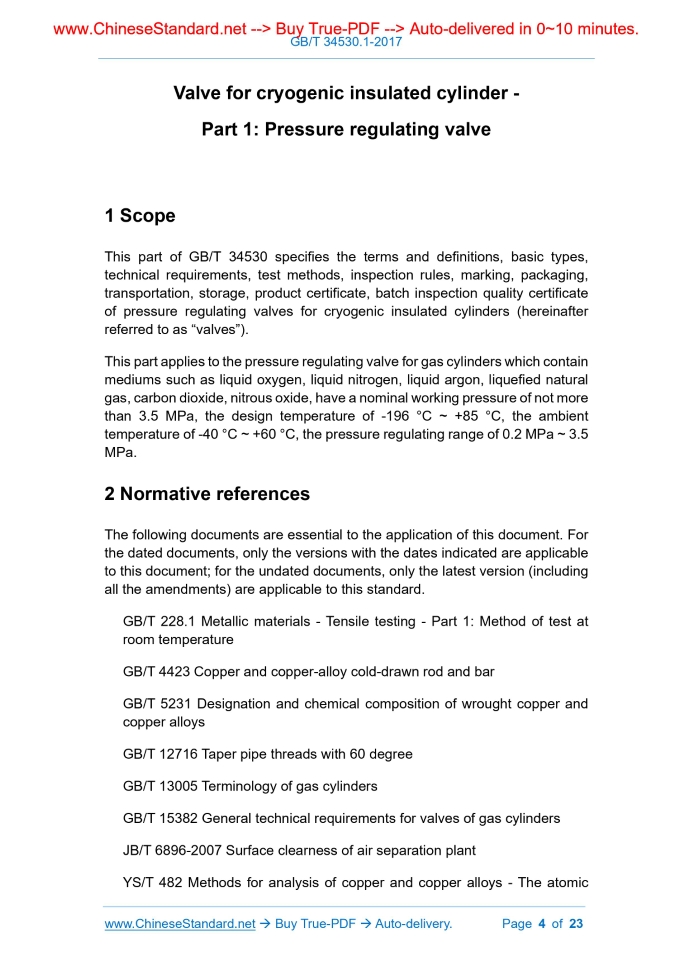 Similar standardsGB/T 34530.1-2017: Valve for cryogenic insulated cylinder - Part 1: Pressure regulating valve---This is an excerpt. Full copy of true-PDF in English version (including equations, symbols, images, flow-chart, tables, and figures etc.), auto-downloaded/delivered in 9 seconds, can be purchased online: https://www.ChineseStandard.net/PDF.aspx/GBT34530.1-2017NATIONAL STANDARD OF THE PEOPLE’S REPUBLIC OF CHINA ICS 23.020.30 J 74 Valve for cryogenic insulated cylinder - Part 1: Pressure regulating valve ISSUED ON: DECEMBER 29, 2017 IMPLEMENTED ON: JULY 01, 2018 Issued by: General Administration of Quality Supervision, Inspection and Quarantine of PRC; Standardization Administration of PRC. Table of ContentsForeword ... 3 1 Scope ... 4 2 Normative references ... 4 3 Terms and definitions ... 5 4 Basic type ... 6 5 Technical requirements ... 8 6 Test methods ... 12 7 Inspection rules ... 19 8 Marking, packaging, transportation, storage ... 22 9 Product certificate, quality certificate of product batch inspection ... 22 Foreword ... 3 1 Scope ... 4 2 Normative references ... 4 3 Terms and definitions ... 5 4 Basic type ... 6 5 Technical requirements ... 8 6 Test methods ... 12 7 Inspection rules ... 19 8 Marking, packaging, transportation, storage ... 22 9 Product certificate, quality certificate of product batch inspection ... 22 Valve for cryogenic insulated cylinder - Part 1: Pressure regulating valve1 ScopeThis part of GB/T 34530 specifies the terms and definitions, basic types, technical requirements, test methods, inspection rules, marking, packaging, transportation, storage, product certificate, batch inspection quality certificate of pressure regulating valves for cryogenic insulated cylinders (hereinafter referred to as “valves”). This part applies to the pressure regulating valve for gas cylinders which contain mediums such as liquid oxygen, liquid nitrogen, liquid argon, liquefied natural gas, carbon dioxide, nitrous oxide, have a nominal working pressure of not more than 3.5 MPa, the design temperature of -196 °C ~ +85 °C, the ambient temperature of -40 °C ~ +60 °C, the pressure regulating range of 0.2 MPa ~ 3.5 MPa.2 Normative referencesThe following documents are essential to the application of this document. For the dated documents, only the versions with the dates indicated are applicable to this document; for the undated documents, only the latest version (including all the amendments) are applicable to this standard. GB/T 228.1 Metallic materials - Tensile testing - Part 1: Method of test at room temperature GB/T 4423 Copper and copper-alloy cold-drawn rod and bar GB/T 5231 Designation and chemical composition of wrought copper and copper alloys GB/T 12716 Taper pipe threads with 60 degree GB/T 13005 Terminology of gas cylinders GB/T 15382 General technical requirements for valves of gas cylinders JB/T 6896-2007 Surface clearness of air separation plant YS/T 482 Methods for analysis of copper and copper alloys - The atomic emission spectrometry3 Terms and definitionsThe terms and definitions as defined in GB/T 13005 as well as the following terms and definitions apply to this document. 3.1 Pressure build regulator A valve that vaporizes the liquid in the pressure build line of cylinder, to raise and stabilize the cylinder’s pressure. 3.2 Pressure economizer regulator A valve that makes the cylinder to preferentially use the gas at the top of the liner and maintains stable working pressure of the liner. 3.3 Combination pressure regulator A valve that has both the pressure-increase function and the pressure- reduction function. 3.4 Pressure build inlet The inlet of the pressure build regulator and the combination pressure regulator, which is connected to the pressure build line of the cylinder. Note: The pressure build inlet is identified by PB IN. 3.5 Pressure build outlet The outlet of the pressure build regulator, which is connected to the gas phase space of the cylinder. Note: pressure build outlet is identified as PB OUT. 3.6 Pressure economizer inlet or oxidizing gas, it should use fluoroplastics. 5.1.2 Valve material The valve material should adopt HPb59-1 lead brass. Its mechanical properties and chemical composition shall meet the requirements of GB/T 4423 and GB/T 5231. When using other materials, the mechanical properties shall not be lower than the requirements of HPb59-1. 5.1.3 Non-metallic sealing materials 5.1.3.1 Resistance to oxygen-aging After being continuously placed in an oxygen (purity ≥ 99.5%) which has a temperature of 70 °C ± 2 °C and a pressure of 2 MPa for 96 hours, when checking in a magnifying glass of 25x, there shall be no crack. 5.1.3.2 Compatibility of liquefied natural gas medium For the non-metallic sealing material for liquefied natural gas medium, immerse it in n-pentane at a temperature of 25 °C ± 3 °C for 72 h; the volume change rate shall be not more than 20%. Then place it in air at 40 °C ± 3 °C for 48 h, the mass change rate shall be not more than 5%. 5.2 Design and process requirements 5.2.1 Valves and cylinders shall be thread-connected. The thread’s size should be NPT 1/4. The thread’s precision shall meet the requirements of GB/T 12716. 5.2.2 The valve shall, according to the working pressure of the cylinder, be pre- adjusted to a set pressure value. It shall also mark the set pressure value and pressure regulating range on the valve. 5.2.3 The joints of the valve shall be permanently marked by abbreviated markings. 5.2.4 The valve shall be so designed that the rotation of regulating screw clockwise will increase the set pressure, otherwise it will reduce the set pressure. Meanwhile it shall have a locking device. 5.2.5 It shall, according to the thermal expansion coefficient of the material, set the clearance of the moving parts, to ensure that the moving parts are able to move flexibly within the design temperature range. 5.2.6 The upper part of the bonnet shall have a venting hole, to keep 