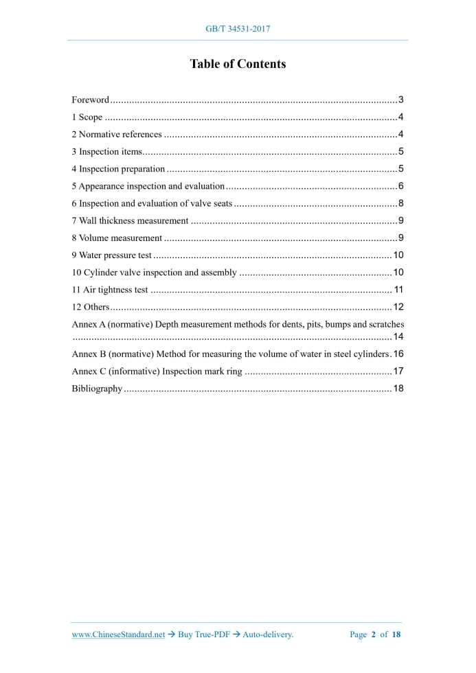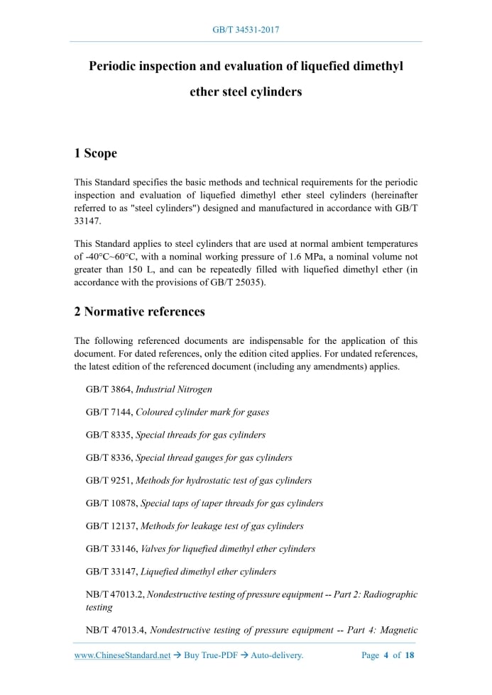 Similar standardsGB/T 34531-2017: Periodic inspection and evaluation of liquefied dimethyl ether steel cylinders---This is an excerpt. Full copy of true-PDF in English version (including equations, symbols, images, flow-chart, tables, and figures etc.), auto-downloaded/delivered in 9 seconds, can be purchased online: https://www.ChineseStandard.net/PDF.aspx/GBT34531-2017GB NATIONAL STANDARD OF THE PEOPLE’S REPUBLIC OF CHINA ICS 23.020.30 J 74 Periodic inspection and evaluation of liquefied dimethyl ether steel cylinders Issued on: OCTOBER 14, 2017 Implemented on: MAY 01, 2018 Issued by. General Administration of Quality Supervision, Inspection and Quarantine of the People's Republic of Chin; Standardization Administration of the People's Republic of China. Table of ContentsForeword... 3 1 Scope... 4 2 Normative references... 4 3 Inspection items... 5 4 Inspection preparation... 5 5 Appearance inspection and evaluation... 6 6 Inspection and evaluation of valve seats... 8 7 Wall thickness measurement... 9 8 Volume measurement... 9 9 Water pressure test... 10 10 Cylinder valve inspection and assembly... 10 11 Air tightness test... 11 12 Others... 12 Annex A (normative) Depth measurement methods for dents, pits, bumps and scratches ... 14 Annex B (normative) Method for measuring the volume of water in steel cylinders. 16 Annex C (informative) Inspection mark ring... 17 Bibliography... 18 Periodic inspection and evaluation of liquefied dimethyl ether steel cylinders1 ScopeThis Standard specifies the basic methods and technical requirements for the periodic inspection and evaluation of liquefied dimethyl ether steel cylinders (hereinafter referred to as "steel cylinders") designed and manufactured in accordance with GB/T 33147. This Standard applies to steel cylinders that are used at normal ambient temperatures of -40°C~60°C, with a nominal working pressure of 1.6 MPa, a nominal volume not greater than 150 L, and can be repeatedly filled with liquefied dimethyl ether (in accordance with the provisions of GB/T 25035).2 Normative referencesThe following referenced documents are indispensable for the application of this document. For dated references, only the edition cited applies. For undated references, the latest edition of the referenced document (including any amendments) applies. GB/T 3864, Industrial Nitrogen GB/T 7144, Coloured cylinder mark for gases GB/T 8335, Special threads for gas cylinders GB/T 8336, Special thread gauges for gas cylinders GB/T 9251, Methods for hydrostatic test of gas cylinders GB/T 10878, Special taps of taper threads for gas cylinders GB/T 12137, Methods for leakage test of gas cylinders GB/T 33146, Valves for liquefied dimethyl ether cylinders GB/T 33147, Liquefied dimethyl ether cylinders NB/T 47013.2, Nondestructive testing of pressure equipment -- Part 2.Radiographic testing NB/T 47013.4, Nondestructive testing of pressure equipment -- Part 4.Magnetic particle testing NB/T 47013.5, Nondestructive Testing of Pressure Equipment -- Part 5.Penetrant Testing TSG R0006-2014, Supervision regulation on safety technology for gas cylinder3 Inspection itemsThe regular inspection items of steel cylinders include. appearance inspection, valve seat inspection, wall thickness measurement, cylinder valve inspection, water pressure test, and air tightness test. After the appearance inspection, if there is any doubt about the volume of the steel cylinder, the volume shall be measured.4 Inspection preparation4.1 Records 4.1.1 Check and record the manufacturing mark and inspection mark of each cylinder. The record shall at least include the manufacturer code or manufacturing license number, cylinder number, manufacturing year and month, filling medium, nominal working pressure, water pressure test pressure, cylinder weight, nominal volume, cylinder design wall thickness, design service life, last inspection date (year, month) and inspection agency code. 4.1.2 For steel cylinders produced by manufacturers that have not obtained a special equipment manufacturing license, steel cylinders with unclear manufacturing marks or incomplete items and no traceable evidence, and steel cylinders that are prohibited from being used according to regulations of the special equipment safety supervision and management department, they will not be inspected after recording and will be treated as scrapped. 4.1.3 Cylinders that exceed their designed service life from the date of manufacture indicated by the steel stamp shall be recorded and not inspected and shall be treated as scrapped. 4.1.4 For cylinders that are determined to be unusable and cylinders whose steel stamp marking media do not match, they will be recorded and not inspected and will be scrapped. 4.2 Treatment of residual gas in the cylinder 4.2.1 Before inspecting the cylinders, appropriate methods shall be used to recover the residual gas in each cylinder, under the premise of ensuring no leakage, no pollution to the environment, and no impact on the health of operators. For cylinders whose valves cannot be opened and cannot be proved to have residual pressure, they shall be stored separately from the cylinders to be inspected. They shall be marked for proper disposal. The residual gas in the cylinders that are scrapped after appearance inspection shall also be recovered one by one. 4.2.2 The residual gas in the cylinder shall be handled internally in a way that does not damage the cylinder material or reduce the performance of the cylinder material. 4.2.3 After the cylinders are recovered and treated, the residual gas concentration is measured with a combustible gas detection instrument. For cylinders with a concentration higher than 0.4% (volume fraction), the residual gas in the cylinders shall be re-processed. 4.3 Disassembly of cylinder valve and cleaning of cylinder surface 4.3.1 When the pressure inside the cylinder is confirmed to be consistent with the atmospheric pressure, remove the cylinder valve using an instrumen