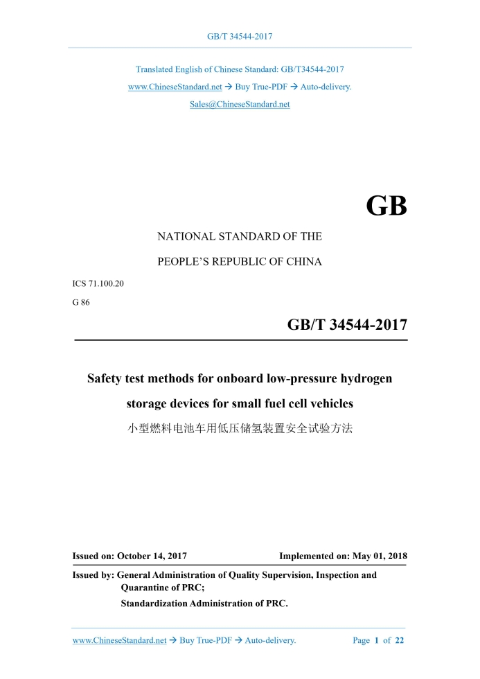 GB/T 34544-2017: Safety test methods for onboard low pressure hydrogen storage devices for small fuel cell vehicles Delivery: 9 seconds. True-PDF full-copy in English & invoice will be downloaded + auto-delivered via email. See step-by-step procedure Status: Valid