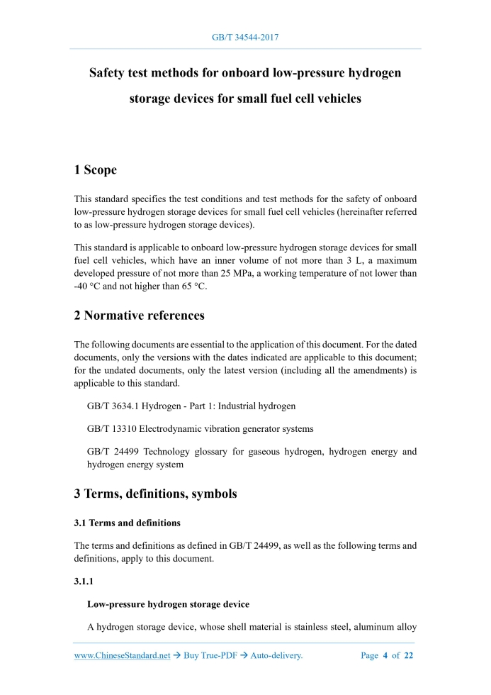 Similar standardsGB/T 34544-2017: Safety test methods for onboard low pressure hydrogen storage devices for small fuel cell vehicles---This is an excerpt. Full copy of true-PDF in English version (including equations, symbols, images, flow-chart, tables, and figures etc.), auto-downloaded/delivered in 9 seconds, can be purchased online: https://www.ChineseStandard.net/PDF.aspx/GBT34544-2017 NATIONAL STANDARD OF THE PEOPLE’S REPUBLIC OF CHINA ICS 71.100.20 G 86 Safety test methods for onboard low-pressure hydrogen storage devices for small fuel cell vehicles ISSUED ON: OCTOBER 14, 2017 IMPLEMENTED ON: MAY 01, 2018 Issued by: General Administration of Quality Supervision, Inspection and Quarantine of PRC; Standardization Administration of PRC. Table of ContentsForeword ... 3 1 Scope ... 4 2 Normative references ... 4 3 Terms, definitions, symbols ... 4 4 Test conditions ... 6 5 Test methods ... 7 Appendix A (Normative) The method of determining the growth trend of the measured maximum strain ... 22 Safety test methods for onboard low-pressure hydrogen storage devices for small fuel cell vehicles1 ScopeThis standard specifies the test conditions and test methods for the safety of onboard low-pressure hydrogen storage devices for small fuel cell vehicles (hereinafter referred to as low-pressure hydrogen storage devices). This standard is applicable to onboard low-pressure hydrogen storage devices for small fuel cell vehicles, which have an inner volume of not more than 3 L, a maximum developed pressure of not more than 25 MPa, a working temperature of not lower than -40 °C and not higher than 65 °C.2 Normative referencesThe following documents are essential to the application of this document. For the dated documents, only the versions with the dates indicated are applicable to this document; for the undated documents, only the latest version (including all the amendments) is applicable to this standard. GB/T 3634.1 Hydrogen - Part 1: Industrial hydrogen GB/T 13310 Electrodynamic vibration generator systems GB/T 24499 Technology glossary for gaseous hydrogen, hydrogen energy and hydrogen energy system3 Terms, definitions, symbols3.1 Terms and definitions The terms and definitions as defined in GB/T 24499, as well as the following terms and definitions, apply to this document. 3.1.1 Low-pressure hydrogen storage device A hydrogen storage device, whose shell material is stainless steel, aluminum alloy 5.1.2.1 When using the helium mass spectrometer leak detection method, to conduct the air tightness test, the following test procedures shall be followed: a) Fill the low-pressure hydrogen storage device with helium gas, to the highest developed pressure, at room temperature; place it in a vacuum box; b) After connecting the helium mass spectrometer to the vacuum box, vacuum the vacuum box, to make the vacuum degree lower than 2 Pa; c) Let it stand at room temperature for more than 30 minutes; read the vacuum degree and leak rate data of the helium mass spectrometer. 5.1.2.2 When using the special leak detection method or the hydrogen sensor leak detector leak detection method, to conduct the air tightness test, the following test procedures shall be carried out: a) Fill the low-pressure hydrogen storage device with hydrogen, to the highest developed pressure, at room temperature; b) Use a special leak detection liquid or a hydrogen sensor leak detector, to carry out the leak detection of the low-pressure hydrogen storage device, once every 15 minutes, at room temperature; the number of leak detections is not less than twice; c) Observe and record the presence or absence of bubbles, the location of bubbles or the number indicated by the hydrogen sensor leak detector. 5.1.3 Qualification indicators 5.1.3.1 When using helium gas mass spectrometer leak detection method, the leak rate shall not exceed 7.6 x 10-5 Pa·m3/s (temperature is 20 °C). 5.1.3.2 When using the leak detection method by hydrogen sensor leak detector, the leak detector has no indication. 5.1.3.3 When using the liquid leak detection method by special leak detector, for leak detection, no bubbles are generated. 5.2 Drop test 5.2.1 Test requirements 5.2.1.1 Drop test is performed on three low-pressure hydrogen storage devices, which are charged with hydrogen to the rated hydrogen charging pressure, in a manner specified by the manufacturer. 5.2.1.2 The low-pressure hydrogen storage device shall be equipped with shut-off valves, overpressure relief devices and other components, BUT shall not have any other protective devices. 5.2.1.3 The drop test is carried out at room temperature. The impact bench shall be a concrete or steel level surface, which shall not move during the test; it shall have a large enough area, to ensure that the low-pressure hydrogen storage device completely falls on the impact table. 5.2.1.4 During the lifting or lowering process of the lifting device, the low-pressure hydrogen storage device shall not be damaged; when the release device releases the low-pressure hydrogen storage device, it shall be ensured that the low-pressure hydrogen storage device is free to fall. 5.2.1.5 The difference, between the lifting height of the low-pressure hydrogen storage device and the predetermined height, shall not exceed ±2% of the predetermined height. 5.2.2 Test procedure 5.2.2.1 After the low-pressure hydrogen storage device is raised to the predetermined height, it shall be fixed by the release device, according to the predetermined state. 5.2.2.2 Release the low-pressure hydrogen storage device, according to the following predetermined states: a) When the end of the low-pressure hydrogen storage device, which has the shut- off valve and the overpressure relief device, falls vertically downward, the height of the lowest point of its initial position shall not be less than 1.8 m. b) When the low-pressure hydrogen storage device falls at an angle of 45°, between its axial direction and the horizontal plane, the hei