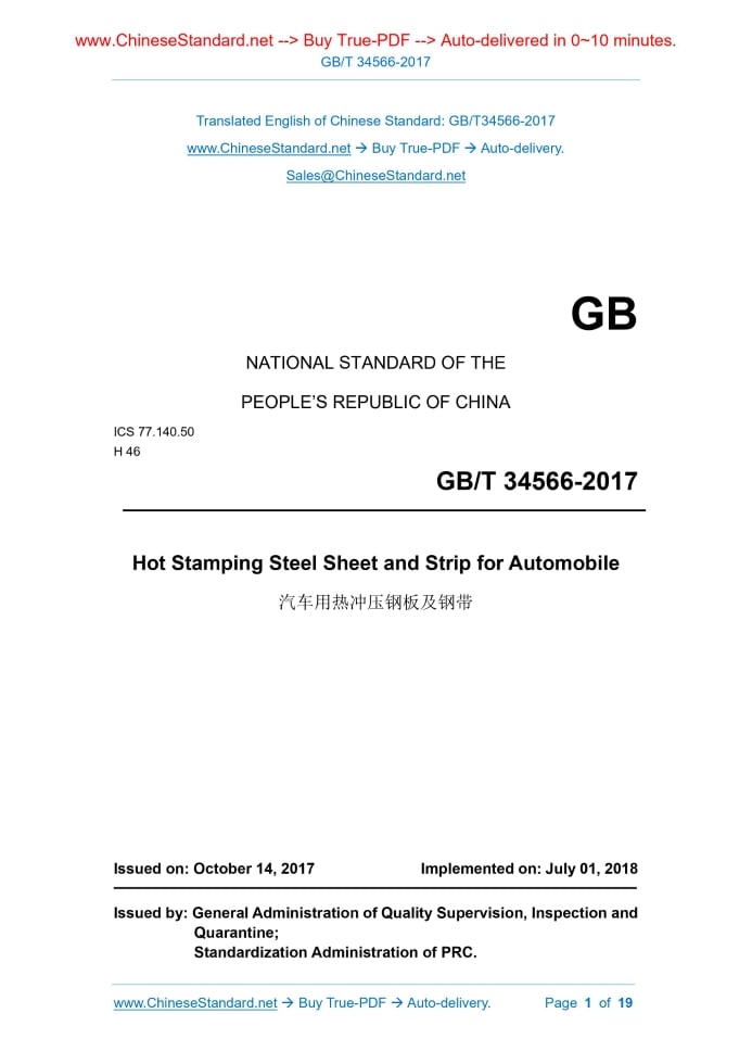 GB NATIONAL STANDARD OF THE PEOPLE’S REPUBLIC OF CHINA ICS 77.140.50 H 46 Hot Stamping Steel Sheet and Strip for Automobile Issued on: OCTOBER 14, 2017 Implemented on: JULY 01, 2018 Issued by. General Administration of Quality Supervision, Inspection and Quarantine; Standardization Administration of PRC.