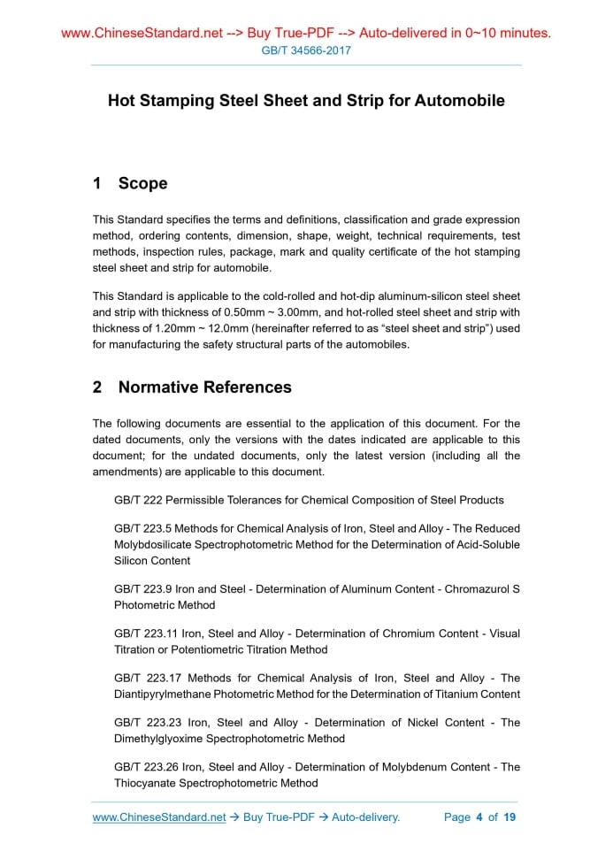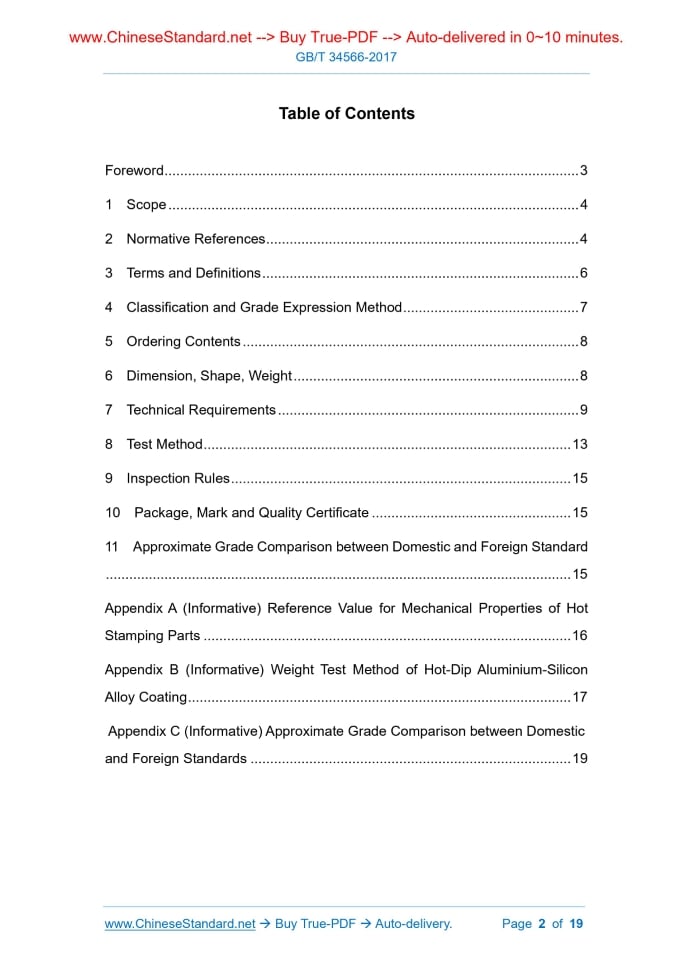 Foreword ... 3 1 Scope ... 4 2 Normative References ... 4 3 Terms and Definitions ... 6 4 Classification and Grade Expression Method ... 7 5 Ordering Contents ... 8 6 Dimension, Shape, Weight ... 8 7 Technical Requirements ... 9 8 Test Method ... 13 9 Inspection Rules ... 15 10 Package, Mark and Quality Certificate ... 15 11 Approximate Grade Comparison between Domestic and Foreign Standard ... 15 Appendix A (Informative) Reference Value for Mechanical Properties of Hot Stamping Parts ... 16 Appendix B (Informative) Weight Test Method of Hot-Dip Aluminium-Silicon Alloy Coating ... 17 Appendix C (Informative) Approximate Grade Comparison between Domestic and Foreign Standards ... 19 Hot Stamping Steel Sheet and Strip for Automobile