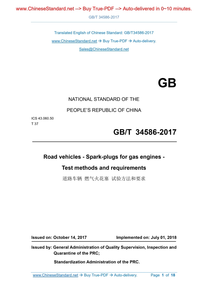 GB/T 34586-2017: Road vehicles - Spark-plugs for gas engines - Test methods and requirements Delivery: 9 seconds. True-PDF full-copy in English & invoice will be downloaded + auto-delivered via email. See step-by-step procedure Status: Valid