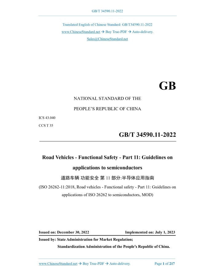 GB/T 34590.11-2022: Road vehicles - Functional safety - Part 11: Guidelines on applications to semiconductors Delivery: 9 seconds. True-PDF full-copy in English & invoice will be downloaded + auto-delivered via email. See step-by-step procedure Status: Valid