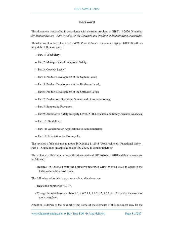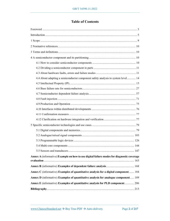 Similar standardsGB/T 34590.11-2022: Road vehicles - Functional safety - Part 11: Guidelines on applications to semiconductors---This is an excerpt. Full copy of true-PDF in English version (including equations, symbols, images, flow-chart, tables, and figures etc.), auto-downloaded/delivered in 9 seconds, can be purchased online: https://www.ChineseStandard.net/PDF.aspx/GBT34590.11-2022 GB NATIONAL STANDARD OF THE PEOPLE’S REPUBLIC OF CHINA ICS 43.040 CCS T 35 Road Vehicles - Functional Safety - Part 11.Guidelines on applications to semiconductors (ISO 26262-11.2018, Road vehicles - Functional safety - Part 11.Guidelines on applications of ISO 26262 to semiconductors, MOD) Issued on. DECEMBER 30, 2022 Implemented on. JULY 1, 2023 Issued by. State Administration for Market Regulation; Standardization Administration of the People’s Republic of China. Table of ContentsForeword... 3 Introduction... 5 1 Scope... 9 2 Normative references... 10 3 Terms and definitions... 10 4 A semiconductor component and its partitioning... 10 4.1 How to consider semiconductor components... 10 4.2 Dividing a semiconductor component in parts... 11 4.3 About hardware faults, errors and failure modes... 11 4.4 About adapting a semiconductor component safety analysis to system level... 14 4.5 Intellectual Property (IP)... 15 4.6 Base failure rate for semiconductors... 27 4.7 Semiconductor dependent failure analysis... 57 4.8 Fault injection... 71 4.9 Production and Operation... 75 4.10 Interfaces within distributed developments... 76 4.11 Confirmation measures... 77 4.12 Clarification on hardware integration and verification... 77 5 Specific semiconductor technologies and use cases... 79 5.1 Digital components and memories... 79 5.2 Analogue/mixed signal components... 103 5.3 Programmable logic devices... 126 5.4 Multi-core components... 144 5.5 Sensors and transducers... 147 Annex A (informative) Example on how to use digital failure modes for diagnostic coverage evaluation... 163 Annex B (informative) Examples of dependent failure analysis... 168 Annex C (informative) Examples of quantitative analysis for a digital component... 184 Annex D (informative) Examples of quantitative analysis for analogue component... 189 Annex E (informative) Examples of quantitative analysis for PLD component... 206 Bibliography... 213ForewordThis document was drafted in accordance with the rules provided in GB/T 1.1-2020 Directives for Standardization - Part 1.Rules for the Structure and Drafting of Standardizing Documents. This document is Part 11 of GB/T 34590 Road Vehicles - Functional Safety. GB/T 34590 has issued the following parts. -- Part 1.Vocabulary; -- Part 2.Management of Functional Safety; -- Part 3.Concept Phase; -- Part 4.Product Development at the System Level; -- Part 5.Product Development at the Hardware Level; -- Part 6.Product Development at the Software Level; -- Part 7.Production, Operation, Service and Decommissioning; -- Part 8.Supporting Processes; -- Part 9.Automotive Safety Integrity Level (ASIL)-oriented and Safety-oriented Analyses; -- Part 10.Guideline; -- Part 11.Guidelines on Applications to Semiconductors; -- Part 12.Adaptation for Motorcycles. The revision of this document adopts ISO 26262-11.2018 "Road vehicles - Functional safety - Part 11.Guidelines on applications of ISO 26262 to semiconductors". The technical differences between this document and ISO 26262-11.2018 and their reasons are as follows. - Replace ISO 26262-1 with the normative reference GB/T 34590.1-2022 to adapt to the technical conditions of China. The following editorial changes are made to this document. - Delete the number of "4.1.1"; - Change the sub-clause numbers 4.3, 4.6.2.1.1, 4.6.2.1.2, 5.5.2, A.1.3 to make the structure more complete. Attention is drawn to the possibility that some of the elements of this document may be the subject of patent rights. The issuing authority shall not be held responsible for identifying any or all such patent rights. This document was proposed by the Ministry of Industry and Information Technology of the People's Republic of China. This document shall be under the jurisdiction of National Technical Committee 114 on Auto of Standardization Administration of China (SAC/TC 114). The drafting organizations of this document. China Automotive Technology and Research Center Co., Ltd., Infineon Technologies (China) Co., Ltd., Beijing Horizon Robot Technology Research and Development Co., Ltd., Valeo Automotive Internal Control (Shenzhen) Co., Ltd., Amou Technology (China) Co., Ltd., Huawei Technologies Co., Ltd. Company, Bosch Auto Parts (Suzhou) Co., Ltd., Zhuzhou CRRC Times Electric Co., Ltd., Beijing National New Energy Vehicle Technology Innovation Center Co., Ltd., SAIC Volkswagen Co., Ltd., Great Wall Motor Co., Ltd., Shanghai Shuimu Bluewhale Semiconductor Technology Co., Ltd. Company, BYD Auto Industry Co., Ltd., Schaeffler (China) Co., Ltd., Beijing Baowo Automobile Co., Ltd., Shanghai Jinmai Electronic Technology Co., Ltd., China FAW Group Co., Ltd., Beijing Baidu Zhixing Technology Co., Ltd., CRRC Times Electric Vehicle Co., Ltd., Ningde Times New Energy Technology Co., Ltd., Hubei Yikatong Technology Co., Ltd., Youmuyu Information Technology (Shanghai) Co., Ltd., SAIC Maxus Automobile Co., Ltd., AIWAYS Automobile (Shanghai) Co., Ltd., Beijing Jingwei Hengrun Technology Co., Ltd., Nanjing Xinchi Semiconductor Technology Co., Ltd., Weilai Automobile (Anhui) Co., Ltd., Zhixing Automobile Technology (Suzhou) Co., Ltd., Honeycomb Energy Technology Co., Ltd., Suzhou Inovance United Power System Co., Ltd., Pan Asia Automotive Technology Center Co., Ltd., BAIC Motor Co., Ltd., Shanghai Hella Electronics Co., Ltd., ZF Automotive Technology (Shanghai) Co., Ltd., Vitesco Technology Investment (China) Co., Ltd. The main drafters of this document. Fu Yue, Zhang Xiang, Zhang Lihong, Rao Meng, Yang Hu, Li Bo, Chen Rui, Liu Hui, Wang Junchao, Zhong Jianwei, Shen Ge, Sun Jingxin, Chen Lei, Zou Guan