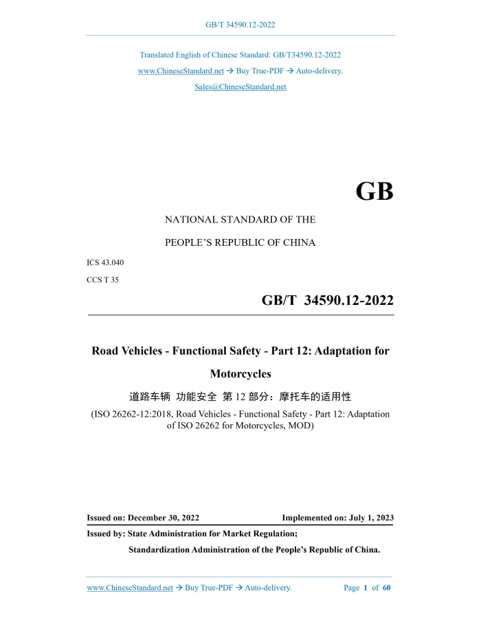GB/T 34590.12-2022: Road vehicles - Functional safety - Part 12: Adaptation for motorcycles Delivery: 9 seconds. True-PDF full-copy in English & invoice will be downloaded + auto-delivered via email. See step-by-step procedure Status: Valid