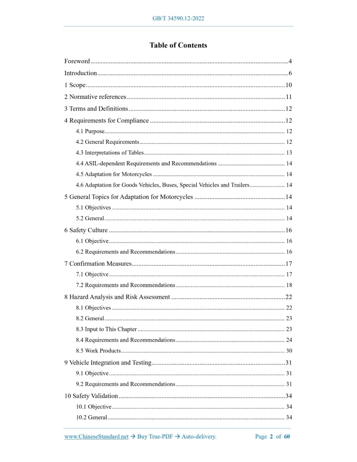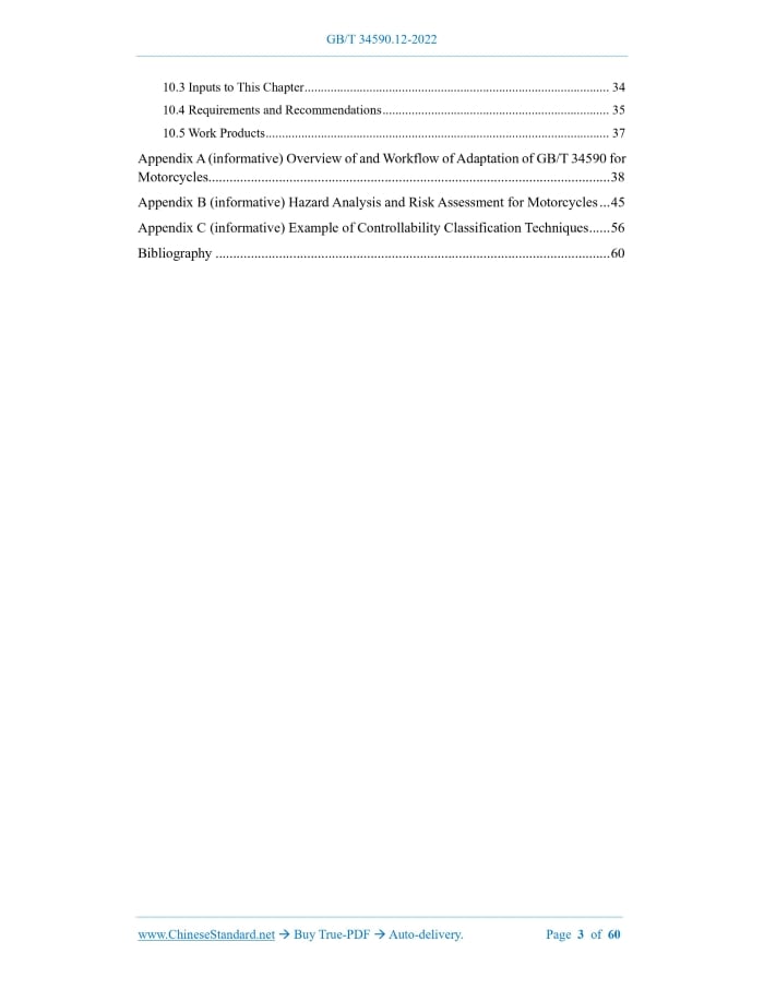 Similar standardsGB/T 34590.12-2022: Road vehicles - Functional safety - Part 12: Adaptation for motorcycles---This is an excerpt. Full copy of true-PDF in English version (including equations, symbols, images, flow-chart, tables, and figures etc.), auto-downloaded/delivered in 9 seconds, can be purchased online: https://www.ChineseStandard.net/PDF.aspx/GBT34590.12-2022GB NATIONAL STANDARD OF THE PEOPLE’S REPUBLIC OF CHINA ICS 43.040 CCS T 35 Road Vehicles - Functional Safety - Part 12.Adaptation for Motorcycles (ISO 26262-12.2018, Road Vehicles - Functional Safety - Part 12.Adaptation of ISO 26262 for Motorcycles, MOD) Issued on. DECEMBER 30, 2022 Implemented on. JULY 1, 2023 Issued by. State Administration for Market Regulation; Standardization Administration of the People’s Republic of China. Table of ContentsForeword... 4 Introduction... 6 1 Scope... 10 2 Normative references... 11 3 Terms and Definitions... 12 4 Requirements for Compliance... 12 4.1 Purpose... 12 4.2 General Requirements... 12 4.3 Interpretations of Tables... 13 4.4 ASIL-dependent Requirements and Recommendations... 14 4.5 Adaptation for Motorcycles... 14 4.6 Adaptation for Goods Vehicles, Buses, Special Vehicles and Trailers... 14 5 General Topics for Adaptation for Motorcycles... 14 5.1 Objectives... 14 5.2 General... 14 6 Safety Culture... 16 6.1 Objective... 16 6.2 Requirements and Recommendations... 16 7 Confirmation Measures... 17 7.1 Objective... 17 7.2 Requirements and Recommendations... 18 8 Hazard Analysis and Risk Assessment... 22 8.1 Objectives... 22 8.2 General... 23 8.3 Input to This Chapter... 23 8.4 Requirements and Recommendations... 24 8.5 Work Products... 30 9 Vehicle Integration and Testing... 31 9.1 Objective... 31 9.2 Requirements and Recommendations... 31 10 Safety Validation... 34 10.1 Objective... 34 10.2 General... 34 10.3 Inputs to This Chapter... 34 10.4 Requirements and Recommendations... 35 10.5 Work Products... 37 Appendix A (informative) Overview of and Workflow of Adaptation of GB/T 34590 for Motorcycles... 38 Appendix B (informative) Hazard Analysis and Risk Assessment for Motorcycles... 45 Appendix C (informative) Example of Controllability Classification Techniques... 56 Bibliography... 60ForewordThis document was drafted in accordance with the rules provided in GB/T 1.1-2020 Directives for Standardization - Part 1.Rules for the Structure and Drafting of Standardizing Documents. This document is Part 12 of GB/T 34590 Road Vehicles - Functional Safety. GB/T 34590 has issued the following parts. -- Part 1.Vocabulary; -- Part 2.Management of Functional Safety; -- Part 3.Concept Phase; -- Part 4.Product Development at the System Level; -- Part 5.Product Development at the Hardware Level; -- Part 6.Product Development at the Software Level; -- Part 7.Production, Operation, Service and Decommissioning; -- Part 8.Supporting Processes; -- Part 9.Automotive Safety Integrity Level (ASIL)-oriented and Safety-oriented Analyses; -- Part 10.Guideline; -- Part 11.Guidelines on Applications to Semiconductors; -- Part 12.Adaptation for Motorcycles. This document has been modified using ISO 26262-12.2018 Road Vehicles - Functional Safety - Part 12.Adaptation of ISO 26262 for Motorcycles. The technical differences between this document and ISO 26262-12.2018, and the causes for these differences are as follows. -- The normative reference GB/T 34590.1-2022 is used to replace ISO 26262-1, so as to adapt to the technical conditions of China and enhance the operability (see Chapter 3); ---The description of T&B is modified from “truck, bus, trailer and semi-trailer” into “goods vehicle, bus, special vehicle, trailer” (see 4.6; 4.6 of ISO 26262-8.2018), so as to maintain the consistency with the types of vehicles specified in GB/T 3730.1-2022 Terms and Definitions of Motor Vehicles, Trailers and Combination Vehicle - Part 1. Types; ---The description of “stress test” is modified from “stress tests” into “stress tests (such as. high load test and high environment test)” (see 10.4.3.4); ---The description of a suitable rationale for the CCP selection is modified from “a suitable rationale can be provided for the CCP selected” into “a suitable rationale shall be provided for the CCP selected” (see C.2). This document also makes the following editorial modifications. -- The sequence of paragraphs in the Scope is adjusted; ---The sub-clauses 8.4.5.1, 10.4.2.1 and 10.4.4.1 are deleted; ---The Introduction and its expression of the International standard are modified. Please be noted that certain content of this document may involve patents. The institution issuing this document does not undertake the responsibility of identifying these patents. This document was proposed by the Ministry of Industry and Information Technology of the People’s Republic of China. This document shall be under the jurisdiction of National Technical Committee 114 on Auto of Standardization Administration of China (SAC/TC 114). The drafting organizations of this document. China Automotive Technology and Research Center Co., Ltd.; Tianjin Internal Combustion Engine Research Institute (Tianjin Motorcycle Technology Center); CCIC West Co., Ltd.; BOSCH Auto Parts (Suzhou) Co., Ltd.; Hitachi Astemo Automotive Electronics (Shanghai) Co., Ltd.; Schaeffler (China) Co., Ltd.; Hella Shanghai Electronics Co., Ltd.; CRRCTIMES Electric Vehicle Co., Ltd.; BYD Auto Industry Co., Ltd.; Hubei e-CarX Technology Co., Ltd.; Suzhou Inovance United Power System Co., Ltd.; United Automotive Electronic Systems; Beijing Borgward Automotive Co., Ltd. The main drafters of this document. Guo Lingsong, Fu Yue, Li Bo, Zhang Liwei, Qu Yuanning, Tian Zhihui, Jiang Zhaojuan, Yu Jianye, Li Yong, Ma Fangping, Zhao Jinfu, Liu Chang, Zheng Yan, Wang Yu, Zhao Tianli.1 ScopeThis document specifies the requirements for adaptation for motorcycles, including the following.2 Normative referencesThe following documents are referred to in the tex