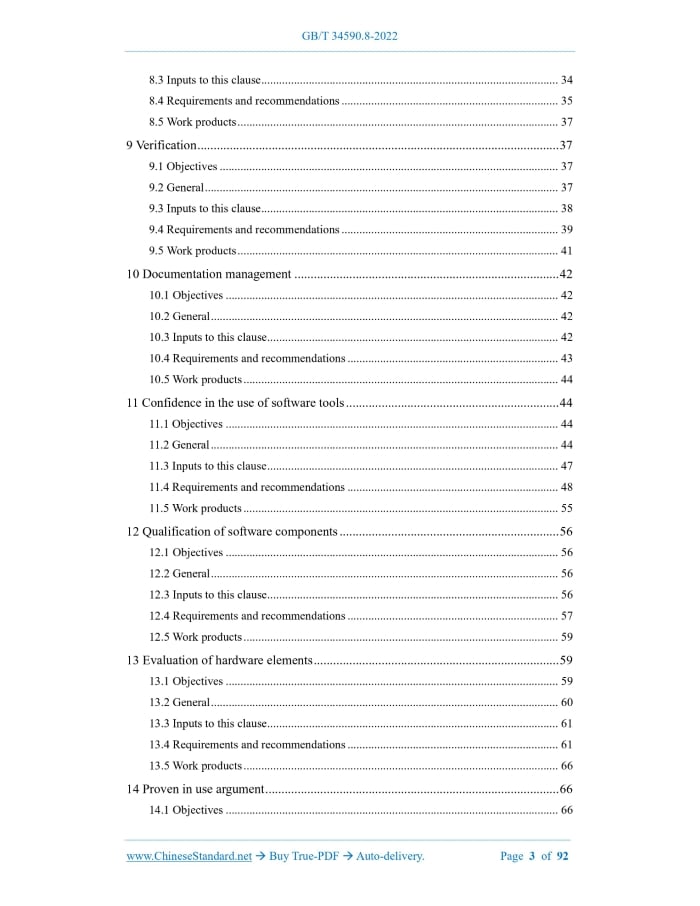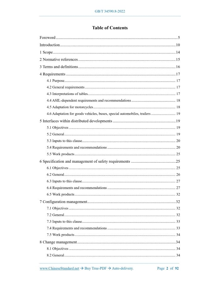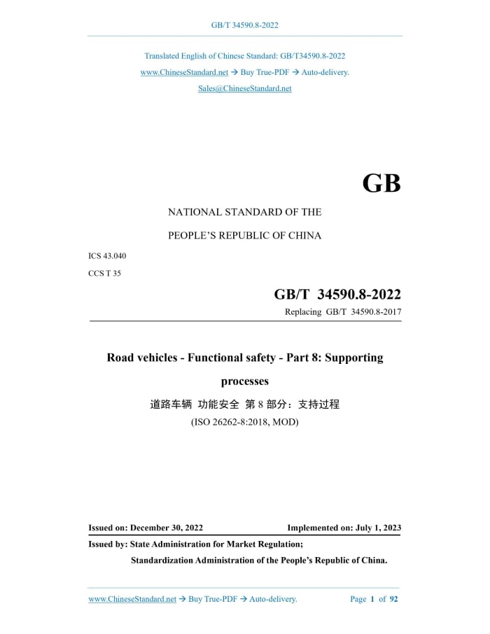 Similar standardsGB/T 34590.8-2022: Road vehicles - Functional safety - Part 8: Supporting processes---This is an excerpt. Full copy of true-PDF in English version (including equations, symbols, images, flow-chart, tables, and figures etc.), auto-downloaded/delivered in 9 seconds, can be purchased online: https://www.ChineseStandard.net/PDF.aspx/GBT34590.8-2022GB NATIONAL STANDARD OF THE PEOPLE’S REPUBLIC OF CHINA ICS 43.040 CCS T 35 Replacing GB/T 34590.8-2017 Road vehicles - Functional safety - Part 8.Supporting processes (ISO 26262-8.2018, MOD) Issued on. DECEMBER 30, 2022 Implemented on. JULY 1, 2023 Issued by. State Administration for Market Regulation; Standardization Administration of the People’s Republic of China. Table of ContentsForeword... 5 Introduction... 10 1 Scope... 14 2 Normative references... 15 3 Terms and definitions... 16 4 Requirements... 17 4.1 Purpose... 17 4.2 General requirements... 17 4.3 Interpretations of tables... 17 4.4 ASIL-dependent requirements and recommendations... 18 4.5 Adaptation for motorcycles... 18 4.6 Adaptation for goods vehicles, buses, special automobiles, trailers... 19 5 Interfaces within distributed developments... 19 5.1 Objectives... 19 5.2 General... 19 5.3 Inputs to this clause... 20 5.4 Requirements and recommendations... 20 5.5 Work products... 25 6 Specification and management of safety requirements... 25 6.1 Objectives... 25 6.2 General... 26 6.3 Inputs to this clause... 27 6.4 Requirements and recommendations... 27 6.5 Work products... 32 7 Configuration management... 32 7.1 Objectives... 32 7.2 General... 32 7.3 Inputs to this clause... 33 7.4 Requirements and recommendations... 33 7.5 Work products... 34 8 Change management... 34 8.1 Objectives... 34 8.2 General... 34 8.3 Inputs to this clause... 34 8.4 Requirements and recommendations... 35 8.5 Work products... 37 9 Verification... 37 9.1 Objectives... 37 9.2 General... 37 9.3 Inputs to this clause... 38 9.4 Requirements and recommendations... 39 9.5 Work products... 41 10 Documentation management... 42 10.1 Objectives... 42 10.2 General... 42 10.3 Inputs to this clause... 42 10.4 Requirements and recommendations... 43 10.5 Work products... 44 11 Confidence in the use of software tools... 44 11.1 Objectives... 44 11.2 General... 44 11.3 Inputs to this clause... 47 11.4 Requirements and recommendations... 48 11.5 Work products... 55 12 Qualification of software components... 56 12.1 Objectives... 56 12.2 General... 56 12.3 Inputs to this clause... 56 12.4 Requirements and recommendations... 57 12.5 Work products... 59 13 Evaluation of hardware elements... 59 13.1 Objectives... 59 13.2 General... 60 13.3 Inputs to this clause... 61 13.4 Requirements and recommendations... 61 13.5 Work products... 66 14 Proven in use argument... 66 14.1 Objectives... 66 14.2 General... 67 14.3 Inputs to this clause... 68 14.4 Requirements and recommendations... 68 14.5 Work products... 73 15 Interfacing an application that is out of scope of GB/T 34590... 73 15.1 Objectives... 73 15.2 General... 73 15.3 Inputs to this clause... 74 15.4 Requirements and recommendations... 74 15.5 Work products... 75 16 Integration of safety-related systems not developed according to GB/T 34590... 75 16.1 Objectives... 75 16.2 General... 75 16.3 Inputs to this clause... 75 16.4 Requirements and recommendations... 76 16.5 Work products... 77 Annex A (Informative) Overview of and workflow of supporting processes... 78 Annex B (Informative) Development Interface Agreement (DIA) example... 84 Bibliography... 91ForewordThis document was drafted in accordance with the rules provided in GB/T 1.1-2020 Directives for Standardization - Part 1.Rules for the Structure and Drafting of Standardizing Documents. This document is Part 8 of GB/T 34590 Road Vehicles - Functional Safety. GB/T 34590 has issued the following parts. -- Part 1.Vocabulary; -- Part 2.Management of Functional Safety; -- Part 3.Concept Phase; -- Part 4.Product Development at the System Level; -- Part 5.Product Development at the Hardware Level; -- Part 6.Product Development at the Software Level; -- Part 7.Production, Operation, Service and Decommissioning; -- Part 8.Supporting Processes; -- Part 9.Automotive Safety Integrity Level (ASIL)-oriented and Safety-oriented Analyses; -- Part 10.Guideline; -- Part 11.Guidelines on Applications to Semiconductors; -- Part 12.Adaptation for Motorcycles. This document serves as a replacement of GB/T 34590.8-2017 Road vehicles - Functional safety - Part 8.Supporting processes. In comparison with GB/T 34590.8-2017, apart from structural adjustments and editorial modifications, the main technical changes are as follows. -- Change the scope of application from “series production passenger cars” to “series production road vehicles, excluding mopeds” (see Clause 1; Clause 1 of the 2017 edition); -- Add adaptation for motorcycles (see 4.5); -- Add adaptation for trucks, buses, trailers and semi-trailers (see 4.6); -- Change the objectives of interfaces within distributed developments (see 5.1; 5.1 of the 2017 edition); -- Change the scope of non-application for distributed developments (see 5.4.1; 5.4.1 of the 2017 edition); -- Change the contents included in RFQ (see 5.4.2.2; 5.4.2.2 of the 2017 edition); -- Change the contents included in Development Interface Agreement (see 5.4.3.1; 5.4.3.1 of the 2017 edition); -- Change the segregation of duties between the customer and the supplier, and the specific requirements during execution of distributed development; add responsibilities to be borne by the customer (see 5.4.4; 5.4.4 of the 2017 edition); -- Change the specification of safety requirements, and add a footnote to Table 1 (see 6.4.1; 6.4.1 of the 2017 edition); -- Modify the requirements of characteristics for safety requirements (see 6.4.2.4; 6.4.2.4 of the 2017 edition); -- Modify the general rules for configuration management (see 7.2; 7.2 of the 2017 edition); -- Modify the requirements for configuration