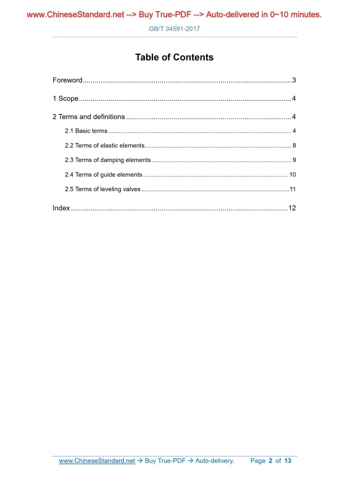 Similar standardsGB/T 34591-2017: Terms of air suspension for commercial vehicle---This is an excerpt. Full copy of true-PDF in English version (including equations, symbols, images, flow-chart, tables, and figures etc.), auto-downloaded/delivered in 9 seconds, can be purchased online: https://www.ChineseStandard.net/PDF.aspx/GBT34591-2017GB NATIONAL STANDARD OF THE PEOPLE’S REPUBLIC OF CHINA ICS 43.080 T 22 Terms of air suspension for commercial vehicle Issued on: OCTOBER 14, 2017 Implemented on: MAY 01, 2018 Issued by. General Administration of Quality Supervision, Inspection and Quarantine of the PRC; Standardization Administration of the PRC. Table of ContentsForeword ... 3 1 Scope ... 4 2 Terms and definitions ... 4 2.1 Basic terms ... 4 2.2 Terms of elastic elements ... 8 2.3 Terms of damping elements ... 9 2.4 Terms of guide elements ... 10 2.5 Terms of leveling valves ... 11 Index ... 12ForewordThis Standard is drafted in accordance with the rules given in GB/T 1.1-2009. This Standard was proposed by Ministry of Industry and Information Technology of the PRC. This Standard shall be under the jurisdiction of National Technical Committee of Auto Standardization (SAC/TC 114). Drafting organizations of this Standard. Dongfeng Motor Corporation, Shanghai Komman Vehicle Component System Co., Ltd., Zhuzhou Times New Material Technology Co., Ltd., Shandong Meichen Science & Technology Co., Ltd., Xiamen King Long United Automotive Industry Co., Ltd., Zhengzhou Nissan Auto Co., Ltd.. Main drafters of this Standard. Yuan Zhaohui, Chen Yaoming, Pan Xueyu, Zhang Shangjiao, Ye Aifeng, Yu Boying, Feng Mei, He Yunjiang, Wang Sheng, Ge Yuefeng, Li Jianlin, Tang Zhigang, Lu Hongliang, Chen Weiqiang, Wang Dongcheng, Fan Peibin. Terms of air suspension for commercial vehicle1 ScopeThis Standard defines the terms of air suspension for commercial vehicle. This Standard applies to air suspension for commercial vehicle.2 Terms and definitions2.1 Basic terms 2.1.1 Air suspension A suspension type which utilizes an air spring as an elastic element in whole or in part. 2.1.2 Full air suspension A suspension type in which the vertical elastic force between the frame (or body) and the axle (or wheel) is entirely borne by an air spring, and the stiffness of the suspension is entirely composed of the stiffness of the air spring. 2.1.3 Hybrid air suspension A suspension type in which when fully loaded in a static state, not less than 50% of the vertical elastic force between the frame (or body) and the axle (or wheel) is borne by an air spring, and the stiffness of the suspension is composed of the stiffness of the air spring and other elastic elements. 2.1.4 Auxiliary air suspension A suspension type in which when fully loaded in a static state, less than 50% of the vertical elastic force between the frame (or body) and the axle (or wheel) is borne by an air spring, and the stiffness of the suspension must be partially formed by the air spring. 2.1.5 Independent air suspension An independent suspension type which utilizes an air spring as an elastic element in whole or in part. 2.1.6 Rigid axle air suspension A shock absorber with a built-in structure which limits the rebound stroke of suspension system. 2.3.2 Hydraulic stop shock absorber A shock absorber whose rebound stop function is realized by hydraulic structure. 2.3.3 Damping controlled shock absorber A shock absorber whose damping parameters can vary with vehicle load or driving conditions. 2.3.4 Pneumatically controlled damping shock absorber A shock absorber which uses air pressure to adjust the damping parameters. 2.3.5 Electrically controlled damping shock absorber A shock absorber which uses electronic control technique to adjust the damping parameters. 2.3.6 Electro-rheological controlled damping shock absorber A shock absorber which adjusts the damping parameters by controlling the electro-rheological fluid. 2.3.7 Magneto-rheological controlled damping shock absorber A shock absorber which adjusts the damping parameters by controlling the magnetically controlled magneto-rheological fluid. 2.4 Terms of guide elements 2.4.1 Torque rod A rod piece between the axle and the frame (or body) which controls the axle movement to guide and transmits the force. 2.4.2 Longitudinal rod A longitudinally arranged torque rod between the axle and the frame (or body). 2.4.3 Lateral rod A laterally arranged torque rod between the axle and the frame (or body). 2.4.4 V-link A guide element of V-shaped overall framework between the axle and the frame ......Source: Above contents are excerpted from the full-copy PDF -- translated/reviewed by: www.ChineseStandard.net / Wayne Zheng et al. Tips & Frequently Asked Questions:Question 1: How long will the true-PDF of English version of GB/T 34591-2017 be delivered?Answer: The full copy PDF of English version of GB/T 34591-2017 can be downloaded in 9 seconds, and it will also be emailed to you in 9 seconds (double mechanisms to ensure the delivery reliably), with PDF-invoice.Question 2: Can I share the purchased PDF of GB/T 34591-2017_English with my colleagues?Answer: Yes. The purchased PDF of GB/T 34591-2017_English will be deemed to be sold to your employer/organization who actually paid for it, including your colleagues and your employer's intranet.Question 3: Does the price include tax/VAT?Answer: Yes. Our tax invoice, downloaded/delivered in 9 seconds, includes all tax/VAT and complies with 100+ countries' tax regulations (tax exempted in 100+ countries) -- See Avoidance of Double Taxation Agreements (DTAs): List of DTAs signed between Singapore and 100+ countriesQuestion 4: Do you accept my currency other than USD?Answer: Yes. www.ChineseStandard.us -- GB/T 34591-2017 -- Click this link and select your country/currency to pay, the exact amount in your currency will be printed on the invoice. Full PDF will also be downloaded/emailed in 9 seconds.How to buy and download a true PDF of English version of GB/T 34591-2017
