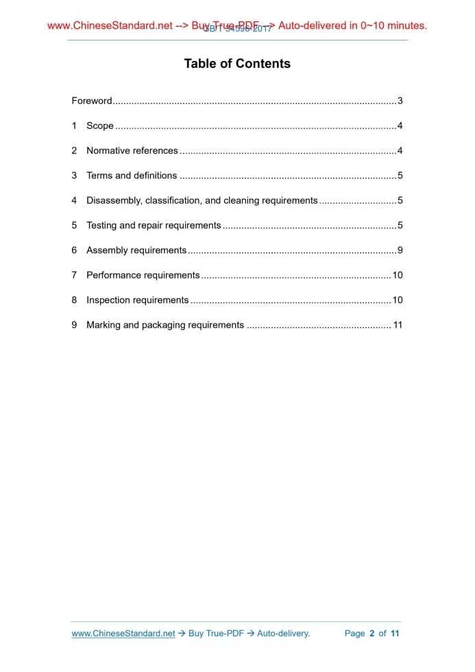 Similar standardsGB/T 34596-2017: The technical specification for remanufacturing of automotive components - Oil pumps---This is an excerpt. Full copy of true-PDF in English version (including equations, symbols, images, flow-chart, tables, and figures etc.), auto-downloaded/delivered in 9 seconds, can be purchased online: https://www.ChineseStandard.net/PDF.aspx/GBT34596-2017 GB NATIONAL STANDARD OF THE PEOPLE’S REPUBLIC OF CHINA ICS 43.060.30 T 14 The technical specification for remanufacturing of automotive components - Oil pumps Issued on: OCTOBER 14, 2017 Implemented on: MAY 1, 2018 Issued by. General Administration of Quality Supervision, Inspection and Quarantine of the People’s Republic of China; Standardization Administration of the People’s Republic of China. Table of ContentsForeword ... 3 1 Scope ... 4 2 Normative references ... 4 3 Terms and definitions ... 5 4 Disassembly, classification, and cleaning requirements ... 5 5 Testing and repair requirements ... 5 6 Assembly requirements ... 9 7 Performance requirements ... 10 8 Inspection requirements ... 10 9 Marking and packaging requirements ... 11 The technical specification for remanufacturing of automotive components - Oil pumps1 ScopeThis Standard specifies the terms and definitions, disassembly, classification and cleaning requirements, testing and repair requirements, assembly requirements, performance requirements, inspection requirements, marking and packaging requirements for remanufacturing of oil pumps. This Standard is applicable to the remanufacturing of oil pumps for automotive engines.2 Normative referencesThe following documents are essential to the application of this document. For dated references, only the editions with the dates indicated are applicable to this document. For undated references, only the latest editions (including all the amendments) are applicable to this document. GB/T 6809.6 Reciprocating internal combustion engines -- Vocabulary of components and systems -- Part 6. Lubricating systems GB/T 26989 Automobile recovery -- Terminology GB/T 28675 Remanufacturing of automotive components -- Disassembly GB/T 28676 Remanufacturing of automotive components -- Classification GB/T 28677 Remanufacturing of automotive components -- Cleaning GB/T 28678 Remanufacturing of automotive components -- Pre-delivery inspection GB/T 28679 Remanufacturing of automotive components -- Assembly JB/T 8413.2-2010 Internal combustion engines -- Oil pumps -- Part 2. Assemblies -- Methods for test QC/T 289-2001 Technical specifications for oil pump of automotive engine 5.1.2.1 Defective pump bodies that are not affected by oil pressure or mechanical forces may be repaired using stitching, welding repair, special glue to bond the broken and cracked parts of castings, or other methods. After repair, it is required to make a smooth surface by grinding. If it is on the machined surface, APPLY grinding or cutting until it is flush with the reference surface. 5.1.2.2 Defects such as pores, blisters, etc. can be filled with professional repair agents; or metal plugs with the same quality as the castings can be embedded in plugs after the treatment is finished; or USE hot-melt materials for spraying; or USE a variety of other welding process to repair, through the addition of materials, followed by machining and cutting. 5.1.2.3 If the diameter of the pump body’s inner cavity (gear chamber, and rotor chamber) is out of tolerance, it shall be repaired by the inner cavity inlaying method. Or USE laser cladding, cold welding, spraying, and other methods to restore the size. 5.1.2.4 Where the size of the shaft bore of the pump body is out of tolerance or worn, the reaming method is used to eliminate wear trace. Then PROVIDE an optional oversized lining. Or PROVIDE an oversized driven shaft after enlargement of the driven shaft hole. Or USE laser cladding, cold welding, spraying, and other methods to restore the inner hole size. 5.1.2.5 For the damages to machining plane, USE metal spraying or other welding repair methods to repair, through the addition of materials, followed by machining and cutting. 5.1.2.6 In the case that the remaining holes are damaged, the damaged mating holes are pretreated and repaired by welding repair. The damages to the threaded holes of non-high-strength bolts can be repaired by expanding the threaded holes and re-inserting the silk sleeve. High-strength bolt holes are not allowed to be repaired. If there is any damage, it shall be discarded. 5.1.2.7 If the above defects cannot be repaired, it shall be discarded. 5.2 Testing and repair of pump cover parts 5.2.1 Pump cover testing 5.2.1.1 Non-destructive testing methods can be used to detect whether the pump cover has cracks, pores, blisters, etc. 5.2.1.2 TEST the dimensional tolerance, geometric tolerance, surface structure, etc. of the pump cover. 5.2.2 Pump cover repair 5.2.2.1 If there are any defects such as cracks, pores, blisters, etc., the repair7 Performance requirements7.1 The basic performance requirements for remanufactured oil pumps shall comply with the provisions of Chapter 4 in QC/T 289-2001. 7.2 The reliability test time of remanufactured oil pumps shall not be less than 350h. After the test, the performance shall comply with the provisions of 4.7 in QC/T 289-2001.8 Inspection requirements8.1 Type inspection 8.1.1 The type inspection shall be carried out under one of the following circumstances. a) when finalizing the design for the first time, or the finalized products are transferred to another factory for production; b) after the formal production, there are major changes in process, etc., which may affect the product performance; c) after the formal production, PERFORM every two years; d) when there is a major difference between the exit-factory inspection results and the last type inspection results. 8.1.2 The type inspection items include. a) oil absorption performance; b) speed characteristics; c) pressure characteristics