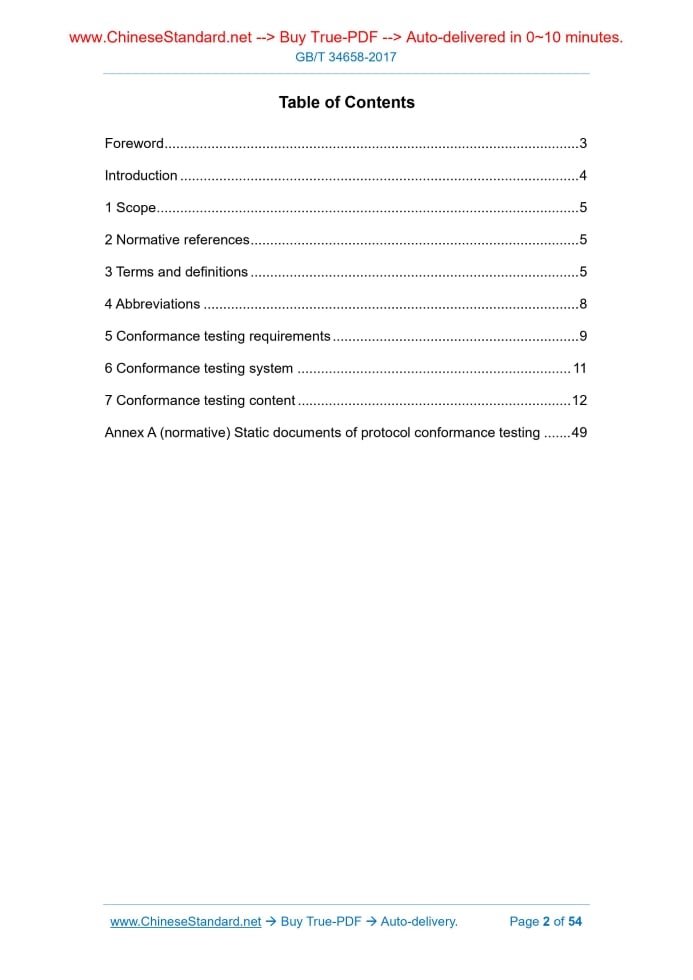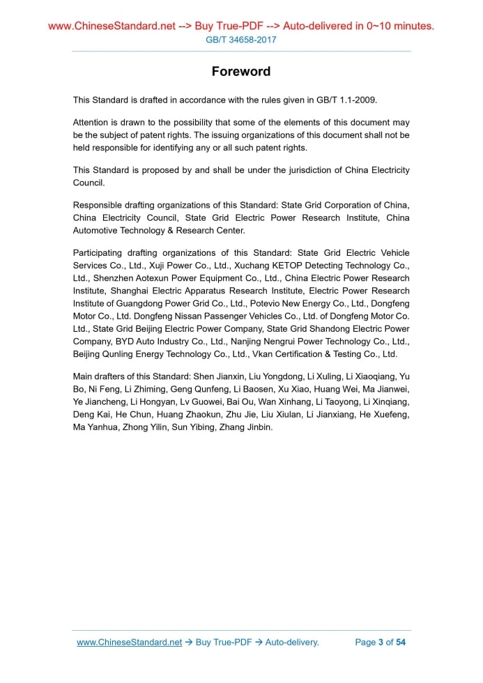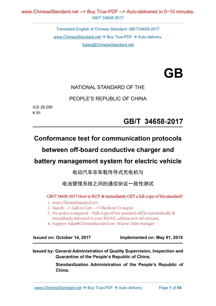 Similar standardsGB/T 34658-2017: Conformance test for communication protocols between off-board conductive charger and battery management system for electric vehicle---This is an excerpt. Full copy of true-PDF in English version (including equations, symbols, images, flow-chart, tables, and figures etc.), auto-downloaded/delivered in 9 seconds, can be purchased online: https://www.ChineseStandard.net/PDF.aspx/GBT34658-2017 GB NATIONAL STANDARD OF THE PEOPLE’S REPUBLIC OF CHINA ICS 29.200 K 81 Conformance test for communication protocols between off-board conductive charger and battery management system for electric vehicle Issued on: OCTOBER 14, 2017 Implemented on: MAY 01, 2018 Issued by. General Administration of Quality Supervision, Inspection and Quarantine of the People’s Republic of China; Standardization Administration of the People’s Republic of China. Table of ContentsForeword... 3 Introduction... 4 1 Scope... 5 2 Normative references... 5 3 Terms and definitions... 5 4 Abbreviations... 8 5 Conformance testing requirements... 9 6 Conformance testing system... 11 7 Conformance testing content... 12 Annex A (normative) Static documents of protocol conformance testing... 49ForewordThis Standard is drafted in accordance with the rules given in GB/T 1.1-2009. Attention is drawn to the possibility that some of the elements of this document may be the subject of patent rights. The issuing organizations of this document shall not be held responsible for identifying any or all such patent rights. This Standard is proposed by and shall be under the jurisdiction of China Electricity Council. Responsible drafting organizations of this Standard. State Grid Corporation of China, China Electricity Council, State Grid Electric Power Research Institute, China Automotive Technology & Research Center. Participating drafting organizations of this Standard. State Grid Electric Vehicle Services Co., Ltd., Xuji Power Co., Ltd., Xuchang KETOP Detecting Technology Co., Ltd., Shenzhen Aotexun Power Equipment Co., Ltd., China Electric Power Research Institute, Shanghai Electric Apparatus Research Institute, Electric Power Research Institute of Guangdong Power Grid Co., Ltd., Potevio New Energy Co., Ltd., Dongfeng Motor Co., Ltd. Dongfeng Nissan Passenger Vehicles Co., Ltd. of Dongfeng Motor Co. Ltd., State Grid Beijing Electric Power Company, State Grid Shandong Electric Power Company, BYD Auto Industry Co., Ltd., Nanjing Nengrui Power Technology Co., Ltd., Beijing Qunling Energy Technology Co., Ltd., Vkan Certification & Testing Co., Ltd. Main drafters of this Standard. Shen Jianxin, Liu Yongdong, Li Xuling, Li Xiaoqiang, Yu Bo, Ni Feng, Li Zhiming, Geng Qunfeng, Li Baosen, Xu Xiao, Huang Wei, Ma Jianwei, Ye Jiancheng, Li Hongyan, Lv Guowei, Bai Ou, Wan Xinhang, Li Taoyong, Li Xinqiang, Deng Kai, He Chun, Huang Zhaokun, Zhu Jie, Liu Xiulan, Li Jianxiang, He Xuefeng, Ma Yanhua, Zhong Yilin, Sun Yibing, Zhang Jinbin.IntroductionProtocol conformance testing is a kind of functional testing, which is to test the protocol implementation under test in a certain network environment by using a series of test sequences. By comparing the similarities and differences between actual output and expected output, to determine the extent to which the implementation under test is consistent with the description standard. By protocol conformance testing, it will reduce the risk of errors when the product is running in the field. In the realization process of the protocol, due to 1) the ambiguity of the protocol standard description and the ambiguity of understanding, 2) the programming mode and implementation method of the protocol are different, and 3) the protocol implementation has different device selection and configuration and other reasons, there are some differences between different protocol implementations, therefore, it is necessary to carry out protocol conformance testing. Protocol conformance testing is to detect the existence of errors rather than verify that it is error-free. Relying solely on conformance testing cannot absolutely guarantee the interoperability of the application, so it shall carry out the interoperability testing on the basis of conformance testing. Protocol conformance testing is the basis for interoperability testing. Only for products that pass the protocol conformance testing indicating that they meet the requirements of the relevant protocol standards, carrying out interoperability testing is meaningful. Protocol conformance testing does not include evaluation of the design of the protocol standard itself, nor the performance, redundancy, robustness and reliability assessment of the particular protocol implementation body. Conformance test for communication protocols between off-board conductive charger and battery management system for electric vehicle1 ScopeThis Standard specifies the conformance testing requirements, conformance testing system and conformance testing content for communication protocols between off- board conductive charger (hereinafter referred to as charger) and battery management system (hereinafter referred to as BMS) for electric vehicle. This Standard applies to the conformance testing carried out for products that are stated to comply with GB/T 27930-2015.2 Normative referencesThe following referenced documents are indispensable for the application of this document. For dated references, only the dated edition cited applies. For undated references, the latest edition of the referenced document (including all amendments) applies. GB/T 17178.1-1997 Information technology - Open systems interconnection - Conformance testing methodology and framework - Part 1.General concepts GB/T 27930-2015 Communication protocols between off-board conductive charger and battery management system for electric vehicle3 Terms and definitionsFor the purpose of this document, the following terms and definitions and those defined in GB/T 17178.1-1997 apply. 3.1 abstract test c
