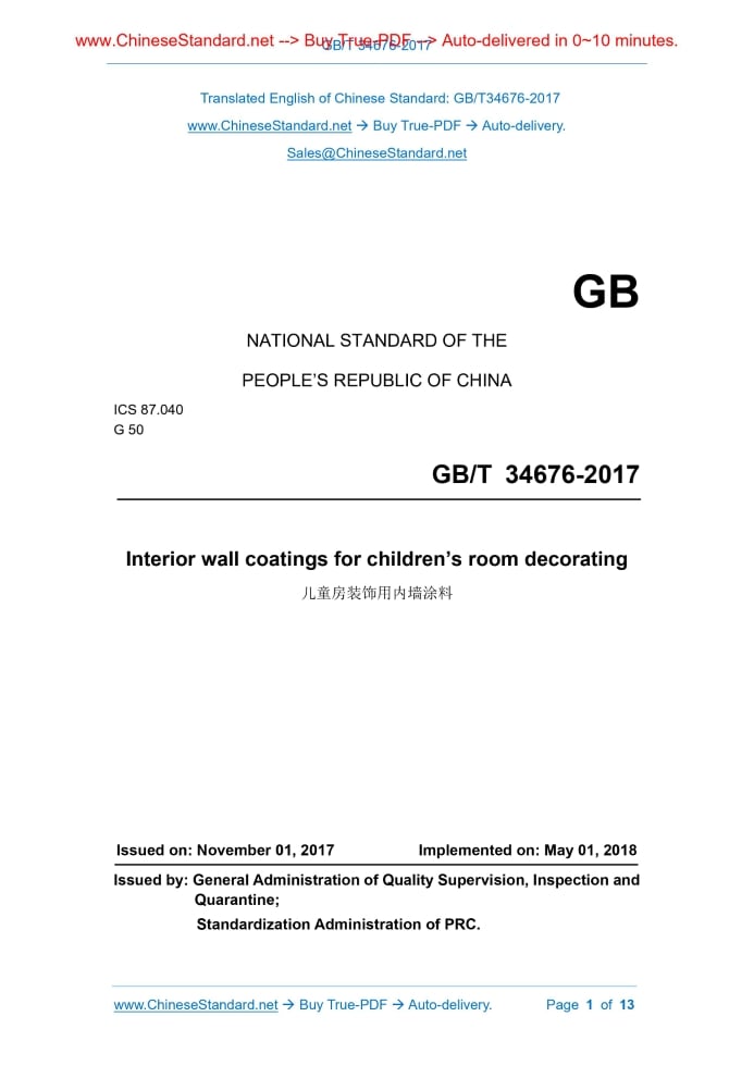GB/T 34676-2017: Interior wall coatings for children room decorating Delivery: 9 seconds. True-PDF full-copy in English & invoice will be downloaded + auto-delivered via email. See step-by-step procedure Status: Valid