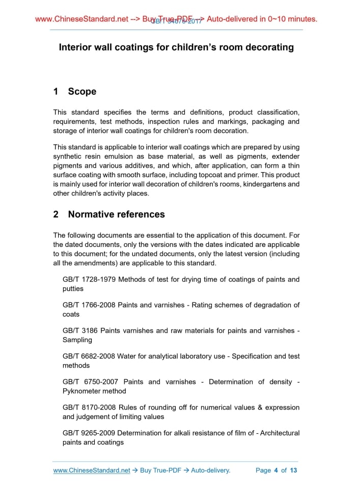 Similar standardsGB/T 34676-2017: Interior wall coatings for children room decorating---This is an excerpt. Full copy of true-PDF in English version (including equations, symbols, images, flow-chart, tables, and figures etc.), auto-downloaded/delivered in 9 seconds, can be purchased online: https://www.ChineseStandard.net/PDF.aspx/GBT34676-2017GB NATIONAL STANDARD OF THE PEOPLE’S REPUBLIC OF CHINA ICS 87.040 G 50 Interior wall coatings for children’s room decorating Issued on. NOVEMBER 01, 2017 Implemented on. MAY 01, 2018 Issued by. General Administration of Quality Supervision, Inspection and Quarantine; Standardization Administration of PRC. Table of ContentsForeword... 3 1 Scope... 4 2 Normative references... 4 3 Terms and definitions... 5 4 Product classification... 6 5 Requirements... 6 6 Test methods... 7 7 Inspection rules... 12 8 Marking, packaging and storage... 13ForewordThis standard was drafted in accordance with the rules given in GB/T 1.1-2009. The standard was proposed by China Petroleum and Chemical Industry Federation. This standard shall be under the jurisdiction of the National Coatings and Pigments Standardization Technical Committee (SAC/T C5). Drafting organizations of this standard. Jiabaoli Chemical Group Co., Ltd., CNOOC Changzhou Coating Chemical Research Institute Co., Ltd., Dow Chemical (China) Investment Co., Ltd., Libang Coatings (China) Co., Ltd., Akzo Nobel Taikoo Paint (Shanghai), SKshu Paint Co., Ltd., BASF (China) Co., Ltd., China Building Materials Inspection and Certification Group Co., Ltd., Guangdong Bardez Chemical Co., Ltd., Bauhinia Paint (Shanghai) Co., Ltd., Zhonghua Paint (Shenzhen) Ltd., Foshan Shunde BATF Industry Co., Ltd., Guangdong Huarun paints Co., Ltd., Shenzhen Hirota green paint Co., Union (Foshan) Co., Ltd., Hebei Chenyang Industry & Trade Group Co., Ltd., Zhejiang Nameixin Materials Co., Ltd., Zhejiang Zhiqiang Coatings Co., Ltd., Wanhua Chemical Group Co., Ltd., Guangdong Hualong Coatings Industry Co., Ltd., Zhaoqing Qianjiang High-tech Materials Co., Ltd., Shanghai Jianke Inspection Co., Ltd., Jiangsu Champion Coatings Technology Group Co., Ltd., Zhejiang Huate Industrial Group Huate Chemical Co., Ltd., Wacker Chemical (China) Co., Ltd. The main drafters of this standard. Chen Ronghua, Zhang Yonggang, Ji Junhong, Nan Xuan, Gao Jidong, Wang Yan, Lin Changqing, Zhu Liguang, Qiao Yaling, Li Jinming, Xing Jun, Li Donghui, Yang Wentao, Kou Hui, Xu Xinxiang, Kang Lunguo, Hu Zhongyuan, He Guiping, Qu Daojun, Sun Jiakuan, Mai Zongyi, Li Huining, Hu Xiaozhen, Xie Hai, Wang Weidong, Li Yun, Jiang Yun, Li Guangdong. Interior wall coatings for children’s room decorating1 ScopeThis standard specifies the terms and definitions, product classification, requirements, test methods, inspection rules and markings, packaging and storage of interior wall coatings for children's room decoration. This standard is applicable to interior wall coatings which are prepared by using synthetic resin emulsion as base material, as well as pigments, extender pigments and various additives, and which, after application, can form a thin surface coating with smooth surface, including topcoat and primer. This product is mainly used for interior wall decoration of children's rooms, kindergartens and other children's activity places.2 Normative referencesThe following documents are essential to the application of this document. For the dated documents, only the versions with the dates indicated are applicable to this document; for the undated documents, only the latest version (including all the amendments) are applicable to this standard. GB/T 1728-1979 Methods of test for drying time of coatings of paints and putties GB/T 1766-2008 Paints and varnishes - Rating schemes of degradation of coats GB/T 3186 Paints varnishes and raw materials for paints and varnishes - Sampling GB/T 6682-2008 Water for analytical laboratory use - Specification and test methods GB/T 6750-2007 Paints and varnishes - Determination of density - Pyknometer method3 Terms and definitionsThe following terms and definitions apply to this document. 3.1 Volatile organic compounds; VOC Any organic liquid and/or solid that can naturally evaporate at the normal temperature and pressure of the atmosphere. 3.2 Volatile organic compound content The mass of volatile organic compounds presented in the coating as measured under specified conditions.4 Product classificationThis standard is divided into interior wall primer and interior wall finish in accordance with the different uses of the product.5 Requirements5.1 Quality performance requirements The quality performance of the product shall comply with the requirements of Table 1. 5.2 Limit requirements for hazardous substances The hazardous substances limit of the product shall comply with the requirements of Table 2.6 Test methods6.1 Sampling The product is sampled in accordance with GB/T 3186, it can also be sampled in accordance with the agreed method. The amount of sampling is determined in accordance with the inspection needs. 6.4 Preparation of test panel 6.4.1 Specimen preparation When the product to be inspected is not clearly indicated of the dilution ratio, stir it evenly and then make a slab. When the product to be inspected indicates the dilution ratio, except for the contrast ratio item, for all the items that need to be tested by preparing slab, it shall prepare the slab after mixing it uniformly in accordance with the specified dilution ratio. If the ratio is a certain range, it shall take the middle value. 6.4.2 Preparation of primer test panel 6.4.2.1 The primer panel is made by brushing method. Each sample is first measured for density D in accordance with the provisions of GB/T 6750-2007, the brushing mass is calculated in accordance with formula (1). 6.4.2.2 Unless otherwise agreed, the substrate type, test panel size, test panel quantity, brushing amount and curing period of each test item of primer shall comply with the requir