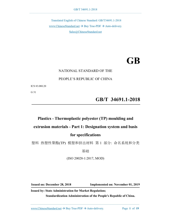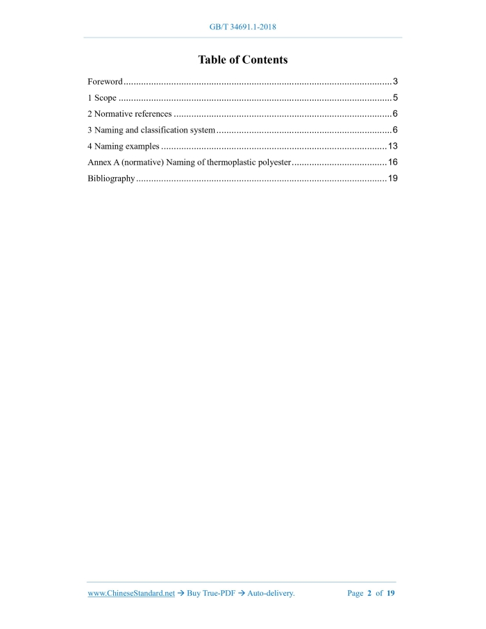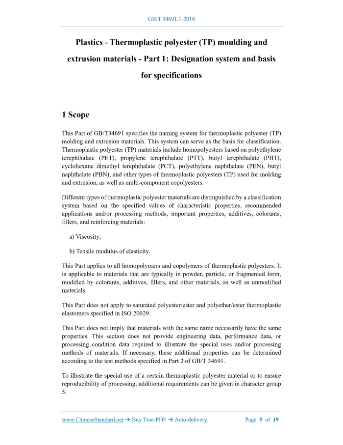 Similar standardsGB/T 34691.1-2018: Plastics -- Thermoplastic polyester (TP) moulding and extrusion materials -- Part 1: Designation system and basis for specifications---This is an excerpt. Full copy of true-PDF in English version (including equations, symbols, images, flow-chart, tables, and figures etc.), auto-downloaded/delivered in 9 seconds, can be purchased online: https://www.ChineseStandard.net/PDF.aspx/GBT34691.1-2018 GB NATIONAL STANDARD OF THE PEOPLE’S REPUBLIC OF CHINA ICS 83.080.20 G 31 Plastics - Thermoplastic polyester (TP) moulding and extrusion materials - Part 1: Designation system and basis for specifications 基础 (ISO 20028-1:2017, MOD) ISSUED ON: DECEMBER 28, 2018 IMPLEMENTED ON: NOVEMBER 01, 2019 Issued by: State Administration for Market Regulation; Standardization Administration of the People's Republic of China. Table of ContentsForeword ... 3 1 Scope ... 5 2 Normative references ... 6 3 Naming and classification system ... 6 4 Naming examples ... 13 Annex A (normative) Naming of thermoplastic polyester ... 16 Bibliography ... 19 Plastics - Thermoplastic polyester (TP) moulding and extrusion materials - Part 1: Designation system and basis for specifications1 ScopeThis Part of GB/T34691 specifies the naming system for thermoplastic polyester (TP) molding and extrusion materials. This system can serve as the basis for classification. Thermoplastic polyester (TP) materials include homopolyesters based on polyethylene terephthalate (PET), propylene terephthalate (PTT), butyl terephthalate (PBT), cyclohexane dimethyl terephthalate (PCT), polyethylene naphthalate (PEN), butyl naphthalate (PBN), and other types of thermoplastic polyesters (TP) used for molding and extrusion, as well as multi-component copolyesters. Different types of thermoplastic polyester materials are distinguished by a classification system based on the specified values of characteristic properties, recommended applications and/or processing methods, important properties, additives, colorants, fillers, and reinforcing materials: a) Viscosity; b) Tensile modulus of elasticity. This Part applies to all homopolymers and copolymers of thermoplastic polyesters. It is applicable to materials that are typically in powder, particle, or fragmented form, modified by colorants, additives, fillers, and other materials, as well as unmodified materials. This Part does not apply to saturated polyester/ester and polyether/ester thermoplastic elastomers specified in ISO 20029. This Part does not imply that materials with the same name necessarily have the same properties. This section does not provide engineering data, performance data, or processing condition data required to illustrate the special uses and/or processing methods of materials. If necessary, these additional properties can be determined according to the test methods specified in Part 2 of GB/T 34691. To illustrate the special use of a certain thermoplastic polyester material or to ensure reproducibility of processing, additional requirements can be given in character group 5. NOTE 1: The viscosity measured with other solvents can be converted into the viscosity measured with phenol/1,2-dichlorobenzene as the solvent using the following formula: Phenol/1,1,2,2-tetrachloroethane (50/50) as solvent: x=0.93y+1.87 Phenol/1,1,2,2-tetrachloroethane (60/40) as solvent: x=1.20y -13.34 o-Chlorophenol as solvent: x=1.22y -10.24 Dichloroacetic acid as solvent: x=1.20y -18.07 In which: x is the viscosity measured using phenol/1,2-dichlorobenzene (50/50) as the solvent; y is the viscosity measured with other corresponding solvents. NOTE 2: The viscosity measured with other solvents can be converted to the viscosity measured with m-cresol as the solvent using the following formula: Phenol/1,1,2,2-tetrachloroethane (50/50) as solvent: x=0.70y+5.59 Phenol/1,1,2,2-tetrachloroethane (60/40) as solvent: x=0.57y+29.22 o-Chlorophenol as solvent: x=0.85y+3.14 Dichloroacetic acid as solvent: x=0.70y+7.34 Phenol/1,2-dichlorobenzene as solvent: x=0.75y+0.96 In which: x is the viscosity measured using m-cresol as the solvent; y is the viscosity measured with other corresponding solvents. 3.5.2.2 For PCT, phenol/1,1,2,2-tetrachloroethane (60/40) shall be used as the solvent to determine viscosity. 3.5.2.3 For amorphous PEN, phenol/1,1,2,2-tetrachloroethane (60/40) shall be used as the solvent to determine the viscosity. For crystalline PEN, phenol/2,4,6- trichlorophenol (60/40) was selected as the solvent to determine the viscosity. 3.5.2.4 For PBN, phenol/1,1,2,2-tetrachloroethane (60/40) shall be used as the solvent to determine viscosity. 3.5.2.5 For other TP homopolymers and copolymers, m-cresol is preferred as the solvent. 3.5.2.6 Divide the viscosity into 8 ranges based on possible values. Each range isAnnex A(normative) Naming of thermoplastic polyester Thermoplastic polyester materials are thermoplastic materials that contain ester groups (-CO-O-) at regular intervals on linear polymer chains. Straight chain polyester is obtained by condensation reaction of diols with two hydroxyl groups (-OH) and dicarboxylic acids with two carboxyl groups (-COOH) or their esters. Hydroxycarboxylic acids or their esters can also be used to synthesize polyesters. If tricarboxylic acids and/or ternary alcohols are used, branched polymers are obtained. Here are six well-known thermoplastic polyesters: PET: Polyethylene terephthalate PTT: Polyethylene terephthalate PBT: Polybutylene terephthalate PCT: Polyethylene terephthalate cyclohexane dimethyl ester PEN: Polyethylene naphthalene dicarboxylate PBN: Polybutylene naphthalate For other polyesters and copolyesters, the same naming system as polyamides and copolyamides shall be used (see ISO 16396) to avoid having an abbreviation for each type of polyester. According to GB/T 1844.1-2008, the symbol for thermoplastic polyester is TP. Aliphatic polyesters synthesized from diols and linear dicarboxylic acids or their esters are named by 