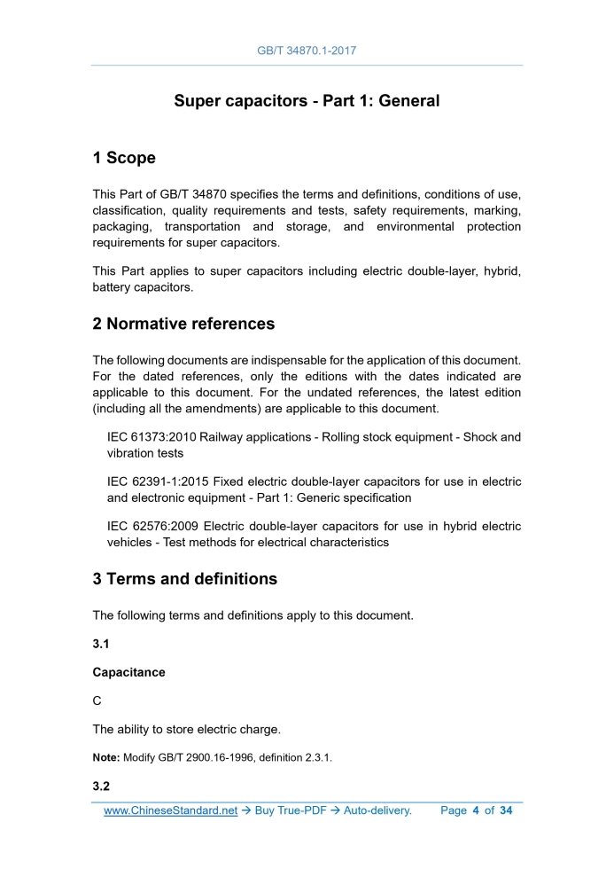 Similar standardsGB/T 34870.1-2017: Super capacitors - Part 1: General---This is an excerpt. Full copy of true-PDF in English version (including equations, symbols, images, flow-chart, tables, and figures etc.), auto-downloaded/delivered in 9 seconds, can be purchased online: https://www.ChineseStandard.net/PDF.aspx/GBT34870.1-2017GB NATIONAL STANDARD OF THE PEOPLE’S REPUBLIC OF CHINA ICS 31.060.70 K 42 Super capacitors - Part 1: General ISSUED ON: NOVEMBER 01, 2017 IMPLEMENTED ON: MAY 01, 2018 Issued by: General Administration of Quality Supervision, Inspection and Quarantine of the PRC; Standardization Administration of the PRC. Table of ContentsForeword ... 3 1 Scope ... 4 2 Normative references ... 4 3 Terms and definitions ... 4 4 Conditions of use ... 9 5 Classification ... 10 5.1 Overview ... 10 5.2 Classification according to electrodes ... 10 5.3 Classification according to principle ... 10 5.4 Classification according to electrolyte ... 10 6 Quality requirements and tests ... 10 6.1 Test classification ... 10 6.2 Test conditions ... 10 6.3 Test items ... 12 6.4 Test methods ... 13 7 Safety requirements ... 30 7.1 Safety requirements for case connection ... 30 7.2 Other safety requirements ... 30 8 Marking ... 30 8.1 Cell ... 30 8.2 Module ... 30 8.3 Packaging box ... 31 9 Packaging, transportation and storage ... 31 9.1 Packaging ... 31 9.2 Transportation, storage and installation ... 31 10 Environmental protection ... 32 10.1 Prevention of environmental pollution by chemicals ... 32 10.2 Electromagnetic compatibility ... 33 10.3 Noise ... 33 Bibliography ... 34 Super capacitors - Part 1: General1 ScopeThis Part of GB/T 34870 specifies the terms and definitions, conditions of use, classification, quality requirements and tests, safety requirements, marking, packaging, transportation and storage, and environmental protection requirements for super capacitors. This Part applies to super capacitors including electric double-layer, hybrid, battery capacitors.2 Normative referencesThe following documents are indispensable for the application of this document. For the dated references, only the editions with the dates indicated are applicable to this document. For the undated references, the latest edition (including all the amendments) are applicable to this document. IEC 61373:2010 Railway applications - Rolling stock equipment - Shock and vibration tests IEC 62391-1:2015 Fixed electric double-layer capacitors for use in electric and electronic equipment - Part 1: Generic specification IEC 62576:2009 Electric double-layer capacitors for use in hybrid electric vehicles - Test methods for electrical characteristics3 Terms and definitionsThe following terms and definitions apply to this document. 3.1 Capacitance The ability to store electric charge. Note: Modify GB/T 2900.16-1996, definition 2.3.1. 3.2 c) Atmospheric pressure: 86 kPa~106 kPa. Unless otherwise agreed between the manufacturer and the purchaser, when calibration is necessary, the reference temperature during calibration is 20 °C. Unless otherwise specified, generally, at the current specified by the manufacturer, the capacitor shall be discharged at the constant current, until its minimum operated voltage. And put it under the above environmental conditions for 24 h. Then test the performance of the capacitor, as a basis for comparison after the product test (but the test environment before and after the test shall be consistent). 6.2.2 Measuring instruments and meters The accuracy of measuring instruments and meters shall meet the following requirements: a) Voltage measuring device: Accuracy is not less than level 0.5; b) Current measuring device: Accuracy is not less than level 0.5; c) Temperature measuring device: It shall have an appropriate measuring range. The division value is not more than 1 °C. The calibration accuracy is not less than 0.5 °C; d) Timer: Divide by hour, minute and second. The accuracy is ±0.1%; e) Measuring tool for measuring dimensions: Division value is not more than 1 mm; f) Weighing instrument for weighing mass: Accuracy is above ±0.05%. 6.2.3 Charging and discharging current Unless otherwise specified, the charging and discharging current of this Part is selected according to the constant current I, as follows: a) Hybrid capacitor: I=5I1 or 8C (or a current not lower than 5I1 provided by the manufacturer), whichever is greater; b) Electric double-layer capacitor: I=40I1 or 66C (or a current not lower than 40I1 provided by the manufacturer), whichever is the greater; c) Battery capacitor: 3C. Note 1: C represents the ratio of the current magnitude when the capacitor is charged and discharged. 3C is discharge at 3 times the current. Use the measuring tool and weighing instrument to check the boundary dimensions and mass of the capacitor cell. It shall meet the technical conditions provided by the manufacturer. 6.4.1.3 Capacitance measurement 6.4.1.3.1 Capacitance Follow the steps below to test the capacitance of capacitor cell: a) At a constant current I, the capacitor cell is charged to the rated voltage UR; b) At a constant current I, the capacitor cell is discharged to the minimum operated voltage Umin; c) Repeat steps a)~b) 3 times. Record the discharge time t of the capacitor voltage from 90% of the rated voltage to the minimum operated voltage Umin; d) According to formula (1), calculate the capacitance of the capacitor cell in each cycle. Take the average value. Where: C - Capacitance, in farad (F); I - Charging and discharging current, in amperes (A); t - Charging time, in seconds (s); UR - Rated voltage, in volts (V); Umin - Minimum operated voltage, in volts (V). The capacitance deviation shall not exceed ±10% of the rated capacitance. 6.4.1.3.2 Storage energy Follow the steps below to test the storage energy and mass energy density of the capacitor cell: a) At a constant current I, the capacitor cell is charged to the rated voltage UR; The internal resistance shall not be gr