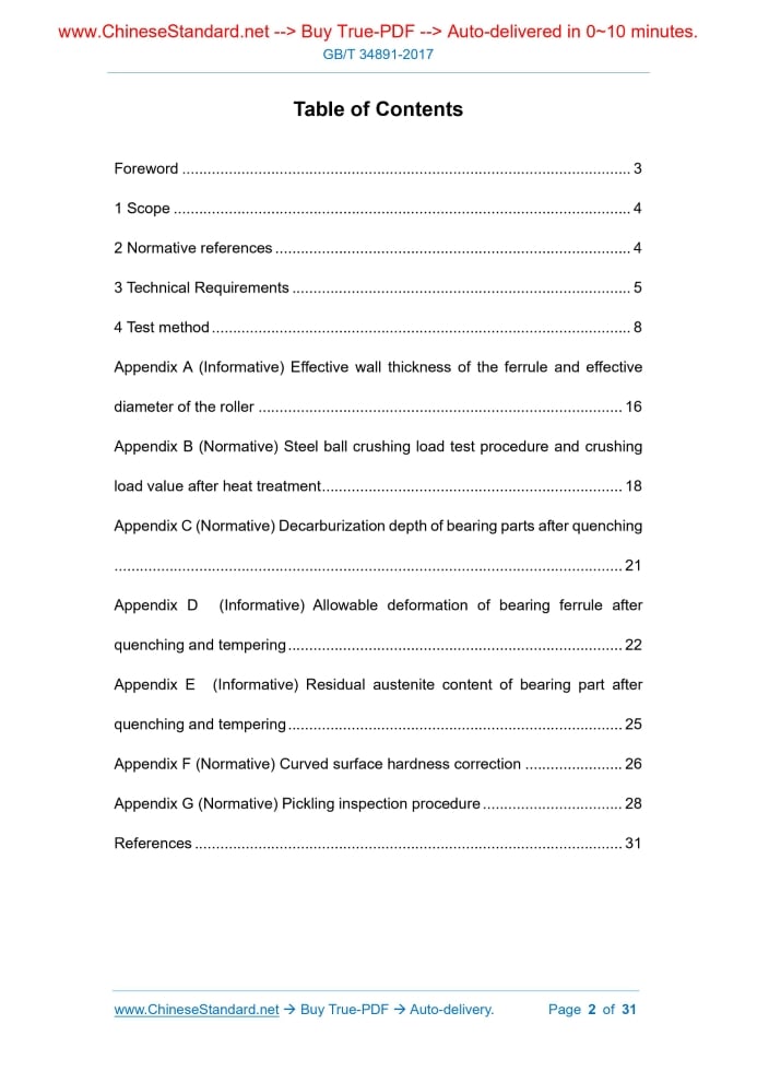 Similar standardsGB/T 34891-2017: Rolling Bearings - Parts Made from High-carbon Chromium Bearing Steels - Specifications for Heat Treatment---This is an excerpt. Full copy of true-PDF in English version (including equations, symbols, images, flow-chart, tables, and figures etc.), auto-downloaded/delivered in 9 seconds, can be purchased online: https://www.ChineseStandard.net/PDF.aspx/GBT34891-2017 NATIONAL STANDARD OF THE PEOPLE’S REPUBLIC OF CHINA ICS 21.100.20 J 11 Rolling Bearings - Parts Made from High-carbon Chromium Bearing Steels - Specifications for Heat Treatment Issued on. NOVEMBER 01, 2017 Implemented on. MAY 01, 2018 Issued by. General Administration of Quality Supervision, Inspection and Quarantine; Standardization Administration of the People's Republic of China. Table of ContentsForeword... 3 1 Scope... 4 2 Normative references... 4 3 Technical Requirements... 5 4 Test method... 8 Appendix A (Informative) Effective wall thickness of the ferrule and effective diameter of the roller... 16 Appendix B (Normative) Steel ball crushing load test procedure and crushing load value after heat treatment... 18 Appendix C (Normative) Decarburization depth of bearing parts after quenching ... 21 Appendix D (Informative) Allowable deformation of bearing ferrule after quenching and tempering... 22 Appendix E (Informative) Residual austenite content of bearing part after quenching and tempering... 25 Appendix F (Normative) Curved surface hardness correction... 26 Appendix G (Normative) Pickling inspection procedure... 28 References... 31ForewordThis Standard was drafted in accordance with the rules given in GB/T 1.1-2009. This Standard was proposed by China Machinery Industry Federation. This Standard shall be under the jurisdiction of National Rolling Bearing Standardization Technical Committee (SAC/TC 98). The drafting organizations of this Standard. Luoyang Bearing Research Institute Co., Ltd., Zhejiang Tianma Bearing Group Limited Company, Zhejiang XCC Group Co., Ltd., Dong’e Shandong Steel Ball Group Co., Ltd., Jiangsu Lixing General Steel Ball Co., Ltd., Pizhou Power-Steering Bearing Co., Ltd., Xinchang Hengli Bearings Co., Ltd., Shandong Yujie Bearing Manufacturing Co., Ltd., Hebei Xintai Bearing Forging Co., Ltd., Zhejiang Jinhuan Bearing Co., Ltd., Yanshan University, Ruilian Machinery (Hangzhou) Co., Ltd., Dong E County Hua Tao Steel Ball Co., Ltd. Zhejiang Zhongji Casting & Forging Co., Ltd., Changzhou Longpont Lube Co., Ltd., Chongqing Changjiang Bearing Co., Ltd. The drafters of this Standard. Lei Jianzhong, Shi Dafang, Wang Mingzhou, Hu Linzhuang, Yang Yong, Ma Lin, Mei Yali, Zhang Yunxi, Xiao Caichao, Cai Meigui, Li Jingui, Dong Guanjun, Zhang Fucheng, Zhang Zhenhua, Fan Zhiguo, Hu Weiyong, Geng Wei, Zhao Xingxin. Rolling Bearings - Parts Made from High-carbon Chromium Bearing Steels - Specifications for Heat Treatment1 ScopeThis Standard specifies the technical requirements and test methods for annealing, quenching and tempering of G8Cr15, GCr15, GCr15SiMn, GCr15SiMo, GCr18Mo steel rolling bearing rings and rolling elements (hereinafter referred to as bearing parts) in accordance with GB/T 18254. This Standard is applicable to the heat treatment quality inspection of the above-mentioned steel bearing parts process and finished parts, and also to the heat treatment quality inspection of other high-carbon chromium steel bearing parts. For bearing parts with special requirements, perform according to the specifications of corresponding product drawings.2 Normative referencesThe following documents are indispensable for the application of this document. For dated references, only the dated version applies to this document. For undated references, the latest edition (including all amendments) applies to this document. GB/T 230.1-2009, Metallic materials. Rockwell hardness test. Part 1.Test method (scales A, B, C, D, E, F, G, H, K, N, T) GB/T 231.1, Metallic materials. Brinell hardness test. Part 1.Test method GB/T 272-2017, Rolling bearings. Identification code GB/T 1172, Conversion of hardness and strength for ferrous metal GB/T 4340.1, Metallic materials. Vickers hardness test. Part 1.Test method GB/T 6394, Determination of estimating the average grain size of metal GB/T 17394, Metallic materials - Leeb hardness test GB/T 24606, Rolling bearings. Non-destructive testing. Magnetic particle testing JB/T 7361, Rolling bearings. Test method for hardness of parts JB/T 7362, Rolling bearing. Determination of decarburized depth for parts3 Technical Requirements3.1 Technical requirements of bearing parts after spheroidizing annealing The technical requirements of bearing parts after spheroidizing annealing are as specified Table 1. 3.2 Technical requirements of bearing parts after martensite quenching and tempering4 Test methodThe test method is as specified in Table 7.Appendix A(Informative) Effective wall thickness of the ferrule and effective diameter of the roller For the effective wall thickness of the ferrule and the effective diameter of the roller, see Figure A.1.Appendix B(Normative) Steel ball crushing load test procedure and crushing load value after heat treatment B.1 Scope This appendix specifies the crushing load test procedure and crushing load value for steel balls whose nominal diameter is ɸ3 mm ~ ɸ50.8 mm. B.2 Steel ball crushing load test procedure B.2.1 For each batch of heat-treated steel balls, take three sets of balls (9 pieces) for the ball crushing load test. The dimensional tolerances of the steel balls shall be the same. B.2.2 When the semi-finished steel ball after heat treatment is taken for the crushing test, the surface of the steel ball is not allowed to have surface defects such as wheel injury, pit, bump or pitting. B.2.3 When the crushing test is carried out, the loading speed can be loaded as per 980 N/s ~ 5 880 N/s. ......Source: Above contents are excerpted from the full-copy PDF -- translated/reviewed by: www.ChineseStandard.net / Wayne Zh