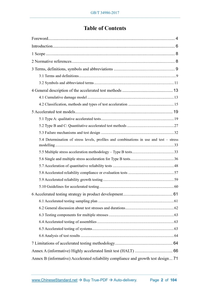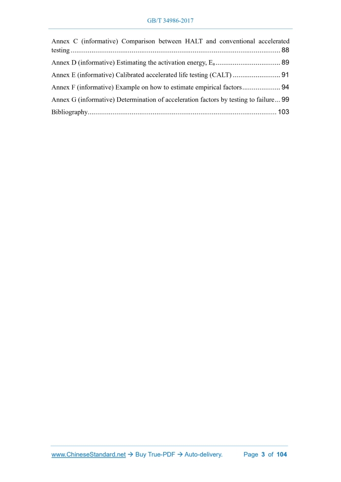 Similar standardsGB/T 34986-2017: Methods for product accelerated testing---This is an excerpt. Full copy of true-PDF in English version (including equations, symbols, images, flow-chart, tables, and figures etc.), auto-downloaded/delivered in 9 seconds, can be purchased online: https://www.ChineseStandard.net/PDF.aspx/GBT34986-2017NATIONAL STANDARD OF THE PEOPLE’S REPUBLIC OF CHINA ICS 03.120.01;03.120.30 L 05 GB/T 34986-2017 / IEC 62506.2013 Methods for product accelerated testing (IEC 62506.2013, IDT) Issued on. NOVEMBER 01, 2017 Implemented on. MAY 01, 2018 Issued by. General Administration of Quality Supervision, Inspection and Quarantine; Standardization Administration of the People’s Republic of China. Table of ContentsForeword... 4 Introduction... 6 1 Scope... 8 2 Normative references... 8 3 Terms, definitions, symbols and abbreviations... 9 3.1 Terms and definitions... 9 3.2 Symbols and abbreviated terms... 11 4 General description of the accelerated test methods... 13 4.1 Cumulative damage model... 13 4.2 Classification, methods and types of test acceleration... 15 5 Accelerated test models... 19 5.1 Type A. qualitative accelerated tests... 19 5.2 Type B and C. Quantitative accelerated test methods... 27 5.3 Failure mechanisms and test design... 32 5.4 Determination of stress levels, profiles and combinations in use and test – stress modelling... 33 5.5 Multiple stress acceleration methodology – Type B tests... 33 5.6 Single and multiple stress acceleration for Type B tests... 36 5.7 Acceleration of quantitative reliability tests... 48 5.8 Accelerated reliability compliance or evaluation tests... 57 5.9 Accelerated reliability growth testing... 59 5.10 Guidelines for accelerated testing... 60 6 Accelerated testing strategy in product development... 61 6.1 Accelerated testing sampling plan... 61 6.2 General discussion about test stresses and durations... 62 6.3 Testing components for multiple stresses... 63 6.4 Accelerated testing of assemblies... 63 6.5 Accelerated testing of systems... 63 6.6 Analysis of test results... 64 7 Limitations of accelerated testing methodology... 64 Annex A (informative) Highly accelerated limit test (HALT)... 66 Annex B (informative) Accelerated reliability compliance and growth test design... 71 Annex C (informative) Comparison between HALT and conventional accelerated testing... 88 Annex D (informative) Estimating the activation energy, Ea... 89 Annex E (informative) Calibrated accelerated life testing (CALT)... 91 Annex F (informative) Example on how to estimate empirical factors... 94 Annex G (informative) Determination of acceleration factors by testing to failure... 99 Bibliography... 103ForewordThis Standard was drafted in accordance with the rules given in GB/T 1.1-2009. This Standard uses the translation method to equivalently adopt IEC 62506.2013 “Methods for product accelerated testing”. The documents of our country that have a consistent correspondence with the international documents that are referenced in this Standard are as follows. -- GB/T 5080.1-2012, Reliability testing - Part 1.Test conditions and statistical test principles (IEC 60300-3-5.2001, IDT) This Standard, compared with IEC 62506.2013, makes the following editorial changes. -- “a minimum 30 000 h per year” in the original text 5.2.3.1.3 is wrong; it shall be “a minimum 3 000 h per year”; -- “as the time compression may influence the stress acceleration” in the original text 5.2.3.2.1 is wrong; it shall be “as the event compression may influence the stress acceleration”; -- “Equation (3) presents a rather accurate way of expressing the overall item failure rate with applied stresses” in the original text 5.5 is wrong; it shall be “Equation (4) presents a rather accurate way of expressing the overall item failure rate with applied stresses"; -- “n1/N1”, “l1/L1” and “αi is the time at the ith stress level” in the original text 5.6.3.2 are wrong; they shall be “ni/Ni”, “li/Li” and “αi is the ratio of the time at the ith stress level to the life under applied loads”; -- S in equation (B.22) in the original Annex B shall be NS; -- “One in this group failed after 700 cycles and 10 after 1000 cycles.” and “In this second test group B, 4 failed after 300 cycles, 10 after 400 cycles, and additional 5 after 500 cycles” in Annex F of the original text are wrong; they shall be “One in this group failed after 700 cycles and 3 after 1 000 cycles.” and “In this second test group B, 5 failed after 300 cycles, 10 after 400 cycles, and additional 5 after 500 cycles.”; -- “265V” in Figure G.1 of Annex G of the original text is wrong; it shall be “25V”; the curve fitting equation, equation (G.1) and equation (G.2) in Figure G.2 are wrong and corrected. This Standard was proposed by the Ministry of Industry and Information Technology of the People's Republic of China. This Standard shall be under the jurisdiction of National Technical Committee 24 on Electric and Electronic Reliability and Maintainability of Standardization Administration of China (SAC/TC 24). The drafting organizations of this Standard. The Fifth Institute of Electronics, Ministry of Industry and Information Technology, Wuhu Saibao Information Industry Technology Research Institute Co., Ltd., Institute of Electronic Engineering, Chinese Academy of Engineering Physics, The 60th Research Institute of the General Staff, The 29th Research Institute of China Electronics Technology Group Corporation, Zhongxing Telecommunication Equipment Corporation, Shenzhen TCL New Technology Ltd., Hisense Group Co., Ltd., Chongqing Electric Power Research Institute, The 28th Research Institute of China Electronics Technology Group Corporation, Shanghai Institute of Process Automation & Instrumentation, AVIC 301 Institute. The drafters of this Standard. Wang Xuekong, Hu Xianghong, Li Kai, Cheng Debin, Gao Jun, Li Jing, Xie Limei, Liu Yazhi, Zhu Liang, Jiang Nian