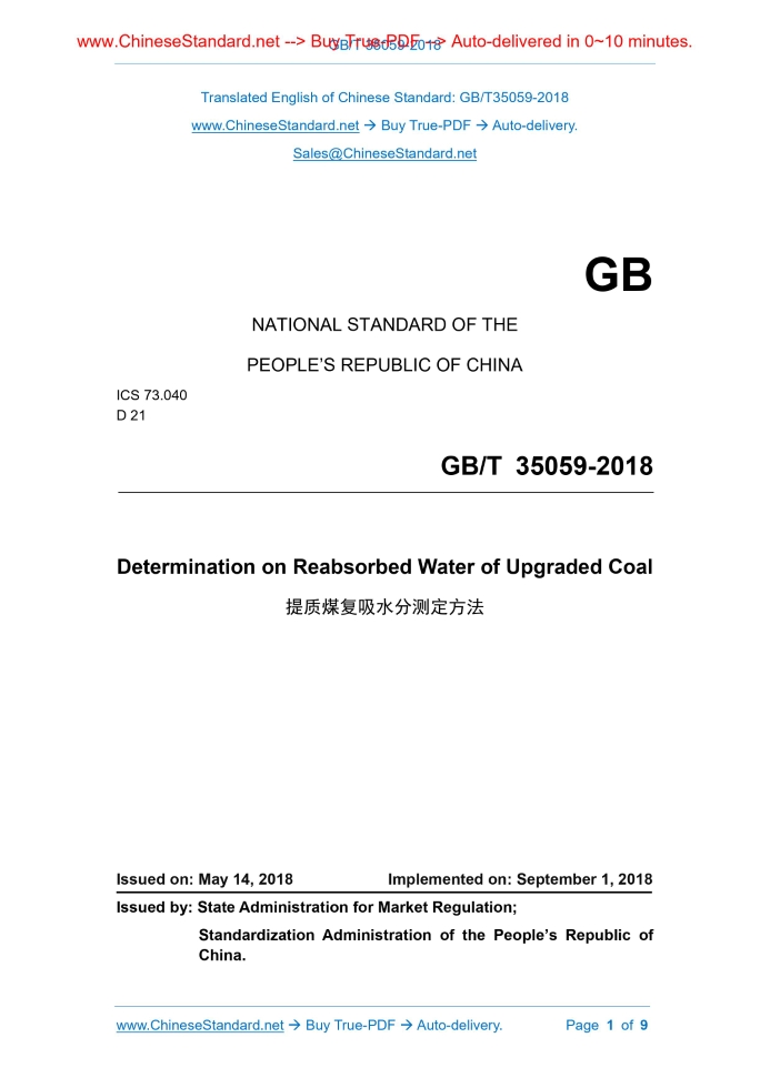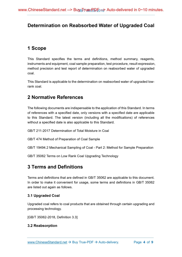 GB/T 35059-2018: Determination on reabsorbed water of upgraded coal Delivery: 9 seconds. True-PDF full-copy in English & invoice will be downloaded + auto-delivered via email. See step-by-step procedure Status: Valid