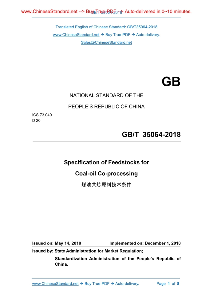 GB/T 35064-2018: Specification of feedstocks for coal-oil co-processing Delivery: 9 seconds. True-PDF full-copy in English & invoice will be downloaded + auto-delivered via email. See step-by-step procedure Status: Valid