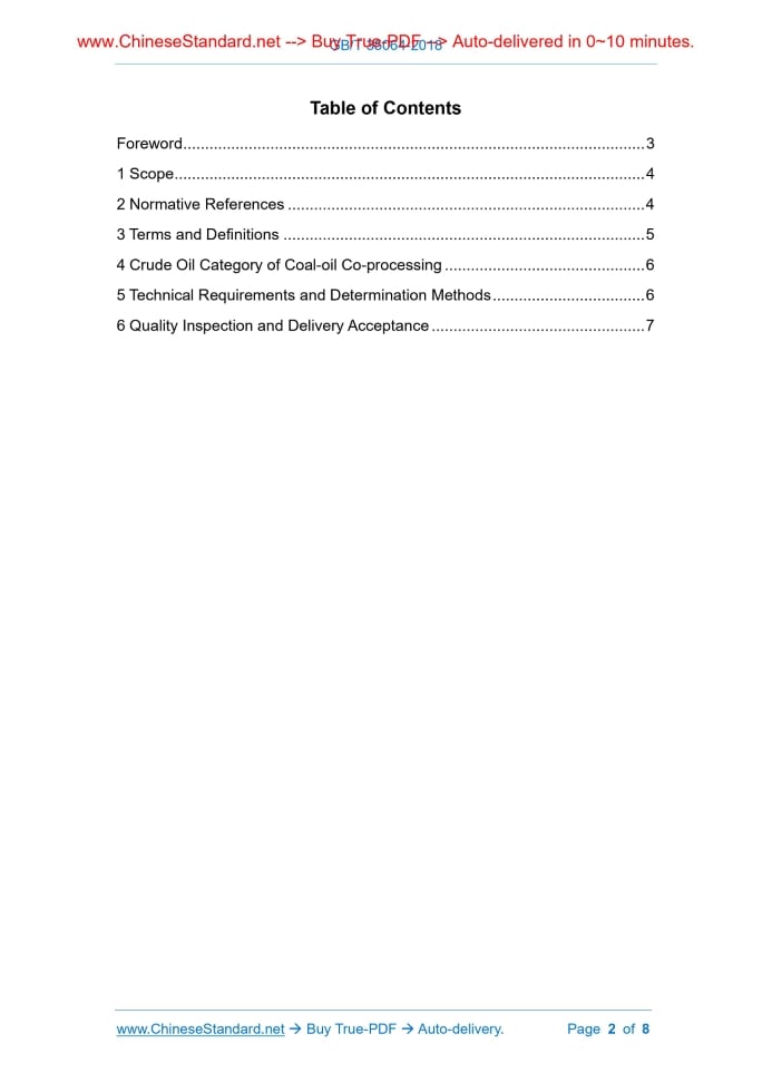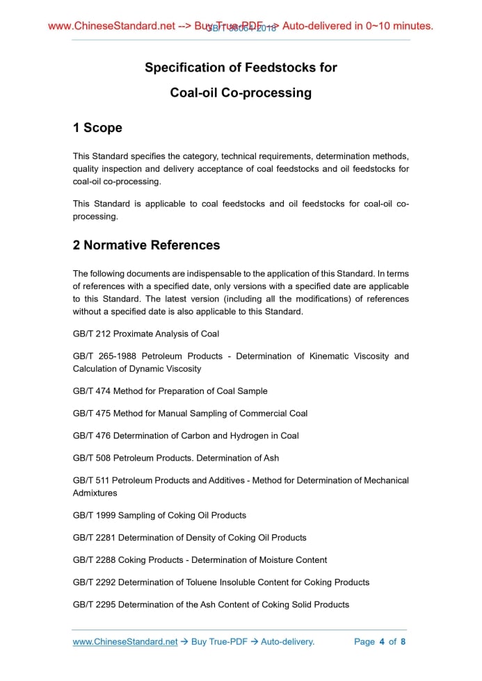 Similar standardsGB/T 35064-2018: Specification of feedstocks for coal-oil co-processing---This is an excerpt. Full copy of true-PDF in English version (including equations, symbols, images, flow-chart, tables, and figures etc.), auto-downloaded/delivered in 9 seconds, can be purchased online: https://www.ChineseStandard.net/PDF.aspx/GBT35064-2018GB NATIONAL STANDARD OF THE PEOPLE’S REPUBLIC OF CHINA ICS 73.040 D 20 Specification of Feedstocks for Coal-oil Co-processing Issued on: MAY 14, 2018 Implemented on: DECEMBER 1, 2018 Issued by. State Administration for Market Regulation; Standardization Administration of the People’s Republic of China. Table of ContentsForeword ... 3 1 Scope ... 4 2 Normative References ... 4 3 Terms and Definitions ... 5 4 Crude Oil Category of Coal-oil Co-processing ... 6 5 Technical Requirements and Determination Methods ... 6 6 Quality Inspection and Delivery Acceptance ... 7 Specification of Feedstocks for Coal-oil Co-processing1 ScopeThis Standard specifies the category, technical requirements, determination methods, quality inspection and delivery acceptance of coal feedstocks and oil feedstocks for coal-oil co-processing. This Standard is applicable to coal feedstocks and oil feedstocks for coal-oil co- processing.2 Normative ReferencesThe following documents are indispensable to the application of this Standard. In terms of references with a specified date, only versions with a specified date are applicable to this Standard. The latest version (including all the modifications) of references without a specified date is also applicable to this Standard. GB/T 212 Proximate Analysis of Coal GB/T 265-1988 Petroleum Products - Determination of Kinematic Viscosity and Calculation of Dynamic Viscosity GB/T 474 Method for Preparation of Coal Sample GB/T 475 Method for Manual Sampling of Commercial Coal GB/T 476 Determination of Carbon and Hydrogen in Coal GB/T 508 Petroleum Products. Determination of Ash GB/T 511 Petroleum Products and Additives - Method for Determination of Mechanical Admixtures GB/T 1999 Sampling of Coking Oil Products GB/T 2281 Determination of Density of Coking Oil Products GB/T 2288 Coking Products - Determination of Moisture Content GB/T 2292 Determination of Toluene Insoluble Content for Coking Products GB/T 2295 Determination of the Ash Content of Coking Solid Products GB/T 2565 Determination of Grindability Index of Coal – Hard Grove Method GB/T 4756 Method for Manual Sampling of Petroleum Liquids GB/T 5751 Chinese Classification of Coals GB/T 6948 Method of Determining Microscopically the Reflectance of Vitrinite in Coal GB/T 8899 Methods for Coal Maceral Grouping and Mineral Determination GB/T 8929 Crude Oil - Determination of Water - Distillation Method GB/T 11137 Black Petroleum Products - Determination of Kinematic Viscosity (reverse - flow method) and Calculation of Dynamic Viscosity GB/T 13377 Crude Petroleum and Liquid or Solid Petroleum Products - Determination of Density or Relative Density - Capillary Stoppered Pycnometer and Graduated Bicarpellary Pycnometer Methods GB/T 18666 Method for Quality Spot Check and Acceptance of Commercial Coal GB/T 19494.1 Mechanical Sampling of Coal - Part 1. Method for Sampling GB/T 19494.2 Mechanical Sampling of Coal - Part 2. Method for Sample Preparation GB/T 24209 Determination of the Viscosity of Washing Oil SH/T 0656 Standard Test Methods for Instrumental Determination of Carbon, Hydrogen, and Nitrogen in Petroleum Products and Lubricants SH/T 0793 Standard Test Method for Aromatic Carbon Contents of Hydrocarbon Oils by High Resolution Nuclear Magnetic Resonance Spectroscopy3 Terms and DefinitionsThe following terms and definitions are applicable to this document. 3.1 Coal-oil Co-processing Coal-oil co-processing refers to the technology of preparing coal powder and heavy- oil into coal-oil slurry (mass fraction. 25% ~ 50%) at a certain proportion; triggering hydrogenation reaction with hydrogen at a certain temperature and pressure; triggering splitting decomposition of coal and heavy oil, which generates light oil products and gas. 3.2 Petroleum-based Heavy Oil Petroleum-based heavy oil refers to heavy oil products that are generated through low- ......Source: Above contents are excerpted from the full-copy PDF -- translated/reviewed by: www.ChineseStandard.net / Wayne Zheng et al. Tips & Frequently Asked Questions:Question 1: How long will the true-PDF of English version of GB/T 35064-2018 be delivered?Answer: The full copy PDF of English version of GB/T 35064-2018 can be downloaded in 9 seconds, and it will also be emailed to you in 9 seconds (double mechanisms to ensure the delivery reliably), with PDF-invoice.Question 2: Can I share the purchased PDF of GB/T 35064-2018_English with my colleagues?Answer: Yes. The purchased PDF of GB/T 35064-2018_English will be deemed to be sold to your employer/organization who actually paid for it, including your colleagues and your employer's intranet.Question 3: Does the price include tax/VAT?Answer: Yes. Our tax invoice, downloaded/delivered in 9 seconds, includes all tax/VAT and complies with 100+ countries' tax regulations (tax exempted in 100+ countries) -- See Avoidance of Double Taxation Agreements (DTAs): List of DTAs signed between Singapore and 100+ countriesQuestion 4: Do you accept my currency other than USD?Answer: Yes. www.ChineseStandard.us -- GB/T 35064-2018 -- Click this link and select your country/currency to pay, the exact amount in your currency will be printed on the invoice. Full PDF will also be downloaded/emailed in 9 seconds.How to buy and download a true PDF of English version of GB/T 35064-2018?A step-by-step guide to download PDF of GB/T 35064-2018_EnglishStep 1: Visit website https://www.ChineseStandard.net (Pay in USD), or https://www.ChineseStandard.us (Pay in any currencies such as Euro, KRW, JPY, AUD).Step 2: Search keyword "GB/T 35064-2018". Step 3: Click "Add to Cart". If multiple PDFs are required, repea
