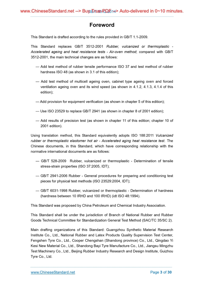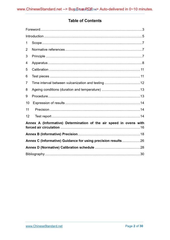 GB/T 3512-2014: Rubber, vulcanized or thermoplastic -- Accelerated ageing and heat resistance tests -- Air-oven method---This is an excerpt. Full copy of true-PDF in English version (including equations, symbols, images, flow-chart, tables, and figures etc.), auto-downloaded/delivered in 9 seconds, can be purchased online: https://www.ChineseStandard.net/PDF.aspx/GBT3512-2014 GB NATIONAL STANDARD OF THE PEOPLE’S REPUBLIC OF CHINA ICS 83.060 G 40 GB/T 3512-2014 / ISO 188.2011 Replacing GB/T 3512-2001 Issued on. DECEMBER 22, 2014 Implemented on. JUNE 01, 2015 Issued by. General Administration of Quality Supervision, Inspection and Quarantine of the People's Republic of China; Standardization Administration of the People's Republic of China. Table of ContentsForeword... 3 Introduction... 5 1 Scope... 7 2 Normative references... 7 3 Principle... 7 4 Apparatus... 8 5 Calibration... 11 6 Test pieces... 11 7 Time interval between vulcanization and testing... 12 8 Ageing conditions (duration and temperature)... 13 9 Procedure... 13 10 Expression of results... 14 11 Precision... 14 12 Test report... 14 Annex A (Informative) Determination of the air speed in ovens with forced air circulation... 16 Annex B (Informative) Precision... 18 Annex C (Informative) Guidance for using precision results... 26 Annex D (Normative) Calibration schedule... 28 Bibliography... 30ForewordThis Standard is drafted according to the rules provided in GB/T 1.1-2009. This Standard replaces GB/T 3512-2001 Rubber, vulcanized or thermoplastic - Accelerated ageing and heat resistance tests - Air-oven method; compared with GB/T 3512-2001, the main technical changes are as follows. — Add test method of rubber tensile performance ISO 37 and test method of rubber hardness ISO 48 (as shown in 3.1 of this edition); — Add test method of multicell ageing oven, cabinet type ageing oven and forced ventilation ageing oven and its wind speed (as shown in 4.1.2, 4.1.3, 4.1.4 of this edition); — Add provision for equipment verification (as shown in chapter 5 of this edition); — Use ISO 23529 to replace GB/T 2941 (as shown in chapter 8 of 2001 edition); — Add results of precision test (as shown in chapter 11 of this edition; chapter 10 of 2001 edition). Using translation method, this Standard equivalently adopts ISO 188.2011 Vulcanized rubber or thermoplastic elastomer hot air - Accelerated aging heat resistance test. The Chinese documents, in this Standard, which have corresponding relationship with the normative international documents are as follows. — GB/T 528-2009 Rubber, vulcanized or thermoplastic - Determination of tensile stress-strain properties (ISO 37.2005, IDT); — GB/T 2941-2006 Rubber - General procedures for preparing and conditioning test pieces for physical test methods (ISO 23529.2004, IDT); — GB/T 6031-1998 Rubber, vulcanized or thermoplastic - Determination of hardness (hardness between 10 IRHD and 100 IRHD) (idt ISO 48.1994). This Standard was proposed by China Petroleum and Chemical Industry Association. This Standard shall be under the jurisdiction of Branch of National Rubber and Rubber Goods Technical Committee for Standardization General Test Method (SAC/TC 35/SC 2). Main drafting organizations of this Standard. Guangzhou Synthetic Material Research Institute Co., Ltd., National Rubber and Latex Products Quality Supervision Test Center, Fengshen Tyre Co., Ltd., Cooper Chengshan (Shandong province) Co., Ltd., Qingdao Yi Kesi New Material Co., Ltd., Shandong Bayi Tyre Manufacture Co., Ltd., Jiangsu Mingzhu Test Machinery Co., Ltd., Beijing Rubber Industry Research and Design Institute, Guizhou Tyre Co., Ltd. Main drafters of this Standard. Xie Yufang, Yi Jun, Dao Jinahua, Zheng Xiangqian, Ren Shaowen, Wang Jianfeng, Lin Qingju, Wang Daiqiang, Liu Qiang, Zhao Jianlin, Zhu Ming, Xie Junfang, Li Jing, Feng Ping. The historical versions replaced by this Standard are as follows. — GB/T 3512-1983 (1989), GB/T 3512-2001.1 ScopeThis Standard specifies accelerated ageing or heat resistance tests on vulcanized or thermoplastic rubbers. Two methods are given.2 Normative referencesThe articles contained in the following documents have become part of this document when they are quoted herein. For the dated documents so quoted, all the modifications (including all corrections) or revisions made thereafter shall be applicable to this document. GB/T 25269-2010 Rubber - Guide to the calibration of test equipment (ISO 18899.2004, IDT)3 PrincipleTest pieces are subjected to controlled deterioration by air at an elevated temperature and at atmospheric pressure, after which specified properties are measured and compared with those of unaged test pieces.4 ApparatusThe oven shall be of such a size that the total volume of the test pieces does not exceed 10 % of the free space in the oven. Provision shall be made for suspending test pieces so that they are at least 10 mm from each other and, in cabinet ovens and ovens with forced air circulation, at least 50 mm from the sides of the oven.5 CalibrationThe test apparatus shall be calibrated in accordance with Annex D.6 Test piecesIt is recommended that the accelerated ageing or heat resistance test be carried out on test pieces prepared and conditioned as required for the appropriate property tests, and not on complete products or sample sheets, and that their form be such that no mechanical, chemical or heat treatment will be required after ageing.7 Time interval between vulcanization and testingUnless otherwise specified for technical reasons, the following requirements shall be observed.8 Ageing conditions (duration and temperature)The period required to obtain a given degree of deterioration of the test pieces will depend upon the type of rubber under examination.9 ProcedureHeat the oven to the operating temperature and place the test pieces in it.10 Expression of resultsThe results shall be expressed in accordance with the International Standard for the appropriate p