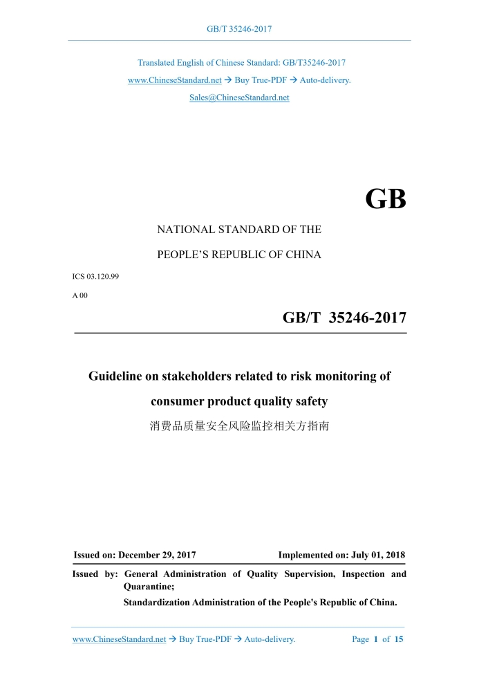 GB/T 35246-2017: Guideline on stakeholders related to risk monitoring of consumer product quality safety Delivery: 9 seconds. True-PDF full-copy in English & invoice will be downloaded + auto-delivered via email. See step-by-step procedure Status: Valid
