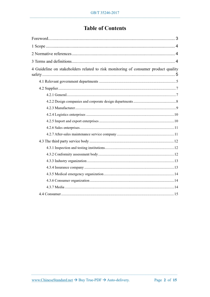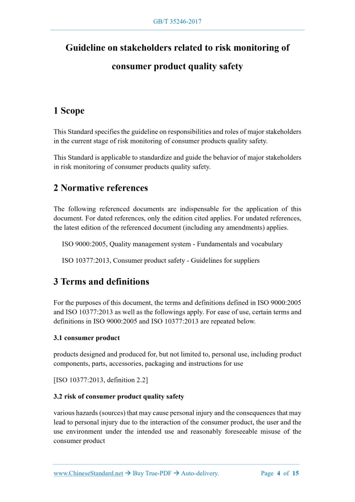 Similar standardsGB/T 35246-2017: Guideline on stakeholders related to risk monitoring of consumer product quality safety---This is an excerpt. Full copy of true-PDF in English version (including equations, symbols, images, flow-chart, tables, and figures etc.), auto-downloaded/delivered in 9 seconds, can be purchased online: https://www.ChineseStandard.net/PDF.aspx/GBT35246-2017 NATIONAL STANDARD OF THE PEOPLE’S REPUBLIC OF CHINA ICS 03.120.99 A 00 Guideline on stakeholders related to risk monitoring of consumer product quality safety ISSUED ON: DECEMBER 29, 2017 IMPLEMENTED ON: JULY 01, 2018 Issued by: General Administration of Quality Supervision, Inspection and Quarantine; Standardization Administration of the People's Republic of China. Table of ContentsForeword ... 3 1 Scope ... 4 2 Normative references ... 4 3 Terms and definitions... 4 4 Guideline on stakeholders related to risk monitoring of consumer product quality safety ... 5 4.1 Relevant government departments ... 5 4.2 Supplier ... 7 4.2.1 General ... 7 4.2.2 Design companies and corporate design departments ... 8 4.2.3 Manufacturer ... 9 4.2.4 Logistics enterprises ... 10 4.2.5 Import and export enterprises ... 10 4.2.6 Sales enterprises ... 11 4.2.7 After-sales maintenance service company ... 11 4.3 The third party service body ... 12 4.3.1 Inspection and testing institutions ... 12 4.3.2 Conformity assessment body ... 12 4.3.3 Industry organization ... 13 4.3.4 Insurance company ... 13 4.3.5 Medical emergency organization ... 14 4.3.6 Consumer organization ... 14 4.3.7 Media ... 14 4.4 Consumer ... 15 Guideline on stakeholders related to risk monitoring of consumer product quality safety1 ScopeThis Standard specifies the guideline on responsibilities and roles of major stakeholders in the current stage of risk monitoring of consumer products quality safety. This Standard is applicable to standardize and guide the behavior of major stakeholders in risk monitoring of consumer products quality safety.2 Normative referencesThe following referenced documents are indispensable for the application of this document. For dated references, only the edition cited applies. For undated references, the latest edition of the referenced document (including any amendments) applies. ISO 9000:2005, Quality management system - Fundamentals and vocabulary ISO 10377:2013, Consumer product safety - Guidelines for suppliers3 Terms and definitionsFor the purposes of this document, the terms and definitions defined in ISO 9000:2005 and ISO 10377:2013 as well as the followings apply. For ease of use, certain terms and definitions in ISO 9000:2005 and ISO 10377:2013 are repeated below. 3.1 consumer product products designed and produced for, but not limited to, personal use, including product components, parts, accessories, packaging and instructions for use [ISO 10377:2013, definition 2.2] 3.2 risk of consumer product quality safety various hazards (sources) that may cause personal injury and the consequences that may lead to personal injury due to the interaction of the consumer product, the user and the use environment under the intended use and reasonably foreseeable misuse of the consumer product - Vigorously promote the normalization of risk monitoring. Make efforts to improve emergency monitoring capabilities; - In response to product quality and safety injury accidents and emergencies, timely organize and implement emergency special risk monitoring. Quickly find the source of risk and cause of injury accident; - Innovative risk monitoring methods. Establish and improve emergency monitoring plans. Optimize emergency monitoring process. Strengthen emergency monitoring capabilities. Give full play to the role of risk monitoring in emergency response to product quality and safety emergencies. h) Establish a timely, powerful and long-term risk disposal mechanism, including but not limited to the following: - Based on the risk assessment results, issue risk warnings to the society in a timely manner; - Carry out risk communication. Strengthen regulatory linkages. Sort out the identified and confirmed product quality safety risks. Distinguish the difference. Timely feedback. Make classified processing; - Facilitate risk communication. Establish a unified national notification and early warning system for product quality safety risk. Enable rapid response and disposal of risks. Avoid systemic, regional and industrial quality and safety issues; - Promote the normalization of risk communication work. Constantly expand the scope of communication. i) Create an incentive system. Encourage operators to implement scientific quality safety risk management methods. Encourage scientific research institutions and inspection and testing departments to increase the research and development of technology for risk monitoring of consumer products quality safety. j) If it is found and determined that the goods or services provided by the operator are defective and endanger personal and property safety, operators shall be immediately ordered to take measures such as cessation of sales, warning, recall, harmless disposal, destruction, cessation of production or service. 4.2 Supplier 4.2.1 General Different suppliers play different but crucial main responsibilities and roles in the quality safety risk monitoring of the entire life cycle of consumer product design, manufacturing, logistics, sales, use, maintenance, and disposal. In the process of risk monitoring of consumer products quality safety, suppliers shall pay attention to but not limited to the following key issues: a) Build a safety culture within the organization. Establish safety risk control awareness; b) Establish a security risk control system; c) Conduct safety training and education for employees; d) Consumer products are designed with safety considerations in mind; e) Identify potential hazards of the product; f) Identify or estimate potential hazards; g) Assess risks to consumer health and safety; 
