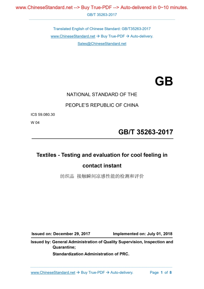 GB/T 35263-2017: Textiles -- Testing and evaluation for cool feeling in contact instant Delivery: 9 seconds. True-PDF full-copy in English & invoice will be downloaded + auto-delivered via email. See step-by-step procedure Status: Valid