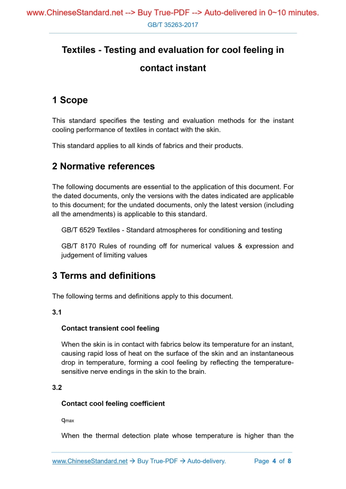 Similar standardsGB/T 35263-2017: Textiles -- Testing and evaluation for cool feeling in contact instant---This is an excerpt. Full copy of true-PDF in English version (including equations, symbols, images, flow-chart, tables, and figures etc.), auto-downloaded/delivered in 9 seconds, can be purchased online: https://www.ChineseStandard.net/PDF.aspx/GBT35263-2017GB NATIONAL STANDARD OF THE PEOPLE’S REPUBLIC OF CHINA ICS 59.080.30 W 04 Textiles - Testing and evaluation for cool feeling in contact instant Issued on. DECEMBER 29, 2017 Implemented on. JULY 01, 2018 Issued by. General Administration of Quality Supervision, Inspection and Quarantine; Standardization Administration of PRC. Table of ContentsForeword... 3 1 Scope... 4 2 Normative references... 4 3 Terms and definitions... 4 4 Principle... 5 5 Test equipment... 5 6 Standard atmosphere for humidity conditioning and test... 6 7 Preparation of specimen... 7 8 Test procedure... 7 9 Result calculation... 7 10 Assessment... 7 11 Test report... 8ForewordThis standard was drafted in accordance with the rules given in GB/T 1.1-2009. This standard was proposed by the China National Textile and Apparel Council. This standard shall be under the jurisdiction of the National Textile Standardization Technical Committee (SAC/TC 209). Drafting organizations of this standard. China Textile Standard (Beijing) Inspection and Certification Center Co., Ltd., Suzhou Jinhui Fiber New Material Co., Ltd., Lutai Textile Co., Ltd., Lianrunxiang (Qingdao) Textile Technology Co., Ltd., Anta (China) Co., Ltd., TOREAD Holding Group Co., Ltd., Shanghai Aili Textile Technology Inspection Co., Ltd., Hosa Industry (Fujian) Co., Ltd., Wenzhou Darong Textile Instrument Co., Ltd., Quanzhou Haitian Material Technology Co., Ltd., Shanghai Haoxing Technology Co., Ltd., Shandong Jining Ruyi Wool Textile Co., Ltd. The main drafters of this standard. Zhang Hui, Wu Jianchun, Wang Baojun, Ren Hening, Tan Hui, Geng Caihua, Jiang Lu, Wu Dawei, Li Su, Chen Baishun, Liang Guobin, Liu Jun, Kong Linghao, Zhang Mengsheng, Chen Liqun, Li Zhongcheng, Du Yuanshu. Textiles - Testing and evaluation for cool feeling in contact instant1 ScopeThis standard specifies the testing and evaluation methods for the instant cooling performance of textiles in contact with the skin. This standard applies to all kinds of fabrics and their products.2 Normative referencesThe following documents are essential to the application of this document. For the dated documents, only the versions with the dates indicated are applicable to this document; for the undated documents, only the latest version (including all the amendments) is applicable to this standard. GB/T 6529 Textiles - Standard atmospheres for conditioning and testing GB/T 8170 Rules of rounding off for numerical values & expression and judgement of limiting values3 Terms and definitionsThe following terms and definitions apply to this document. 3.1 Contact transient cool feeling When the skin is in contact with fabrics below its temperature for an instant, causing rapid loss of heat on the surface of the skin and an instantaneous drop in temperature, forming a cool feeling by reflecting the temperature- sensitive nerve endings in the skin to the brain.4 PrincipleUnder the specified test environmental conditions, contact the thermal detection plate with a temperature higher than the specimen with the specimen; measure the temperature change of the thermal detection plate with time; calculate its contact cooling coefficient (qmax), which can characterize the performance of contact transient cool feeling of the sample. The larger the qmax value, the stronger the skin feels the cooling; the smaller the value, the weaker the skin feels the cooling.5 Test equipmentCool feeling performance tester (see Figure 1), including thermal detection plate, sample loading platform, automatic calculation and recording device. The specific requirements are as follows.6 Standard atmosphere for humidity conditioning and test Perform the humidity conditioning and test for the specimen in the standardatmosphere as specified by GB/T 6529. Sample loading platform Copper plate Temperature sensor Insulating material Specimen7 Preparation of specimenCut 5 representative specimens. The size of each specimen is about 200 mm × 200 mm. Sampling shall avoid defects and wrinkles that affect the test results.8 Test procedure8.1 Set the temperature of the sample loading platform to (20 ± 0.5) °C. Spread the specimen flat on the sample loading platform, with the fabric surface in contact with the skin facing up. 8.3 After the temperature of the thermal detection plate reaches the temperature set in 8.2 and remains stable, cut off the heat source of the thermal detection plate and quickly place it vertically on the specimen, so that the surface of the copper plate is in contact with the fabric. 8.4 Determine all other specimens according to the steps 8.1 ~ 8.3.9 Result calculationCalculate the average value of qmax of 5 specimens. The result shall be rounded to two decimal places according to GB/T 8170.10 AssessmentIf necessary, evaluate the instant cool feeling of the sample. When ΔT = 15 °C, the evaluation index is as shown in Table 1.11 Test reportThe test report shall include the following. ......Source: Above contents are excerpted from the full-copy PDF -- translated/reviewed by: www.ChineseStandard.net / Wayne Zheng et al. Tips & Frequently Asked Questions:Question 1: How long will the true-PDF of English version of GB/T 35263-2017 be delivered?Answer: The full copy PDF of English version of GB/T 35263-2017 can be downloaded in 9 seconds, and it will also be emailed to you in 9 seconds (double mechanisms to ensure the delivery reliably), with PDF-invoice.Question 2: Can I share the purchased PDF of GB/T 35263-2017_English with my colleagues?Answer: Yes. The purchased PDF of GB/T 35263-2017_English will be deemed to be sold to your employer/organization who actually paid 