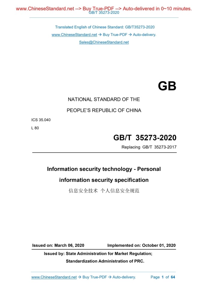 GB/T 35273-2020: Information security technology - Personal information security specification Delivery: 9 seconds. True-PDF full-copy in English & invoice will be downloaded + auto-delivered via email. See step-by-step procedure Status: Valid GB/T 35273: Historical versions