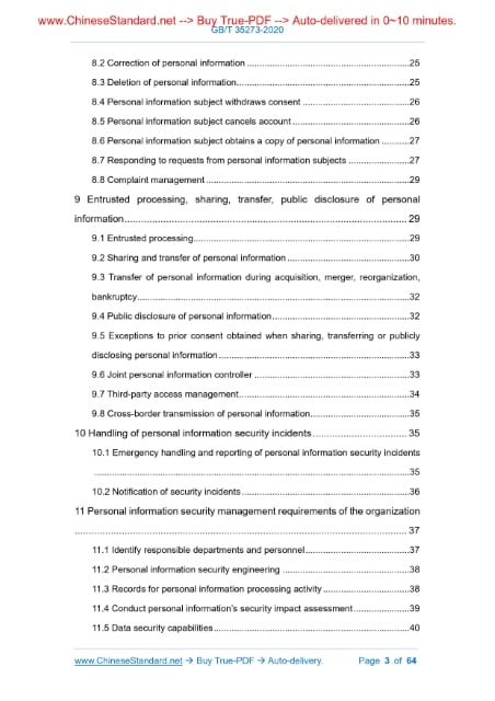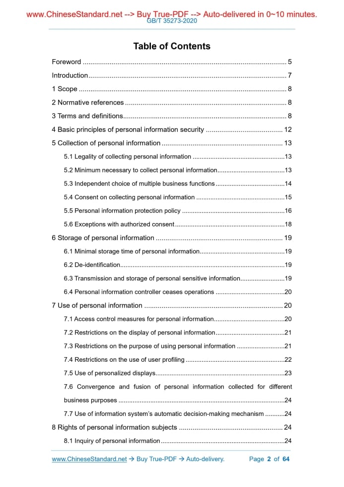 Similar standardsGB/T 35273-2020: Information security technology - Personal information security specification---This is an excerpt. Full copy of true-PDF in English version (including equations, symbols, images, flow-chart, tables, and figures etc.), auto-downloaded/delivered in 9 seconds, can be purchased online: https://www.ChineseStandard.net/PDF.aspx/GBT35273-2020NATIONAL STANDARD OF THE PEOPLE’S REPUBLIC OF CHINA ICS 35.040 L 80 Replacing GB/T 35273-2017 Information security technology - Personal information security specification Issued on. MARCH 06, 2020 Implemented on. OCTOBER 01, 2020 Issued by. State Administration for Market Regulation; Standardization Administration of PRC. Table of ContentsForeword... 5 Introduction... 7 1 Scope... 8 2 Normative references... 8 3 Terms and definitions... 8 4 Basic principles of personal information security... 12 5 Collection of personal information... 13 6 Storage of personal information... 19 7 Use of personal information... 20 8 Rights of personal information subjects... 24 9 Entrusted processing, sharing, transfer, public disclosure of personal information... 29 10 Handling of personal information security incidents... 35 11 Personal information security management requirements of the organization ... 37 Appendix A (Informative) Examples of personal information... 42 Appendix B (Informative) Determination of personal sensitive information... 44 Appendix C (Informative) Method for realizing self-intention of personal information subject... 46 Appendix D (Informative) Template of personal information protection policy 52 References... 631 ScopeThis standard specifies the principles and security requirements for carrying out personal information processing activities such as collection, storage, use, sharing, transfer, public disclosure, deletion, etc. This standard is applicable to regulate personal information processing activities of various organizations, as well as the supervision, management and evaluation of personal information processing activities by organizations such as competent regulatory authorities and third-party evaluation agencies.2 Normative referencesThe following documents are essential to the application of this document. For the dated documents, only the versions with the dates indicated are applicable to this document; for the undated documents, only the latest version (including all the amendments) are applicable to this standard. GB/T 25069-2010 Information security technology - Glossary3 Terms and definitionsThe terms and definitions as defined in GB/T 25069-2010 as well as the following terms and definitions apply to this document. 3.1 Personal information Various information recorded electronically or in other ways that can identify the identity of a particular natural person or reflect the activities of a particular natural person, alone or in combination with other information. 3.2 Personal sensitive information Personal information that, once leaked, illegally provided or abused, may endanger personal and property security, be easy to cause personal reputation, physical and mental health damage or discriminatory treatment. 3.3 Personal information subject Natural persons identified or associated with personal information. 3.4 Personal information controller An organization or individual who has the ability to determine the purpose and method of processing personal information. 3.5 Collect The act of gaining control of personal information. Note 1.This includes activities such as being actively provided by personal 3.6 Explicit consent The personal information subject actively makes statements in paper or electronic form in written, oral, etc., or autonomously makes affirmative actions, to make explicit authorization for the specific processing of their personal information.4 Basic principles of personal information securityPersonal information controllers shall follow the legal, legitimate and necessary principles for carrying out personal information processing activities, including. a) Consistent rights and responsibilities - Take technical and other necessary measures to ensure the security of personal information; take responsibility for the damage caused by the personal information processing activities to the legitimate rights and interests of the personal information subject b) Clear purpose - It has definite, clear and specific personal information processing purpose. c) Choice on consent - Explain to personal information subjects the rules, purposes, methods, scope, etc. of personal information processing; seek their consent. d) Minimum necessary - Only process the minimum type and amount of personal information required to meet the purpose of the consent of the personal information subject. After the purpose is achieved, it shall delete the personal information in time. e) Openness and transparency - Disclose the scope, purpose, rules, etc. of processing the personal information in a clear, understandable and reasonable manner, meanwhile subject to external supervision.5 Collection of personal information5.1 Legality of collecting personal information Requirements for personal information controllers include. 5.3 Independent choice of multiple business functions When a product or service provides multiple business functions that require the collection of personal information, the personal information controller shall not violate the autonomous will of the personal information subject and force the personal information subject to accept the business function provided by the product or service and the corresponding personal information collection request. Requirements for personal information controllers include. 5.4 Consent on collecting personal information Requirements for personal information controllers include. 5.5 Personal information protection policy Requirements for personal information controllers include. 5.6 Exceptions with authorized consent In the following situations, the personal