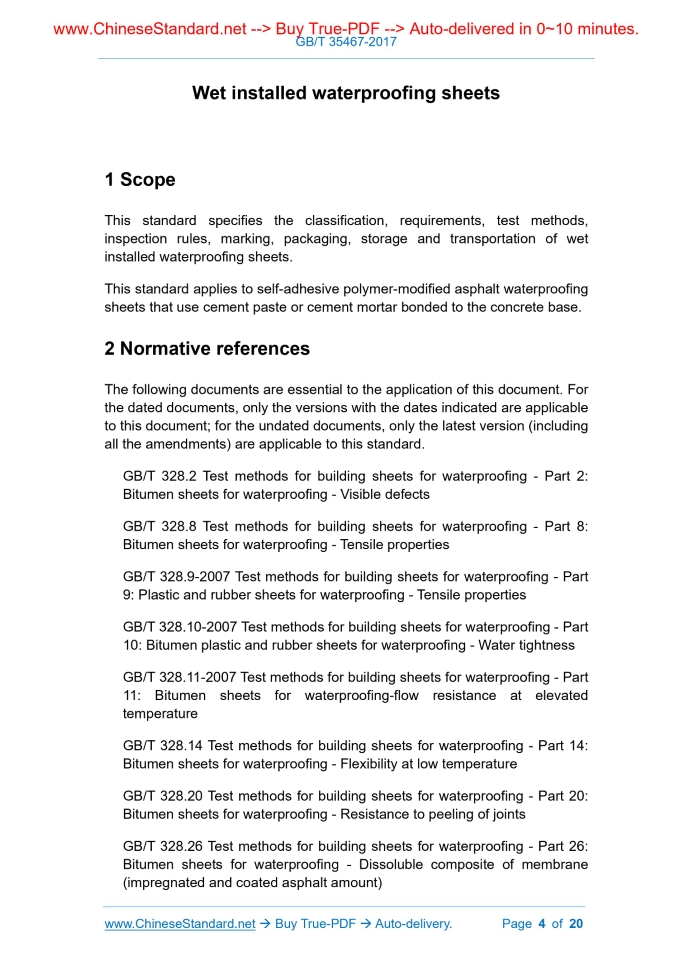 Similar standardsGB/T 35467-2017: Wet installed waterproofing sheets---This is an excerpt. Full copy of true-PDF in English version (including equations, symbols, images, flow-chart, tables, and figures etc.), auto-downloaded/delivered in 9 seconds, can be purchased online: https://www.ChineseStandard.net/PDF.aspx/GBT35467-2017NATIONAL STANDARD OF THE PEOPLE’S REPUBLIC OF CHINA ICS 91.120.30 Q 17 Wet installed waterproofing sheets 湿铺防水卷材 ISSUED ON: DECEMBER 29, 2017 IMPLEMENTED ON: NOVEMBER 01, 2018 Issued by: State Administration for Market Regulation; Standardization Administration of PRC. Table of ContentsForeword ... 3 1 Scope ... 4 2 Normative references ... 4 3 Categories ... 5 4 Requirements ... 5 5 Test method ... 7 6 Inspection rules ... 17 7 Marking, packaging, storage, transportation ... 19 Wet installed waterproofing sheets1 ScopeThis standard specifies the classification, requirements, test methods, inspection rules, marking, packaging, storage and transportation of wet installed waterproofing sheets. This standard applies to self-adhesive polymer-modified asphalt waterproofing sheets that use cement paste or cement mortar bonded to the concrete base.2 Normative referencesThe following documents are essential to the application of this document. For the dated documents, only the versions with the dates indicated are applicable to this document; for the undated documents, only the latest version (including all the amendments) are applicable to this standard. GB/T 328.2 Test methods for building sheets for waterproofing - Part 2: Bitumen sheets for waterproofing - Visible defects GB/T 328.8 Test methods for building sheets for waterproofing - Part 8: Bitumen sheets for waterproofing - Tensile properties GB/T 328.9-2007 Test methods for building sheets for waterproofing - Part 9: Plastic and rubber sheets for waterproofing - Tensile properties GB/T 328.10-2007 Test methods for building sheets for waterproofing - Part 10: Bitumen plastic and rubber sheets for waterproofing - Water tightness GB/T 328.11-2007 Test methods for building sheets for waterproofing - Part 11: Bitumen sheets for waterproofing-flow resistance at elevated temperature GB/T 328.14 Test methods for building sheets for waterproofing - Part 14: Bitumen sheets for waterproofing - Flexibility at low temperature GB/T 328.20 Test methods for building sheets for waterproofing - Part 20: Bitumen sheets for waterproofing - Resistance to peeling of joints GB/T 328.26 Test methods for building sheets for waterproofing - Part 26: Bitumen sheets for waterproofing - Dissoluble composite of membrane (impregnated and coated asphalt amount) GB/T 529-2008 Rubber, vulcanized or thermoplastic - Determination of tear strength (Trouser, angle and crescent samples) JG/T 245 Vibrating table for concrete test3 Categories3.1 Type The products are divided into polymer film-based waterproofing membranes, polyester tire-based waterproofing membranes (PY); polymer membrane- based waterproofing membranes are divided into high-strength (H-type) and high-elongation (E-type). The polymer film can be located on the surface or in the middle of the sheet. Products are divided into single-sided adhesive (S) and double-sided adhesive (D) according to the bonding surface. 3.2 Specifications Product thickness: Categories H and Class E are 1.5 mm and 2.0 mm. Category PY is 3.0 mm. Other specifications can be agreed between the supplier and the purchaser. 3.3 Marking Products are marked in order of name, this standard number, type, bonding surface, full thickness, area. Example: 10 m2 3.0 mm double-sided adhesive polyester wet installed waterproof sheet is marked as: Wet installed waterproofing sheet GB/T 35467-2017-PY D 3.0-10. 3.4 Purpose The wet installed waterproofing sheet is used for non-exposed waterproofing projects. Cement paste or cement mortar is used to bond the concrete base. It should use self-bonding overlap between the sheets.4 Requirements4.1 Area, mass per unit area, thickness of the anti-sticking material. Use the average value of the 5 points as the thickness of the sheet. The thickness does not include particles on the surface of the sheet. For products of sanding surface or with particulate matter, it shall be measured within about 1 m range length of the edge of the sheet. 5.6 Appearance It is performed according to GB/T 328.2. 5.7 Soluble content It is performed according to GB/T 328.26. 5.8 Tensile properties 5.8.1 Categories H and E sheets It is performed according to the method A in GB/T 328.9-2007. Adjust the distance between the fixtures. The distance between the marked lines is 100 mm. Record the maximum tensile force (N) and the elongation at the maximum tensile force (%). Take the average of 5 samples in the same direction. For the tensile force, multiply the test result by 2 to convert the unit to N/50 mm. Perform test along the longitudinal and lateral directions, respectively. Record whether the rubber layer is separated from the polymer film during tension. If the sample is still not broken when the test machine tensions to the limit position, it may shorten the spacing between the fixtures and change the spacing between the marked lines to 50 mm. Use a new sample to perform test again. The elongation rate is calculated by the spacing between the marked lines. The arithmetic mean of the longitudinal test results, the arithmetic mean of the lateral test results, the arithmetic mean during tension shall meet the requirements. 5.8.2 Category PY sheets It is performed according to GB/T 328.8. Record whether the rubber layer and the base are separated. The arithmetic mean of the longitudinal test results, the arithmetic mean of the lateral test results, the arithmetic mean during tension shall meet the requirements. 5.9 Tear force 5.9.1 Categories H and E sheets It is performed according to GB/T 529-2008. Use the cut-free right-angled sample to directly read the maximum tensile force value; the result is ex