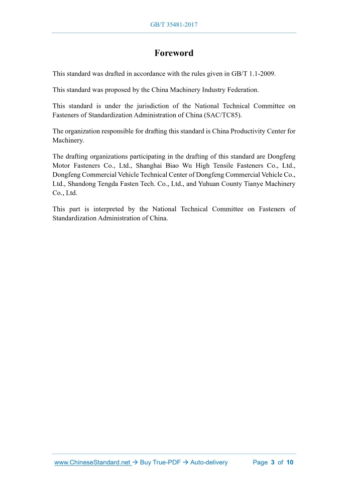 Similar standardsGB/T 35481-2017: Hexalobular bolts with flange---This is an excerpt. Full copy of true-PDF in English version (including equations, symbols, images, flow-chart, tables, and figures etc.), auto-downloaded/delivered in 9 seconds, can be purchased online: https://www.ChineseStandard.net/PDF.aspx/GBT35481-2017GB NATIONAL STANDARD OF THE PEOPLE'S REPUBLIC OF CHINA ICS 21.060.10 J 13 Hexalobular bolts with flange ISSUED ON: DECEMBER 29, 2017 IMPLEMENTED ON: APRIL 1, 2018 Issued by: General Administration of Quality Supervision, Inspection and Quarantine of PRC; Standardization Administration of PRC. Table of ContentsForeword ... 3 1 Scope ... 4 2 Normative references ... 4 3 Dimensions ... 5 4 Technical conditions and reference standards ... 10 5 Marking ... 10ForewordThis standard was drafted in accordance with the rules given in GB/T 1.1-2009. This standard was proposed by the China Machinery Industry Federation. This standard is under the jurisdiction of the National Technical Committee on Fasteners of Standardization Administration of China (SAC/TC85). The organization responsible for drafting this standard is China Productivity Center for Machinery. The drafting organizations participating in the drafting of this standard are Dongfeng Motor Fasteners Co., Ltd., Shanghai Biao Wu High Tensile Fasteners Co., Ltd., Dongfeng Commercial Vehicle Technical Center of Dongfeng Commercial Vehicle Co., Ltd., Shandong Tengda Fasten Tech. Co., Ltd., and Yuhuan County Tianye Machinery Co., Ltd. This part is interpreted by the National Technical Committee on Fasteners of Standardization Administration of China. Hexalobular bolts with flange1 ScopeThis standard specifies the types, dimensions, technical conditions and markings of hexalobular bolts with flange. This standard applies to hexalobular bolts with flange, with thread specifications of M5~M20, coarse thread and thread nominal diameter d=8 mm~20 mm, fine thread, performance grades of 8.8, 10.9, A2-70 and A4-70, and product grade A.2 Normative referencesThe following documents are essential for the application of this document. For any dated referenced document, only the dated version applies to this document. For any undated referenced document, the latest version (including all amendments) applies to this document. GB/T 2 Fasteners - Ends of parts with external thread GB/T 90.1 Fasteners - Acceptance inspection GB/T 90.2 Fasteners - Marking and packaging GB/T 193 General purpose metric screw threads - General plan GB/T 1237 Designation system for fasteners GB/T 3098.1 Mechanical properties of fasteners - Bolts, screws and studs GB/T 3098.6 Mechanical properties of fasteners - Stainless steel bolts, screws and studs GB/T 3103.1 Tolerances for fasteners - Bolts, screws, studs and nuts GB/T 5267.1 Fasteners - Electroplate coating GB/T 5267.2 Fasteners - Non-electrolytically applied zinc flake coatings GB/T 5267.4 Passivation of corrosion-resistant stainless-steel fasteners GB/T 5779.1 Fasteners - Surface discontinuities - Bolts, screws and studs for general requirements ......Source: Above contents are excerpted from the full-copy PDF -- translated/reviewed by: www.ChineseStandard.net / Wayne Zheng et al. Tips & Frequently Asked Questions:Question 1: How long will the true-PDF of English version of GB/T 35481-2017 be delivered?Answer: The full copy PDF of English version of GB/T 35481-2017 can be downloaded in 9 seconds, and it will also be emailed to you in 9 seconds (double mechanisms to ensure the delivery reliably), with PDF-invoice.Question 2: Can I share the purchased PDF of GB/T 35481-2017_English with my colleagues?Answer: Yes. The purchased PDF of GB/T 35481-2017_English will be deemed to be sold to your employer/organization who actually paid for it, including your colleagues and your employer's intranet.Question 3: Does the price include tax/VAT?Answer: Yes. Our tax invoice, downloaded/delivered in 9 seconds, includes all tax/VAT and complies with 100+ countries' tax regulations (tax exempted in 100+ countries) -- See Avoidance of Double Taxation Agreements (DTAs): List of DTAs signed between Singapore and 100+ countriesQuestion 4: Do you accept my currency other than USD?Answer: Yes. www.ChineseStandard.us -- GB/T 35481-2017 -- Click this link and select your country/currency to pay, the exact amount in your currency will be printed on the invoice. Full PDF will also be downloaded/emailed in 9 seconds.How to buy and download a true PDF of English version of GB/T 35481-2017?A step-by-step guide to download PDF of GB/T 35481-2017_EnglishStep 1: Visit website https://www.ChineseStandard.net (Pay in USD), or https://www.ChineseStandard.us (Pay in any currencies such as Euro, KRW, JPY, AUD).Step 2: Search keyword "GB/T 35481-2017". Step 3: Click "Add to Cart". If multiple PDFs are required, repeat steps 2 and 3 to add up to 12 PDFs to cart. Step 4: Select payment option (Via payment agents Stripe or PayPal). Step 5: Customize Tax Invoice -- Fill up your email etc. Step 6: Click "Checkout". Step 7: Make payment by credit card, PayPal, Google Pay etc. After the payment is completed and in 9 seconds, you will receive 2 emails attached with the purchased PDFs and PDF-invoice, respectively. Step 8: Optional -- Go to download PDF. Step 9: Optional -- Click Open/Download PDF to download PDFs and invoice. See screenshots for above steps: Steps 1~3 Steps 4~6 Step 7 Step 8 Step 9 |
