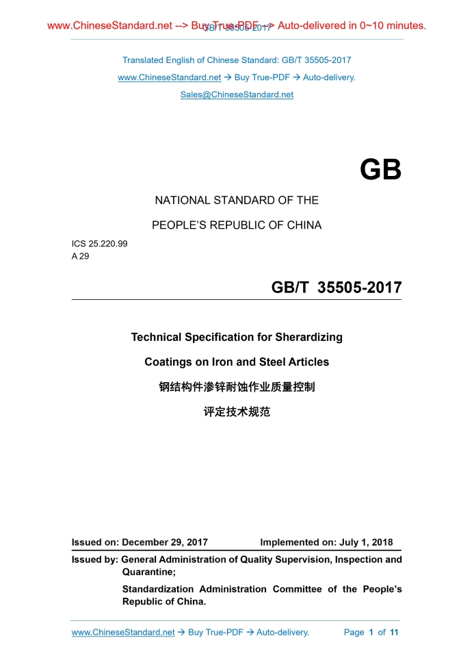 GB/T 35505-2017: Technical Specification for Sherardizing Coatings on Iron and Steel Articles Delivery: 9 seconds. True-PDF full-copy in English & invoice will be downloaded + auto-delivered via email. See step-by-step procedure Status: Valid