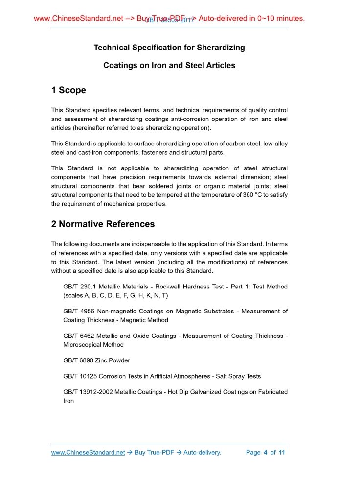 Similar standardsGB/T 35505-2017: Technical Specification for Sherardizing Coatings on Iron and Steel Articles---This is an excerpt. Full copy of true-PDF in English version (including equations, symbols, images, flow-chart, tables, and figures etc.), auto-downloaded/delivered in 9 seconds, can be purchased online: https://www.ChineseStandard.net/PDF.aspx/GBT35505-2017GB NATIONAL STANDARD OF THE PEOPLE’S REPUBLIC OF CHINA ICS 25.220.99 A 29 Technical Specification for Sherardizing Coatings on Iron and Steel Articles Issued on: DECEMBER 29, 2017 Implemented on: JULY 1, 2018 Issued by. General Administration of Quality Supervision, Inspection and Quarantine; Standardization Administration Committee of the People’s Republic of China. Table of ContentsForeword ... 3 1 Scope ... 4 2 Normative References ... 4 3 Terms and Definitions ... 5 4 Technical Requirements ... 5 5 Quality Control and Assessment Methods ... 9 Appendix A (informative appendix)... 11 Technical Specification for Sherardizing Coatings on Iron and Steel Articles1 ScopeThis Standard specifies relevant terms, and technical requirements of quality control and assessment of sherardizing coatings anti-corrosion operation of iron and steel articles (hereinafter referred to as sherardizing operation). This Standard is applicable to surface sherardizing operation of carbon steel, low-alloy steel and cast-iron components, fasteners and structural parts. This Standard is not applicable to sherardizing operation of steel structural components that have precision requirements towards external dimension; steel structural components that bear soldered joints or organic material joints; steel structural components that need to be tempered at the temperature of 360 °C to satisfy the requirement of mechanical properties.2 Normative ReferencesThe following documents are indispensable to the application of this Standard. In terms of references with a specified date, only versions with a specified date are applicable to this Standard. The latest version (including all the modifications) of references without a specified date is also applicable to this Standard. GB/T 230.1 Metallic Materials - Rockwell Hardness Test - Part 1. Test Method (scales A, B, C, D, E, F, G, H, K, N, T) GB/T 4956 Non-magnetic Coatings on Magnetic Substrates - Measurement of Coating Thickness - Magnetic Method GB/T 6462 Metallic and Oxide Coatings - Measurement of Coating Thickness - Microscopical Method GB/T 6890 Zinc Powder GB/T 10125 Corrosion Tests in Artificial Atmospheres - Salt Spray Tests GB/T 13912-2002 Metallic Coatings - Hot Dip Galvanized Coatings on Fabricated Iron3 Terms and DefinitionsThe following terms and definitions are applicable to this document. 3.1 Sherardizing Sherardizing is an anti-corrosion method that forms a zinc-iron alloy coating on the surface by rotating and heating up steel structural components, zinc powder, additives and activators in a sealed container. 3.2 Sherardized Coatings Sherardized coating refers to a zinc-iron alloy coating that is formed on the surface of steel structural components because of the mutual diffusion of zinc and iron atoms. 3.3 Sherardized Articles Sherardized article refers to steel structural components that are processed through sherardizing throughout the process. 3.4 Colored Seal Colored seal refers to the process of sealing sherardized coating on sherardized pieces with a colored material. 3.5 Colorless Seal Colorless seal refers to the process of sealing sherardized coating on sherardized pieces with a colorless or transparent material. 3.6 Sherardized Anti-corrosion Coatings Sherardized anti-corrosion coating is a compound anti-corrosion coating that is formed after sealing the sherardized coating.4 Technical Requirements4.1 Thickness Level of Sherardized Coatings In accordance with the requirements of adopting steel structural components under different environments, sherardized coatings can be divided into several thickness levels. Thickness level of sherardized coatings shall comply with the stipulation in Table 1 below. or eliminate reddish brown spots that are generated because of premature iron atom precipitation in sherardized coatings in accelerated corrosion test or application. 4.5 Performance of Sherardized Coatings 4.5.1 Appearance 4.5.1.1 There shall be no dust, excessive spot, delamination or stripping on the surface of the sherardized coatings; the appearance colors shall be uniform; there shall be no obvious chromatic aberration. 4.5.1.2 After sherardizing, fasteners shall have distinct and clean screw threads that will not affect the normal operation. 4.5.1.3 When sherardized articles’ defects (such as sand hole and slag inclusion, etc.) lead to partial non-sherardized coatings after sherardizing, it shall not be deemed as quality defect. 4.5.2 Thickness 4.5.2.1 Thickness of the sherardized coatings shall comply with the stipulation in Table 1. 4.5.2.2 The sherardized coatings shall be uniform; thickness deviation of the sherardized coatings of the same sherardized article shall not be > 10% of the average thickness of the sherardized coatings. 4.5.3 Hardness In terms of high-strength structural components, such as spring and high-strength fasteners, hardness test of base metal shall be conducted after sherardized. The result shall not be < the hardness of base metal before sherardizing. 4.5.4 Corrosion resistance Neutral salt spray corrosion time of different thickness levels of sherardized coatings shall comply with the stipulation in Table 3 below. Table 3 -- The Lowest Time Requirement of Red Rust Emerging after Neutral Salt Spray Test Thickness Level Red Rust Emerging Time/h ......Source: Above contents are excerpted from the full-copy PDF -- translated/reviewed by: www.ChineseStandard.net / Wayne Zheng et al. Tips & Frequently Asked Questions:Question 1: How long will the true-PDF of English version of GB/T 35505-2017 be delivered?Answer: The full copy PDF of English version