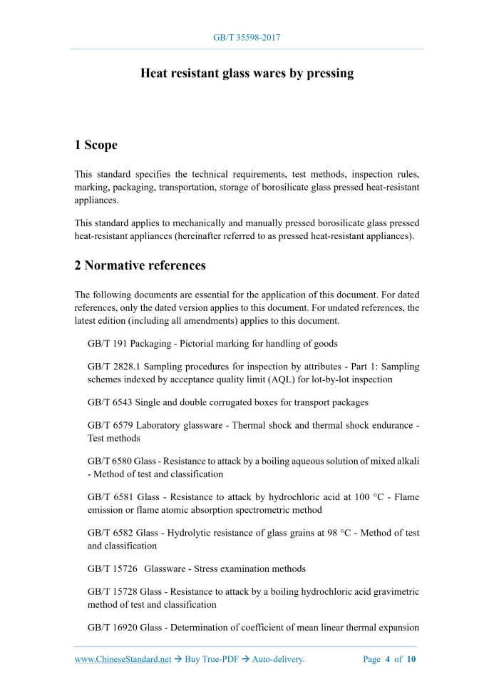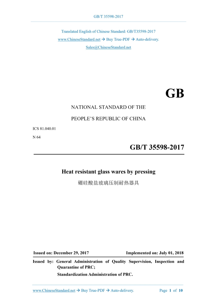 GB/T 35598-2017: Heat resistant glass wares by pressing Delivery: 9 seconds. True-PDF full-copy in English & invoice will be downloaded + auto-delivered via email. See step-by-step procedure Status: Obsolete GB/T 35598: Historical versions