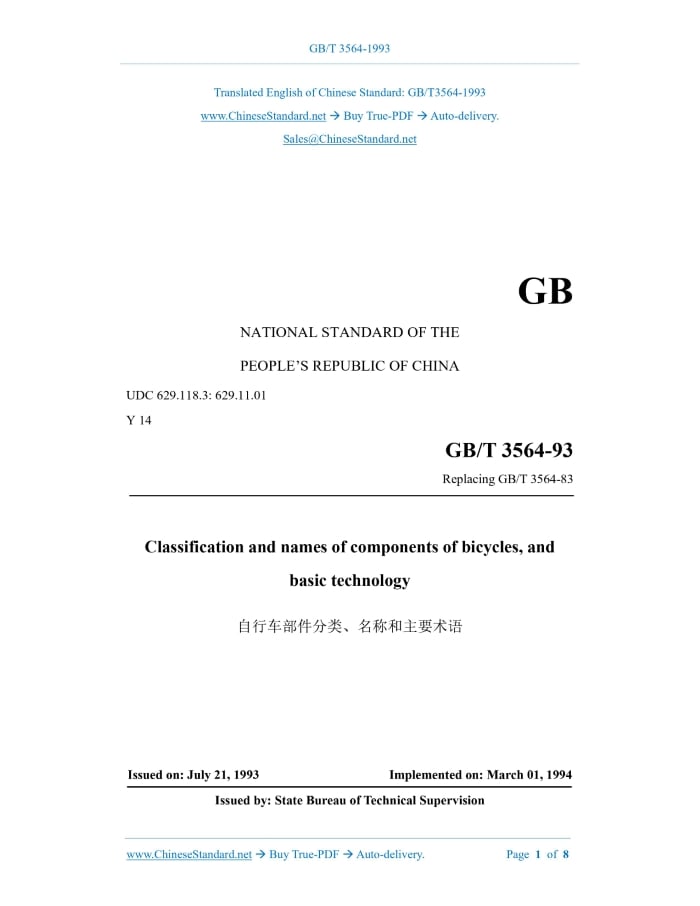 GB/T 3564-1993: Classification and names of components of bicycles, and basic technology Delivery: 9 seconds. True-PDF full-copy in English & invoice will be downloaded + auto-delivered via email. See step-by-step procedure Status: Obsolete GB/T 3564: Historical versions