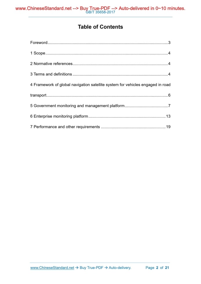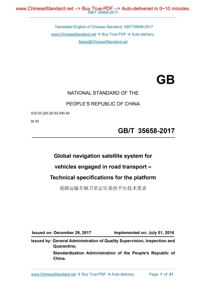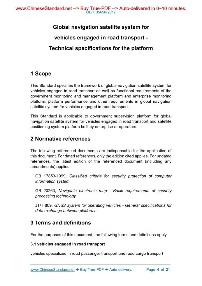 Similar standardsGB/T 35658-2017: Global navigation satellite system for vehicles engaged in road transport - Technical specifications for the platform---This is an excerpt. Full copy of true-PDF in English version (including equations, symbols, images, flow-chart, tables, and figures etc.), auto-downloaded/delivered in 9 seconds, can be purchased online: https://www.ChineseStandard.net/PDF.aspx/GBT35658-2017 Global navigation satellite system for vehicles engaged in road transport—Technical specifications for the platform GB/T 35658-2017 GB NATIONAL STANDARD OF THE PEOPLE’S REPUBLIC OF CHINA ICS 03.220.20;33.040.40 M 35 Global navigation satellite system for vehicles engaged in road transport – Technical specifications for the platform Issued on. December 29, 2017 Implemented on. July 01, 2018 Issued by. General Administration of Quality Supervision, Inspection and Quarantine; Standardization Administration of the People's Republic of China. Table of ContentsForeword ...3 1 Scope ...4 2 Normative references ...4 3 Terms and definitions ...4 4 Framework of global navigation satellite system for vehicles engaged in road transport ...6 5 Government monitoring and management platform ...7 6 Enterprise monitoring platform ...13 7 Performance and other requirements ...19 Global navigation satellite system for vehicles engaged in road transport - Technical specifications for the platform1 ScopeThis Standard specifies the framework of global navigation satellite system for vehicles engaged in road transport as well as functional requirements of the government monitoring and management platform and enterprise monitoring platform, platform performance and other requirements in global navigation satellite system for vehicles engaged in road transport. This Standard is applicable to government supervision platform for global navigation satellite system for vehicles engaged in road transport and satellite positioning system platform built by enterprise or operators.2 Normative referencesThe following referenced documents are indispensable for the application of this document.For dated references, only the edition cited applies.For undated references, the latest edition of the referenced document (including any amendments) applies. GB 17859-1999, Classified criteria for security protection of computer information system GB 20263, Navigable electronic map - Basic requirements of security processing technology JT/T 809, GNSS system for operating vehicles - General specifications for data exchange between platforms3 Terms and definitionsFor the purposes of this document, the following terms and definitions apply. 3.1 vehicles engaged in road transport vehicles specialized in road passenger transport and road cargo transport light, picture, and text. 5.1.5 Alarm management The government platform shall have the function of receiving the alarm information reported by the access platform and the corresponding alarm processing information.If the lower-level supervision platform or enterprise platform fails to report the alarm processing information within the agreed time, the supervision platform shall be able to send an alarm handling request command to it manually or automatically. 5.1.6 Basic data management Basic data management shall have the ability to query and manage basic information such as various vehicles, employees and transport companies that access to the platform. 5.1.7 Dangerous goods vehicle/ enterprise management 5.1.7.1 Dangerous goods vehicle management Dangerous goods vehicle management shall have query and statistics functions.The specific requirements are as follows. a) Query about dangerous goods vehicles, including query about online dangerous goods vehicle, query about previously online dangerous goods vehicle, query about cross-border dangerous goods vehicle, query about transported dangerous goods information, query about dangerous goods transport line and alarm situation query, etc.; b) Dangerous goods vehicle statistics, including statistics on online situation of dangerous goods vehicles, statistics on previously online situation of dangerous goods vehicles, statistics on the cross-domain of dangerous goods (between different regulatory platforms in different regions), statistics on the alarm situation of dangerous goods vehicles, and statistics on the distribution of dangerous goods vehicles. 5.1.7.2 Management of dangerous goods transport enterprise The management of dangerous goods transport enterprise shall have the functions of query, statistics and assessment.The specific requirements are as follows. a) Query about dangerous goods transport enterprise, including detailed information on dangerous goods transport enterprise; b) Statistics of dangerous goods transport enterprise, including statistics on the distribution of dangerous goods enterprise, statistics on online a) Tourist charter query, including query about online chartered vehicle, query about previously online situation of chartered vehicle, query about cross-domain chartered vehicle, query about nighttime illegal operation and alarm situation query, etc.; b) Tourist charter statistics, including statistics on the online status of tourist charter, statistics on the previously online status of tourist charter, statistics on the cross-domain of tourist charter (between different regulatory platforms in different regions), statistics on the alarming status of tourist charter and statistics on the distribution of tourist charter. 5.1.9.2 Tourist charter enterprise management Tourist charter enterprise management shall have query, statistics and assessment functions.The specific requirements are as follows. a) Tourist charter enterprise query, including query about tourist charter enterprise details and query about operating line of tourist charter; b) Tourist charter enterprise statistics, including statistics on distribution of tourist charter enterprise, statistics on online status of vehicles belonged to 