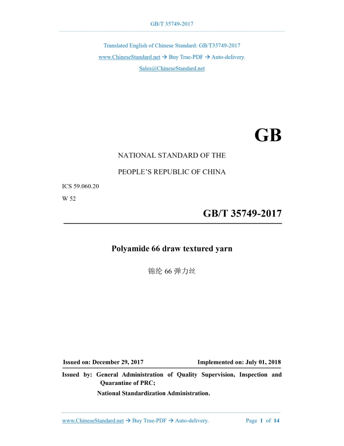 GB/T 35749-2017: Polyamide 66 draw textured yarn Delivery: 9 seconds. True-PDF full-copy in English & invoice will be downloaded + auto-delivered via email. See step-by-step procedure Status: Valid