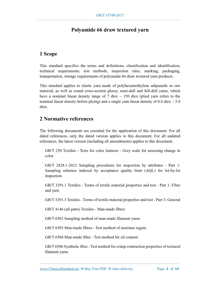 Similar standardsGB/T 35749-2017: Polyamide 66 draw textured yarn---This is an excerpt. Full copy of true-PDF in English version (including equations, symbols, images, flow-chart, tables, and figures etc.), auto-downloaded/delivered in 9 seconds, can be purchased online: https://www.ChineseStandard.net/PDF.aspx/GBT35749-2017GB NATIONAL STANDARD OF THE PEOPLE’S REPUBLIC OF CHINA ICS 59.060.20 W 52 Polyamide 66 draw textured yarn 锦纶 66弹力丝 Issued on: DECEMBER 29, 2017 Implemented on: JULY 01, 2018 Issued by. General Administration of Quality Supervision, Inspection and Quarantine of PRC; National Standardization Administration. Table of ContentsForeword... 3 1 Scope... 4 2 Normative references... 4 3 Terms and definitions... 5 4 Classification and identification... 5 5 Technical requirements... 5 6 Test methods... 7 7 Inspection rules... 8 8 Marking, packaging, transportation, storage... 10 Appendix A (Normative) Appearance requirements, inspection, evaluation... 12 Appendix B (Informative) Recommended method for rapid humidity conditioning of specimens... 14 Polyamide 66 draw textured yarn1 ScopeThis standard specifies the terms and definitions, classification and identification, technical requirements, test methods, inspection rules, marking, packaging, transportation, storage requirements of polyamide 66 draw textured yarn products. This standard applies to elastic yarn made of polyhexamethylene adipamide as raw material, as well as round cross-section glossy, semi-dull and full-dull yarns, which have a nominal linear density range of 7 dtex ~ 150 dtex (plied yarn refers to the nominal linear density before plying) and a single yarn linear density of 0.8 dtex ~ 5.0 dtex.2 Normative referencesThe following documents are essential for the application of this document. For all dated references, only the dated version applies to this document. For all undated references, the latest version (including all amendments) applies to this document. GB/T 250 Textiles - Tests for color fastness - Grey scale for assessing change in color GB/T 2828.1-2012 Sampling procedures for inspection by attributes - Part 1. Sampling schemes indexed by acceptance quality limit (AQL) for lot-by-lot inspection GB/T 3291.1 Textiles - Terms of textile material properties and test - Part 1.Fiber and yarn GB/T 3291.3 Textiles - Terms of textile material properties and test - Part 3.General GB/T 4146 (all parts) Textiles - Man-made fibres GB/T 6502 Sampling method of man-made filament yarns GB/T 6503 Man-made fibres - Test method of moisture regain GB/T 6504 Man-made fiber - Test method for oil content GB/T 6506 Synthetic fiber - Test method for crimp contraction properties of textured filament yarns GB/T 6529 Textiles - Standard atmospheres for conditioning and testing GB/T 8170 Rules of rounding off for numerical values and expression and judgement of limiting values GB/T 14343 Testing method for linear density of man-made filament yarns GB/T 14344 Man-made fiber - Test method for tensile properties of filament yarns FZ/T 50008 Test method for dyeing uniformity of polyamide filament yarns FZ/T 50001 Test method for interlacing degree of synthetic filament yarns FZ/T 51011 Fiber grade polyhexamethylene adipamide (PA66) chip3 Terms and definitionsThe terms and definitions as defined in GB/T 3291.1, GB/T 3291.3, GB/T 4146 (all parts), FZ/T 51011, apply to this document.4 Classification and identification4.1 According to the different TiO2 content, it can be divided into glossy yarn, semi- matte yarn, full-matte yarn. 4.2 Product specifications are identified by fiber thickness (TEX system, in dtex) and number of roots (number of spinneret holes, represented by f). Example 1.78 dtex/52f. Example 2.Ply yarn representation. 78 dtex/52f×2.5 Technical requirements5.1 Product classification Polyamide 66 draw textured yarn product are divided into three grades. superior, first- grade, qualified. Products lower than qualified are substandard. 5.2 Performance items and indicators Physical and mechanical properties and dyeing performance items and indicators are as shown in Table 1. 5.4 Appearance items and index values Negotiation between the supplier and the purchaser or implemented in accordance with the requirements of Appendix A.6 Test methods6.1 General 6.1.1 Pre-humidification, humidity conditioning standard atmosphere for testing 6.1.1.1 Pre-humidification 6.1.1.1.1 Pre-humidification is required when the sample meets one of the following conditions. - When the moisture regain of the specimen exceeds the official moisture regain; - The sample is in an atmosphere with a relative humidity higher than the upper limit of the relative humidity in the laboratory; - The sample temperature is 5 °C lower than the laboratory temperature. 6.1.1.1.2 The conditions for pre-humidification are. - Temperature not exceeding 50 °C; - Relative humidity 5% ~ 25%; - Time greater than 30 min. 6.1.1.2 Humidity conditioning and standard atmosphere for testing 6.1.1.2.1 The conditions for humidity conditioning are. - Temperature (20 ± 2) °C; - Relative humidity (65 ± 3)%; - Recommended humidity adjustment time 16 h. 6.1.1.2.2 Test conditions are. - Temperature (20 ± 2) °C; - Relative humidity (65 ± 3)%. 6.1.1.3 Others supplier and the buyer or according to the requirements specified in Appendix A. 7.1.2 Group-batching rules Periodic sampling is used to form inspection lots within a certain range. A production lot can be composed of one inspection lot or several inspection lots. 7.1.3 Sampling requirements 7.1.3.1 All appearance items and dyeing uniformity items are inspected. 7.1.3.2 Laboratory samples of physical performance items are subject to sampling inspection according to GB/T 6502.The appearance, tube weight, dyeing uniformity of the sampled laboratory samples shall meet the corresponding grades. 7.1.4 Judgment rules 7.1.4.1 The calculated values of each performance item are compared with the limit values of the perform