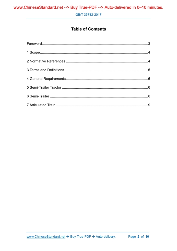 Similar standardsGB/T 35782-2017: Specification for Swap Trailer Transport of Road Vehicles---This is an excerpt. Full copy of true-PDF in English version (including equations, symbols, images, flow-chart, tables, and figures etc.), auto-downloaded/delivered in 9 seconds, can be purchased online: https://www.ChineseStandard.net/PDF.aspx/GBT35782-2017Specification for swap trailer transport of road vehicles GB/T 35782-2017 GB NATIONAL STANDARD OF THE PEOPLE’S REPUBLIC OF CHINA ICS 43.020; 43.080.10 T 70 Specification for Swap Trailer Transport of Road Vehicles Issued on. December 29, 2017 Implemented on. July 01, 2018 Issued by. General Administration of Quality Supervision, Inspection and Quarantine; Standardization Administration of PRC. Table of ContentsForeword ...3 1 Scope ...4 2 Normative References ...4 3 Terms and Definitions ...5 4 General Requirements ...6 5 Semi-Trailer Tractor ...6 6 Semi-Trailer ...8 7 Articulated Train ...9 Specification for Swap Trailer Transport of Road Vehicles1 ScopeThis Standard specifies the general requirements for the swap trailer transport of road vehicle, and the relevant requirements for semi-trailer tractor, semi-trailer, articulated train with maximum allowable total mass of 49t below. This Standard is applicable to the manufacture and use of the swap trailer transport of road vehicle.2 Normative ReferencesThe following documents are essential to the application of this document.For the dated documents, only the versions with the dates indicated are applicable to this document; for the undated documents, only the latest version (including all the amendments) are applicable to this document. GB 1589 Limits of Dimensions, Axle Load and Masses for Motor Vehicles, Trailers and Combination Vehicles GB/T 3730.1 Motor Vehicles and Trailers – Types - Terms and Definitions GB/T 3730.2 Road Vehicle – Masses - Vocabulary and Codes GB/T 3730.3 Motor Vehicles and Towed Vehicles - Dimensions of Vehicles - Terms and Definitions GB/T 4606 Road Vehicles - 50 Semi-Trailer Fifth Wheel Coupling Pin - Basic and Mounting/Interchangeability Dimensions GB/T 5053.1-2006 Road Vehicles - Connectors for the Electrical Connection of Towing and Towed Vehicles - 7-Pole Connector Type 24 N (Normal) for Vehicles with 24 V Nominal Supply Voltage GB/T 5922 Motor Vehicles and Towed Vehicles - Pressure Test Connection for Compressed - Air Pneumatic Braking Equipment GB 7258 Safety Specifications for Power-Driven Vehicles Operating on Roads GB 12676 Technical Requirements and Testing Methods for Commercial Vehicle and Trailer Braking Systems GB/T 13594 Antilock Braking Performance and Test Procedure for Motor Vehicles and Their Trailers GB/T 13880 Road Vehicles - Fifth Wheels – Interchangeability GB/T 13881 Braking Connections Between Motor Vehicles and Towed Vehicles GB/T 18505 Dynamic Balance Test Method for Motor Vehicle Tires GB 18565 Multiple Performance Requirement and Detecting Methods for Commercial Vehicles GB/T 20070 Road Vehicles - Mechanical Coupling Between Tractors and Semi- Trailers – Interchangeability GB/T 20716.1 Road Vehicles - Connectors for the Electrical Connection of Towing and Towed Vehicles - Part 1. Connectors for Braking Systems and Running Gears of Vehicles with 24V Nominal Supply Voltage GB/T 26777 Semitrailer Landing Gears GB/T 31879 Road Vehicles - General Technical Requirements for Fifth Wheel GB/T 32861 Road Vehicles – Location of Electrical and Pneumatic Connections Between Towing Vehicles and Trailers JT/T 475 Trailer Axle JT/T 794 GNSS System for Operating Vehicles - Technical Specification for Vehicle Terminals3 Terms and DefinitionsFor the purpose of this document, the terms and definitions given in GB/T 3730.1, GB/T 3730.2, GB/T 3730.3 and the following apply. 3.1 Swap trail transport of road The transport organization mode for the articulated car trains, according to the scheduled operation plan, drag down the trailers at the swap trail station; and then continue to run by replacing other trailers. 3.2 Front fitting radius of fifth wheels on semi-trailer tractor 7258 and GB 12676. 6.1.2 The fixed position of the air brake connector, electrical connector and anti-lock brake system connector on the front-end beam of the semi-trailer shall conform to the provisions of GB/T 32861. 6.1.3 The position for center of mass, load layout plan or corresponding technical documents of the semi-trailer shall be provided. 6.2 Size matching requirements 6.2.1 The front fitting radius of the semi-trailer (R2) shall be no greater than 2040mm (see Figure 2). 6.2.2 The gas radius of the semi-trailer shall be no less than 2300mm. 6.2.3 Under the no-load condition of the semi-trailer, the height of the traction pin seat plate from the ground shall be 1230mm~1250mm; high container transport semi-trailer shall be 1020mm~1040mm. 6.2.4 The horizontal distance from the center axis of the traction pin of the semi-trailer to the most rear end of the semi-trailer shall be no greater than 12000mm [except for the semi-trailer carrying 45ft (1ft=0.3048m) container]. 6.3 Other requirements 6.3.1 The semi-trailer shall adopt the 50# traction pin conforming to the provisions of GB/T 4606. 6.3.2 The semi-trailer shall adopt the 10t-level axles conforming to the provisions of JT/T 475. 6.3.3 The semi-trailer shall adopt the double linkage support device conforming to the provisions of GB/T 26777.7 Articulated Train7.1 The specific power of the articulated train (maximum net power of the engine/total mass of the car train) shall be no less than 5.4kW/t; the maximum speed of full load shall be no less than 100km/h. 7.2 The comprehensive fuel consumption of the articulated train at full load shall conform to the provisions of mandatory standard. 7.3 The longitudinal inclination angle, lateral inclination angle, articulation angle of the semi-trailer against the semi-trailer tractor, as well as the free space between the ......Source: Above contents are excerpted from the f