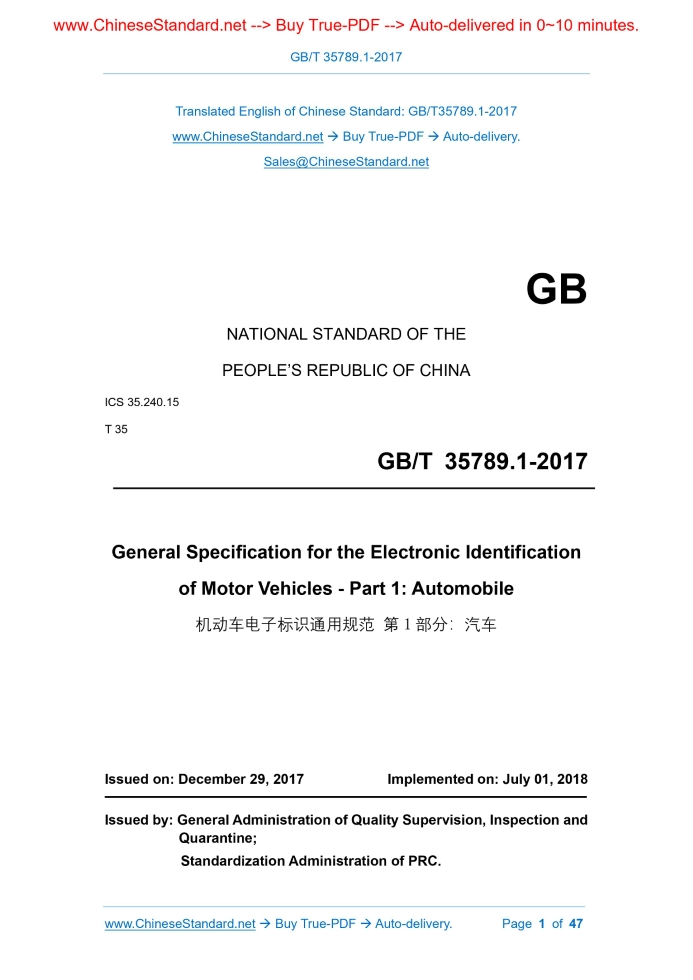 GB/T 35789.1-2017: General Specification for the Electronic Identification of Motor Vehicles - Part 1: Automobile Delivery: 9 seconds. True-PDF full-copy in English & invoice will be downloaded + auto-delivered via email. See step-by-step procedure Status: Valid