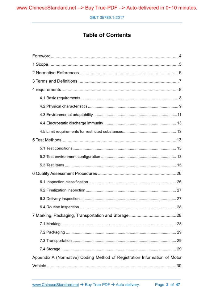Similar standardsGB/T 35789.1-2017: General Specification for the Electronic Identification of Motor Vehicles - Part 1: Automobile---This is an excerpt. Full copy of true-PDF in English version (including equations, symbols, images, flow-chart, tables, and figures etc.), auto-downloaded/delivered in 9 seconds, can be purchased online: https://www.ChineseStandard.net/PDF.aspx/GBT35789.1-2017 GB NATIONAL STANDARD OF THE PEOPLE’S REPUBLIC OF CHINA ICS 35.240.15 T 35 General Specification for the Electronic Identification of Motor Vehicles - Part 1: Automobile ISSUED ON: DECEMBER 29, 2017 IMPLEMENTED ON: JULY 01, 2018 Issued by: General Administration of Quality Supervision, Inspection and Quarantine; Standardization Administration of PRC. Table of ContentsForeword ... 4 1 Scope ... 5 2 Normative References ... 5 3 Terms and Definitions ... 7 4 requirements ... 8 4.1 Basic requirements ... 8 4.2 Physical characteristics ... 9 4.3 Environmental adaptability ... 11 4.4 Electrostatic discharge immunity ... 13 4.5 Limit requirements for restricted substances... 13 5 Test Methods ... 13 5.1 Test conditions ... 13 5.2 Test environment configuration ... 13 5.3 Test items ... 15 6 Quality Assessment Procedures ... 26 6.1 Inspection classification ... 26 6.2 Finalization inspection ... 27 6.3 Delivery inspection ... 27 6.4 Routine inspection ... 28 7 Marking, Packaging, Transportation and Storage ... 28 7.1 Marking ... 28 7.2 Packaging ... 29 7.3 Transportation ... 29 7.4 Storage ... 29 Appendix A (Normative) Coding Method of Registration Information of Motor Vehicle ... 30 Appendix B (Normative) Appearance and Structure ... 43 Appendix C (Informative) Design for Anti-Dismantling-Moving-Reuse ... 46 General Specification for the Electronic Identification of Motor Vehicles - Part 1: Automobile1 ScopeThis Part of GB/T 35789 specifies the requirements, test methods, quality assessment procedures, markings, packaging, transportation and storage of motor vehicle electronic identification based on UHF radio frequency identification technology installed on automobiles. This Part is applicable to the design, production, testing and use of motor vehicle electronic identification based on UHF radio frequency identification technology installed on automobiles.2 Normative ReferencesThe following documents are essential to the application of this document. For the dated documents, only the versions with the dates indicated are applicable to this document; for the undated documents, only the latest version (including all the amendments) are applicable to this document. GB/T 191 Packaging – Pictorial Marking for Handling of Goods GB/T 2423.1 Environmental Testing for Electric and Electronic and Electronic Products - Part 2: Test Methods - Tests A: Cold GB/T 2423.2 Environmental Testing for Electric and Electronic and Electronic Products - Part 2: Test Methods - Tests B: Dry Heat GB/T 2423.3 Environmental Testing for Electric and Electronic Products - Part 2: Testing Method Test Cab: Damp Heat Steady State GB/T 2423.5 Environmental Testing for Electric and Electronic and Electronic Products - Part 2: Test Methods – Test Ea and Guidance: Shock GB/T 2423.6 Environmental Testing for Electric and Electronic and Electronic Products - Part 2: Test Methods – Test Eb and Guidance: Bump GB/T 2423.10 Environmental Testing for Electric and Electronic and Electronic Products - Part 2: Test Methods – Test Fc: Vibration (Sinusoidal) GB/T 2423.17 Environmental Testing for Electric and Electronic and Electronic Products - Part 2: Test Methods – Test Ka: Salt Mist GB/T 2423.24 Environmental Testing - Part 2: Test Methods - Test Sa: Simulated Solar Radiation at Ground Level and Guidance for Solar Radiation Testing GB/T 2792-2014 Measurement of Peel Adhesion Properties for Adhesive Tapes GB/T 2828.1 Sampling Procedures for Inspection by Attribute - Part1: Sampling Schemes Indexed by Acceptance Quality Limit (AQL) for Lot-by-Lot Inspection GB/T 4857.5 Packaging - Transport Packages - Vertical Impact Test Method by Dropping GB 11643 Citizen Identification Number GB/T 14619 Alumina Ceramic Substrates for Thick Film Integrated Circuits GB/T 19951-2005 Road Vehicles - Test Methods for Electrical Disturbances from Electrostatic Discharge GB/T 26125 Electrical and Electronic Products - Determination of Six Regulated Substances (Lead, Mercury, Cadmium, Hexavalent Chromium, Polybrominated Biphenyls, Polybrominated Diphenyl Ethers) GB/T 26572 Requirements of Concentration Limits for Certain Restricted Substances in Electrical and Electronic Products GB/T 29768-2013 Information Technology - Radio Frequency Identification - Air Interface Protocol at 800/900 MHz GB/T 35102-2017 Information Technology - Radio Frequency Identification - Conformance Test Methods for Air Interface at 800/900 MHz GB/T 35786 General Specification for Read-Write Equipment of the Electronic Identification of Motor Vehicles GB/T 35790.1 Specification for Installation of the Electronic Identification of Motor Vehicles - Part1: Automobile GA/T 16.3-2012 Code for Management Information of Road Traffic - Part 3: Code of Motor Vehicle Use Nature GA/T 16.4-2012 Code for Management Information of Road Traffic - Part 4: Code of Motor Vehicle Type GA/T 16.7-2012 Code for Management Information of Road Traffic - Part 7: Code The maximum horizontal distance BETWEEN the geometric center of the antenna unit of the read-write device AND the geometric center of the motor vehicle electronic identifier, when the read-write device effectively writes the electronic vehicle identification.4 requirements4.1 Basic requirements 4.1.1 Air interface protocol The air interface protocol shall meet the requirements of GB/T 29768-2013, except for the "classification order" in Table 8. The working frequency is 920MHz~925MHz. 4.1.2 Read-write sensitivity The data read sensitivity is less than or equal to -17dBm; while the data write sensitivity is less than or equal to -14dBm. 4.1.3 Storage 