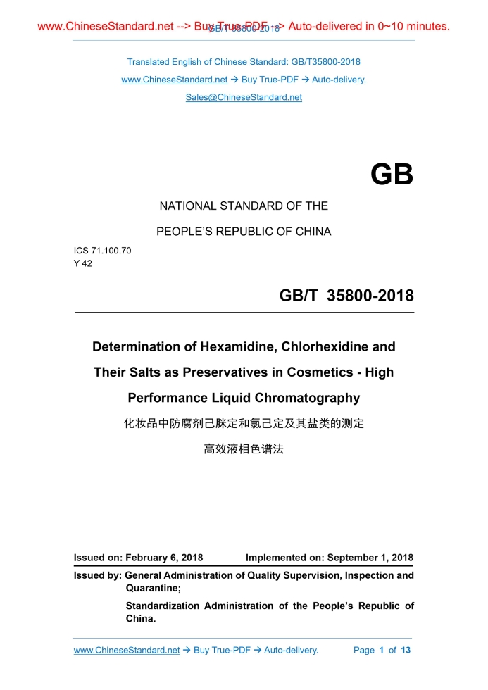GB/T 35800-2018: Determination of Hexamidine, Chlorhexidine and Their Salts as Preservatives in Cosmetics - High Performance Liquid Chromatography Delivery: 9 seconds. True-PDF full-copy in English & invoice will be downloaded + auto-delivered via email. See step-by-step procedure Status: Valid