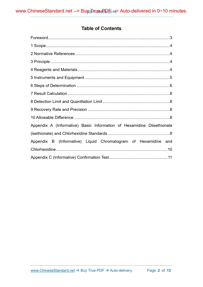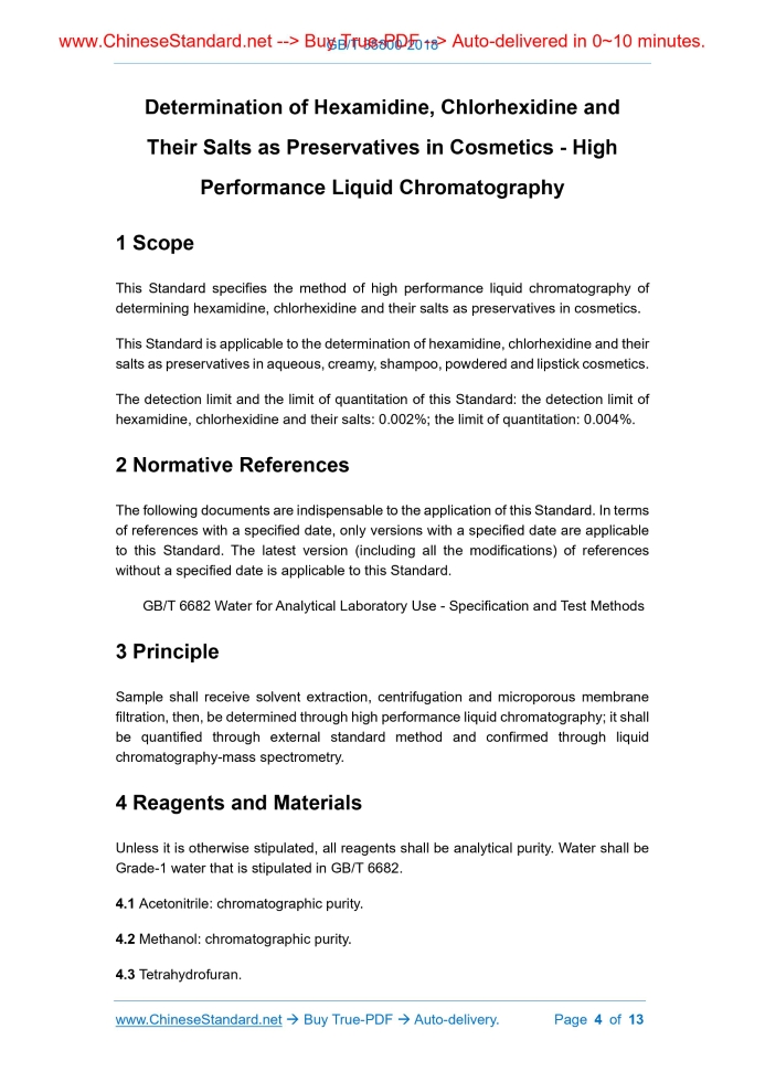 Similar standardsGB/T 35800-2018: Determination of Hexamidine, Chlorhexidine and Their Salts as Preservatives in Cosmetics - High Performance Liquid Chromatography---This is an excerpt. Full copy of true-PDF in English version (including equations, symbols, images, flow-chart, tables, and figures etc.), auto-downloaded/delivered in 9 seconds, can be purchased online: https://www.ChineseStandard.net/PDF.aspx/GBT35800-2018 GB NATIONAL STANDARD OF THE PEOPLE’S REPUBLIC OF CHINA ICS 71.100.70 Y 42 Determination of Hexamidine, Chlorhexidine and Their Salts as Preservatives in Cosmetics - High Performance Liquid Chromatography Issued on: FEBRUARY 6, 2018 Implemented on: SEPTEMBER 1, 2018 Issued by. General Administration of Quality Supervision, Inspection and Quarantine; Standardization Administration of the People’s Republic of China. Table of ContentsForeword ... 3 1 Scope ... 4 2 Normative References ... 4 3 Principle ... 4 4 Reagents and Materials ... 4 5 Instruments and Equipment ... 5 6 Steps of Determination ... 6 7 Result Calculation ... 8 8 Detection Limit and Quantitation Limit ... 8 9 Recovery Rate and Precision ... 8 10 Allowable Difference ... 8 Appendix A (Informative) Basic Information of Hexamidine Diisethionate (isethionate) and Chlorhexidine Standards ... 9 Appendix B (Informative) Liquid Chromatogram of Hexamidine and Chlorhexidine ... 10 Appendix C (Informative) Confirmation Test... 11 Determination of Hexamidine, Chlorhexidine and Their Salts as Preservatives in Cosmetics - High Performance Liquid Chromatography1 ScopeThis Standard specifies the method of high performance liquid chromatography of determining hexamidine, chlorhexidine and their salts as preservatives in cosmetics. This Standard is applicable to the determination of hexamidine, chlorhexidine and their salts as preservatives in aqueous, creamy, shampoo, powdered and lipstick cosmetics. The detection limit and the limit of quantitation of this Standard. the detection limit of hexamidine, chlorhexidine and their salts. 0.002%; the limit of quantitation. 0.004%.2 Normative ReferencesThe following documents are indispensable to the application of this Standard. In terms of references with a specified date, only versions with a specified date are applicable to this Standard. The latest version (including all the modifications) of references without a specified date is applicable to this Standard. GB/T 6682 Water for Analytical Laboratory Use - Specification and Test Methods3 PrincipleSample shall receive solvent extraction, centrifugation and microporous membrane filtration, then, be determined through high performance liquid chromatography; it shall be quantified through external standard method and confirmed through liquid chromatography-mass spectrometry.4 Reagents and MaterialsUnless it is otherwise stipulated, all reagents shall be analytical purity. Water shall be Grade-1 water that is stipulated in GB/T 6682. 4.1 Acetonitrile. chromatographic purity. 4.2 Methanol. chromatographic purity. 4.3 Tetrahydrofuran.6 Steps of Determination6.1 Sample Processing 6.1.1 Aqueous, creamy, shampoo and powdered sample Weigh-take 0.5 g (accurate to 0.001 g) of sample, place it into a 50 mL PTFE centrifuge tube with a plug (5.7); add 1 mL of saturated sodium chloride solution (4.6), then, start vortex mixing. Add 9 mL of water; after vortex mixing, start centrifugation at 5,000 r/min for 10 min. Transfer the supernatant into another 50 mL PTFE centrifuge tube with a plug. In the sample residue, continue to add 10 mL of methanol (4.2); in ultrasonic water bath (5.3), start ultrasonic extraction for 20 min. Start centrifugation at 5,000 r/min for 10 min; combine the supernatant, then, filter it through 0.45 μm microporous membrane (5.8) for the determination with high performance liquid chromatography. 6.1.2 Creamy sample Weigh-take 0.5 g (accurate to 0.001 g) of sample, place it into a 50 mL PTFE centrifuge tube with a plug (5.7); add 2 mL of tetrahydrofuran (4.3), start vortex mixing. Add 8 mL of water; after vortex mixing, start centrifugation at 5,000 r/min for 10 min. Transfer the supernatant into another 50 mL PTFE centrifuge tube with a plug. In the sample residue, continue to add 10 mL of methanol (4.2); in ultrasonic water bath (5.3), start ultrasonic extraction for 20 min. Start centrifugation at 5,000 r/min for 10 min; combine the supernatant, then, filter it through 0.45 μm microporous membrane (5.8) for the determination with high performance liquid chromatography. 6.2 Conditions of Determination The determination with high performance liquid chromatography shall be based on the following reference conditions. a) Chromatographic column. XTerra MS C18, 5 μm, 250 mm x 4.6 mm (internal diameter), or others with equivalent performance; b) Mobile phase. please refer to Table 1; c) Flow rate. 1.0 mL/min; d) Column temperature. 30 °C; e) Detection wavelength. 260 nm; f) Injection volume. 10 μL. 6.5 Blank Test Follow the above determination conditions and steps, other than the step of weighing- taking sample.7 Result CalculationThe result shall be calculated in accordance with Formula (1). The calculation result shall retain 2 decimals (the calculation result shall deduct the blank value). Where, W---the percentage content of hexamidine, chlorhexidine and their salts in the sample, expressed in %; c---the concentration of hexamidine and chlorhexidine in the sample, which is obtained through the standard working curve, expressed in (μg/mL); V---the ultimate constant volume of the sample solution, expressed in (mL); m---sample mass, expressed in (g).8 Detection Limit and Quantitation LimitThe detection limit of hexamidine, chlorhexidine and their salts shall be 0.002%; the quantitation limit shall be 0.004%.9 Recovery Rate and PrecisionWithin the concentration range of 0.004% ~ 0.3 %, the recovery rate of hexamidine, chlorhexidine and their salts shall be between 84.1% ~ 99.7%, the relative standard deviation shal