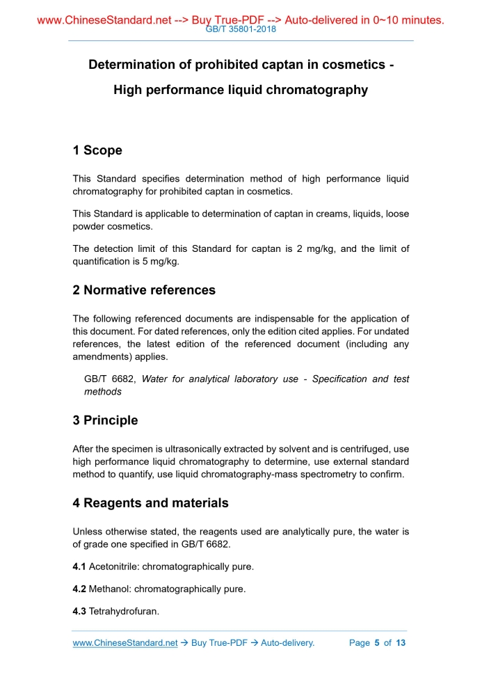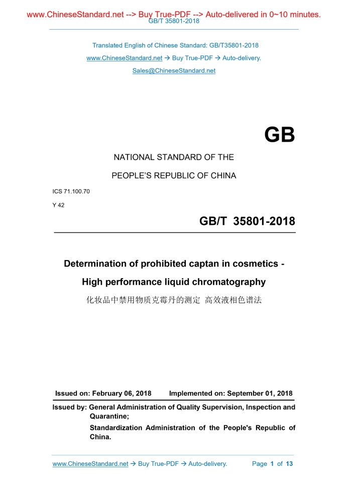 GB/T 35801-2018: Determination of prohibited captan in cosmetics - High performance liquid chromatography Delivery: 9 seconds. True-PDF full-copy in English & invoice will be downloaded + auto-delivered via email. See step-by-step procedure Status: Valid