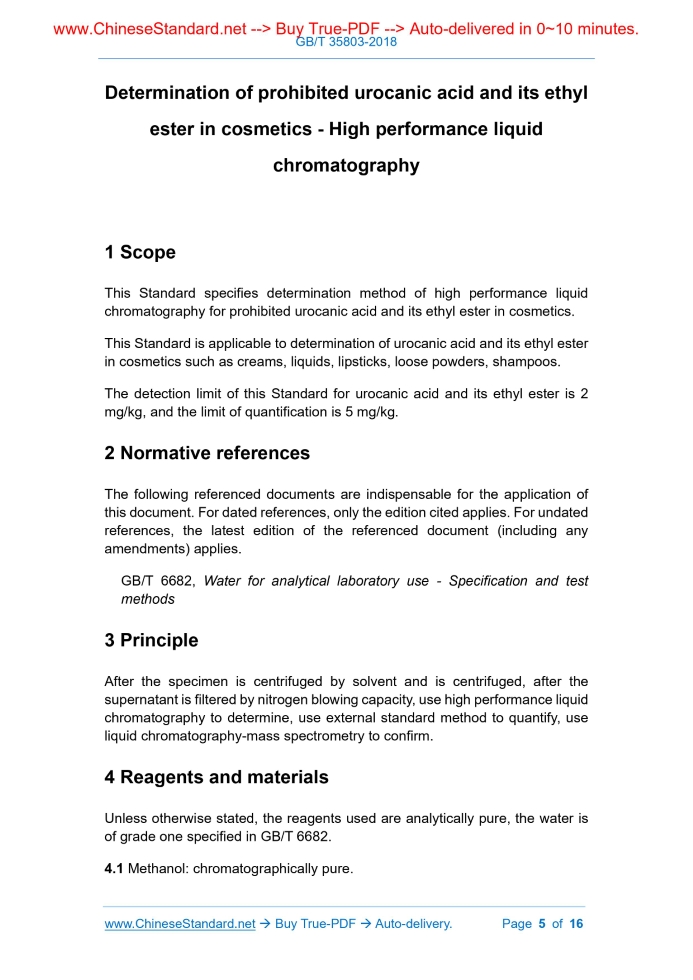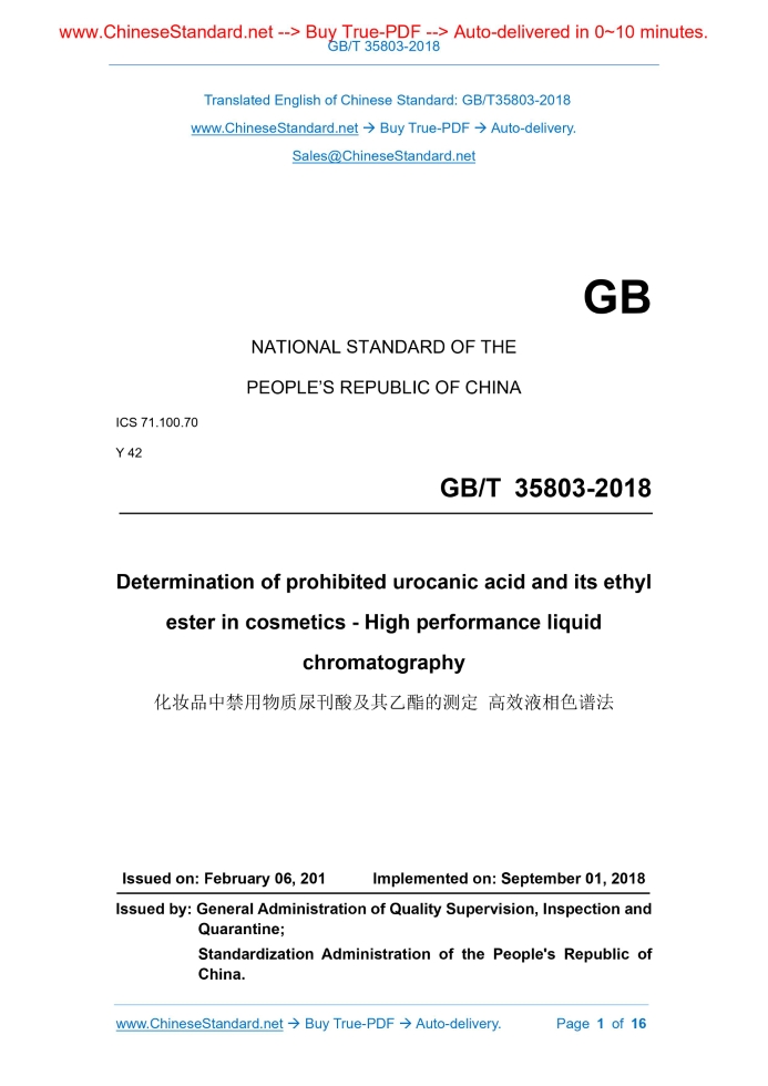 GB/T 35803-2018: Determination of prohibited urocanic acid and its ethyl ester in cosmetics - High performance liquid chromatography Delivery: 9 seconds. True-PDF full-copy in English & invoice will be downloaded + auto-delivered via email. See step-by-step procedure Status: Valid