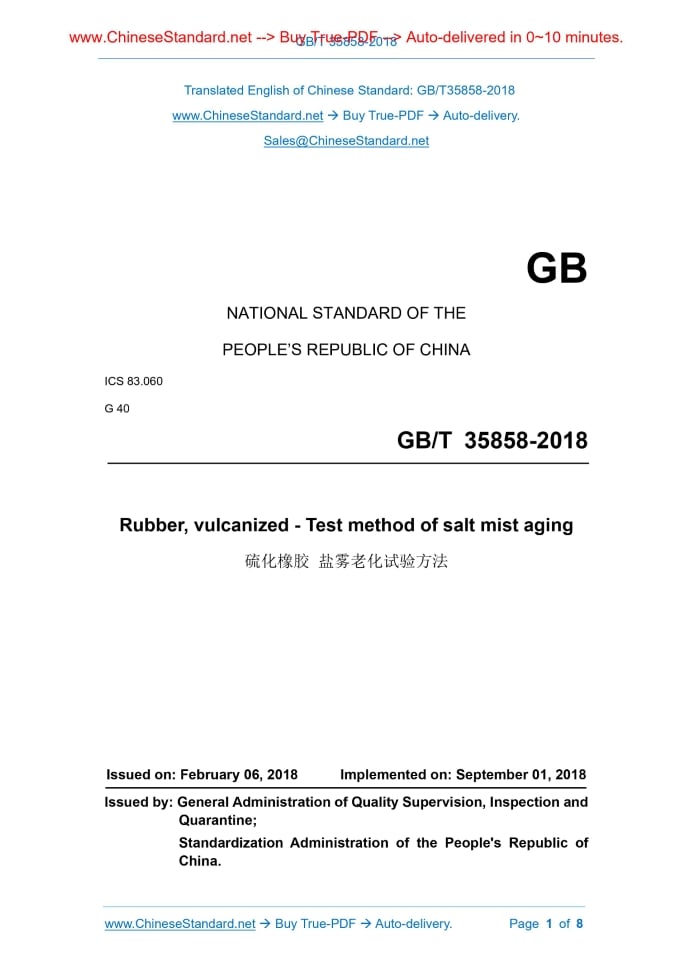 GB/T 35858-2018: Rubber, vulcanized -- Test method of salt mist aging Delivery: 9 seconds. True-PDF full-copy in English & invoice will be downloaded + auto-delivered via email. See step-by-step procedure Status: Valid